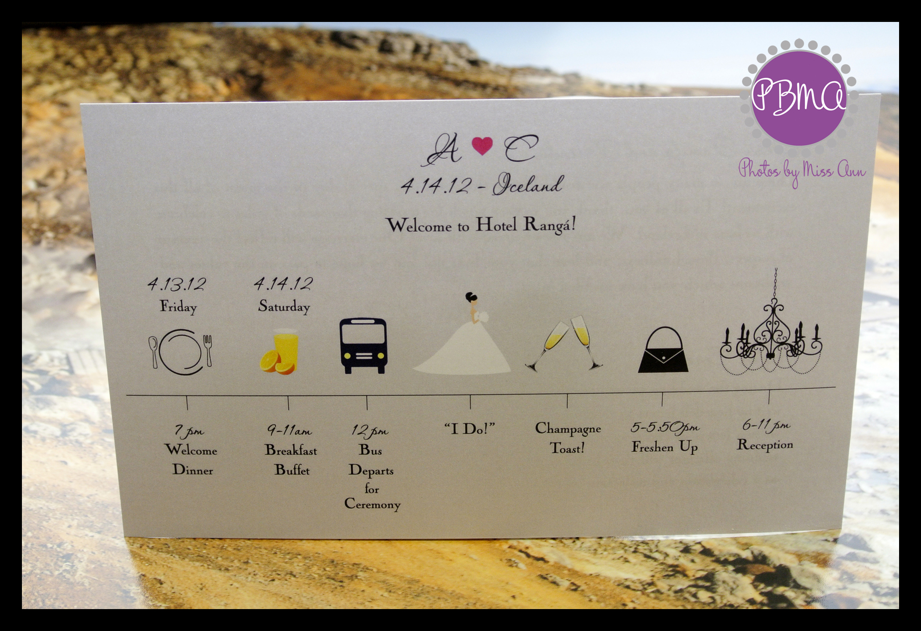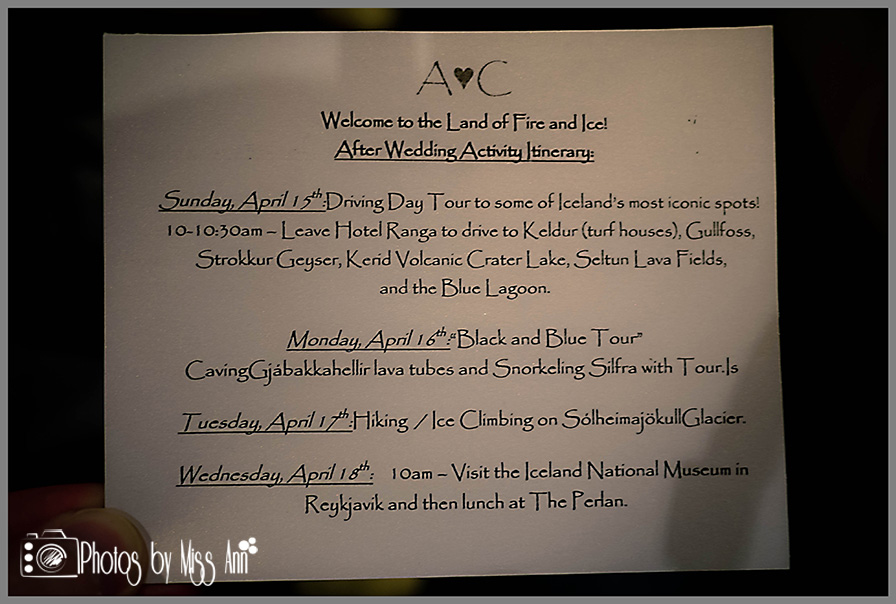 Guests were given Iceland wedding welcome bags and wedding timeline cards after their 3 course welcome dinner meal.