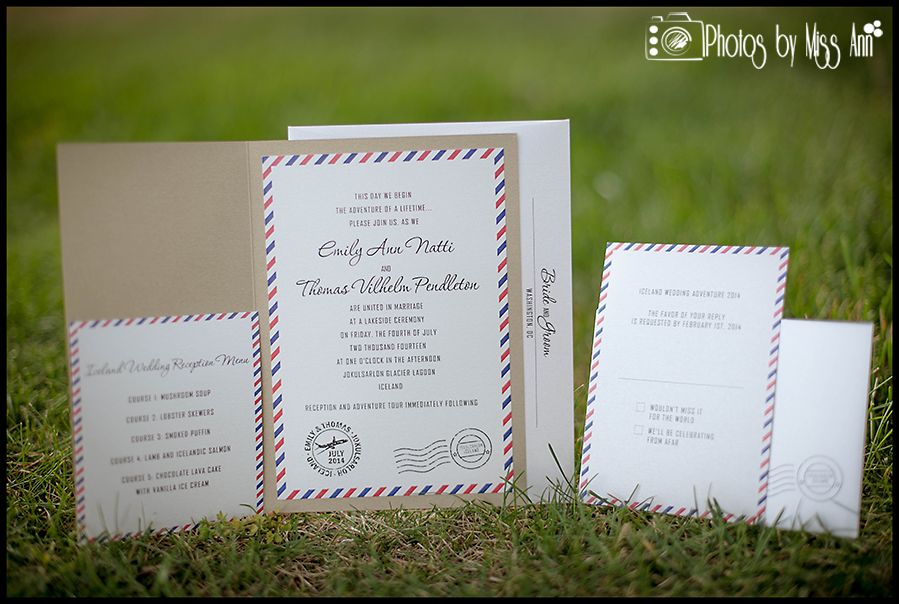 Speaking from example, this is the section that our invitation fell into for our Iceland wedding at Seljalandsfoss waterfall. We had wanted our invitations to be a fabulous visual to put in front of our guests but one that would still stay in line with our budget of $6-8 per wedding invitation (including postage). Our Iceland Wedding Invitation Story: Everyone thought for sure since Chris and I have been in the wedding industry for so long we would choose a winter wedding date in an exotic locale. A location that would be surely be international, beach-side or up in the mountains of somewhere with an epic view. But we wanted something completely opposite of what we have photographed when we personally said our “I do’s.” <Enter in from right stage Iceland, Greenland, or Sweden’s Ice Hotel, please!> When we were narrowing down destinations we knew a cold weather locale would be more “us” but would be a really hard sell for our guest list of 90. Especially since most of them would want to escape the North American winter weather in April! Keeping that in challenge in mind, we started to design a 4 part package for our Iceland wedding invitations. We in the end, decided on the following inclusions: