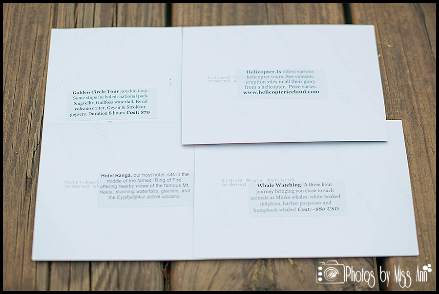 - The last thing we included were Iceland scenery photos we felt would attract our guests to come (volcanoes, whale watching, the Northern Lights, natural water wonders, etc.) all tied together by sweet little sage and brown ribbon. On the back of each one there were details on the trip (IE, what it was, location, duration, and cost for the adventure) to give our guests an easy understanding of the incredible adventure that awaited them!