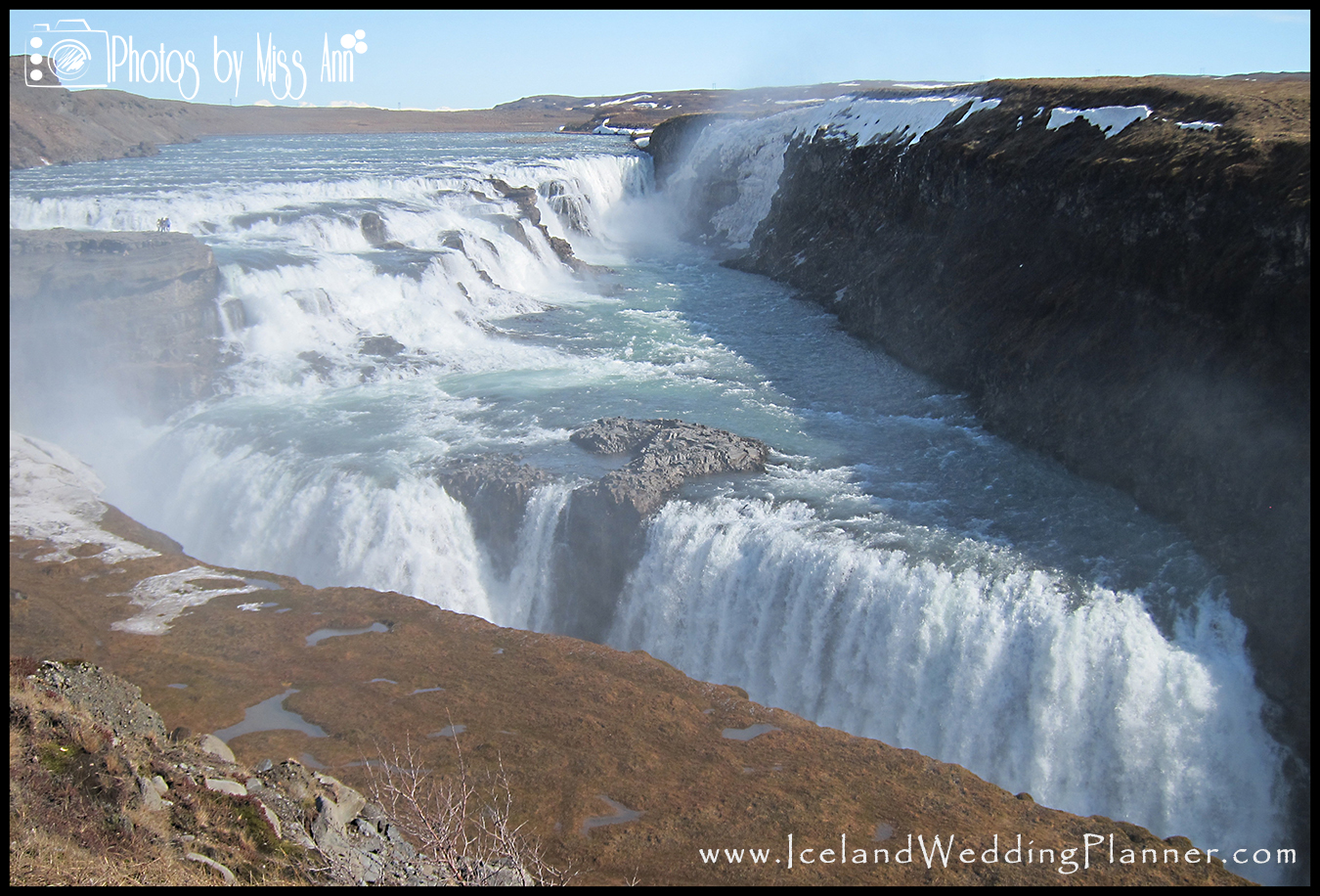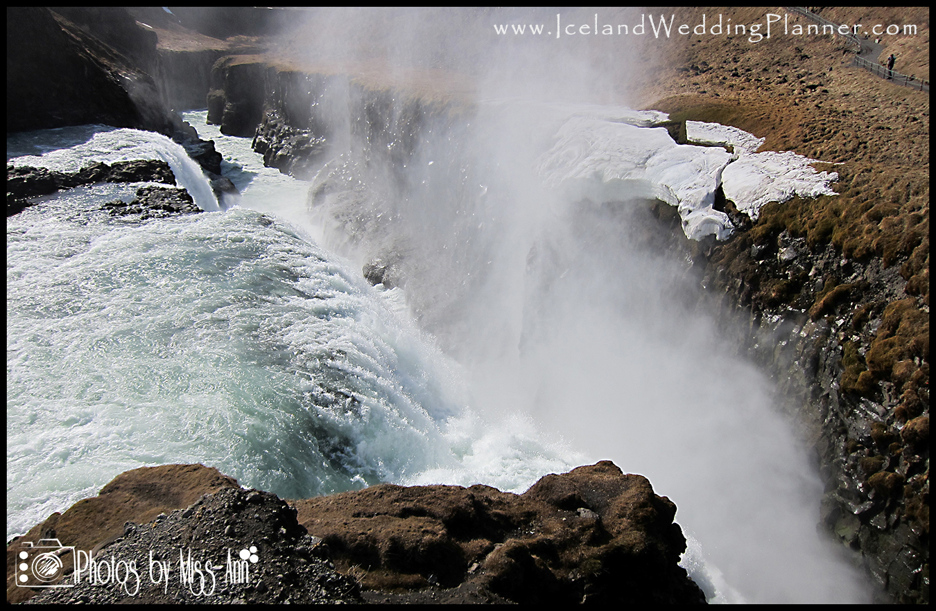 This was actually our first stop on our post wedding itinerary we planned for our Iceland wedding guests in April of 2012. I remember getting out of the car, hearing the waterfall roar, leaving my husband behind and racing down to it because I was so eager to see it! It’s truly striking even from the parking lot. A short walk (less than 1/4 mile) down to a viewing point will yield gorgeous views directly into the side of the falls, the steep drop below, and the canyon walls that house the waterfall’s flow. There is also a higher level viewing point in which you can take stairs up to a boardwalk and walk out to view the waterfalls top. It is possible to hold your wedding ceremony here and stop to have your Iceland wedding photos taken here but it is less intimate due to the larger volume of tourists visiting (because of the proximity to Reykjavik). The Gullfoss GPS coordinates are: 64°19?34?N / 20°07?16?W. Imagine having romantic Iceland couples portraits or Iceland engagement photos taken here… I swoon just thinking about it!
