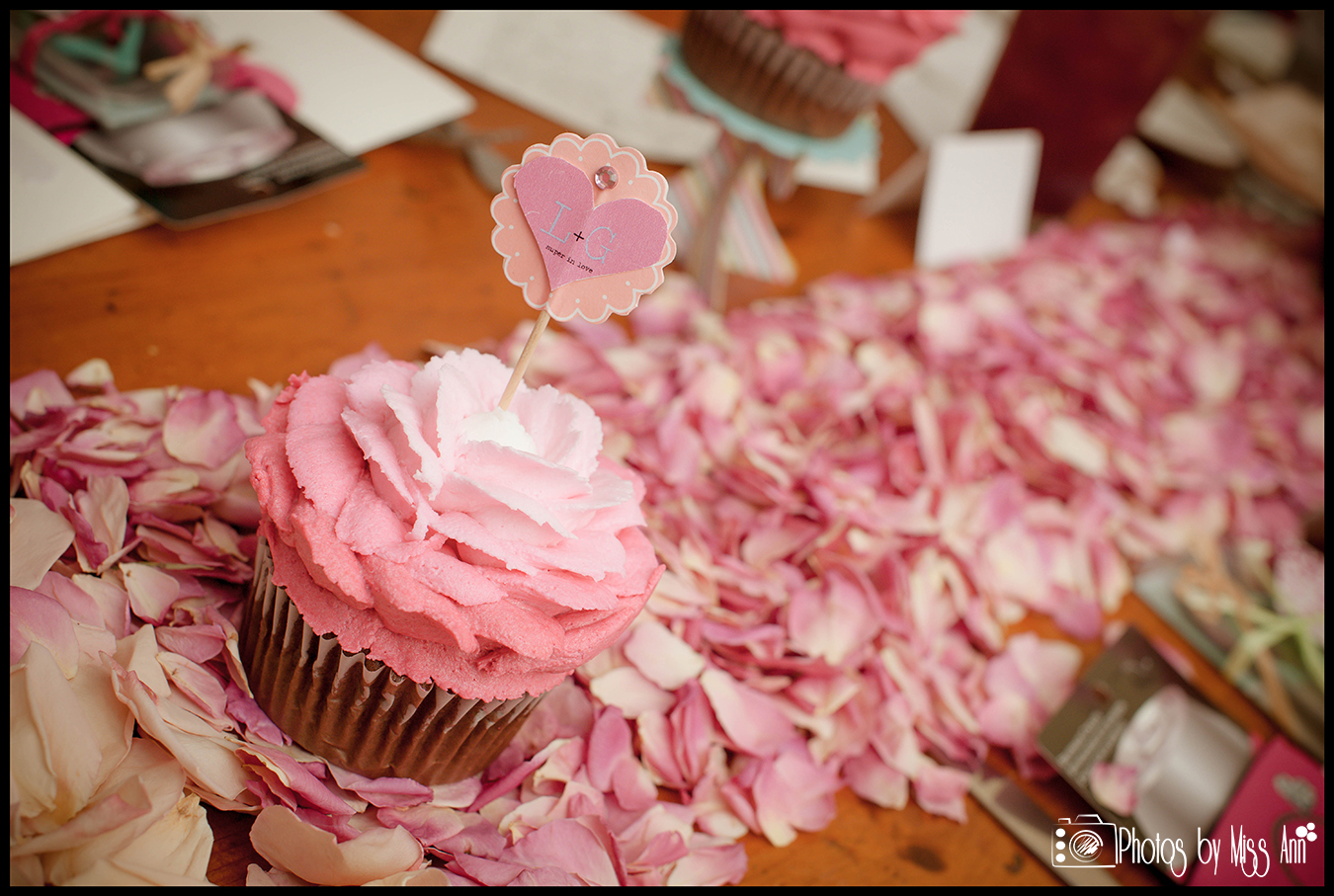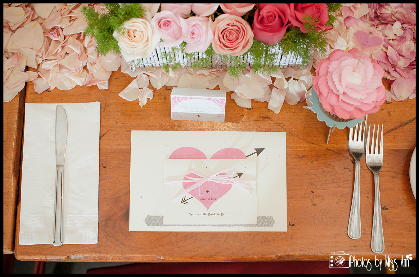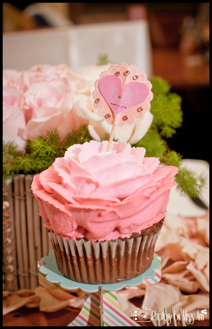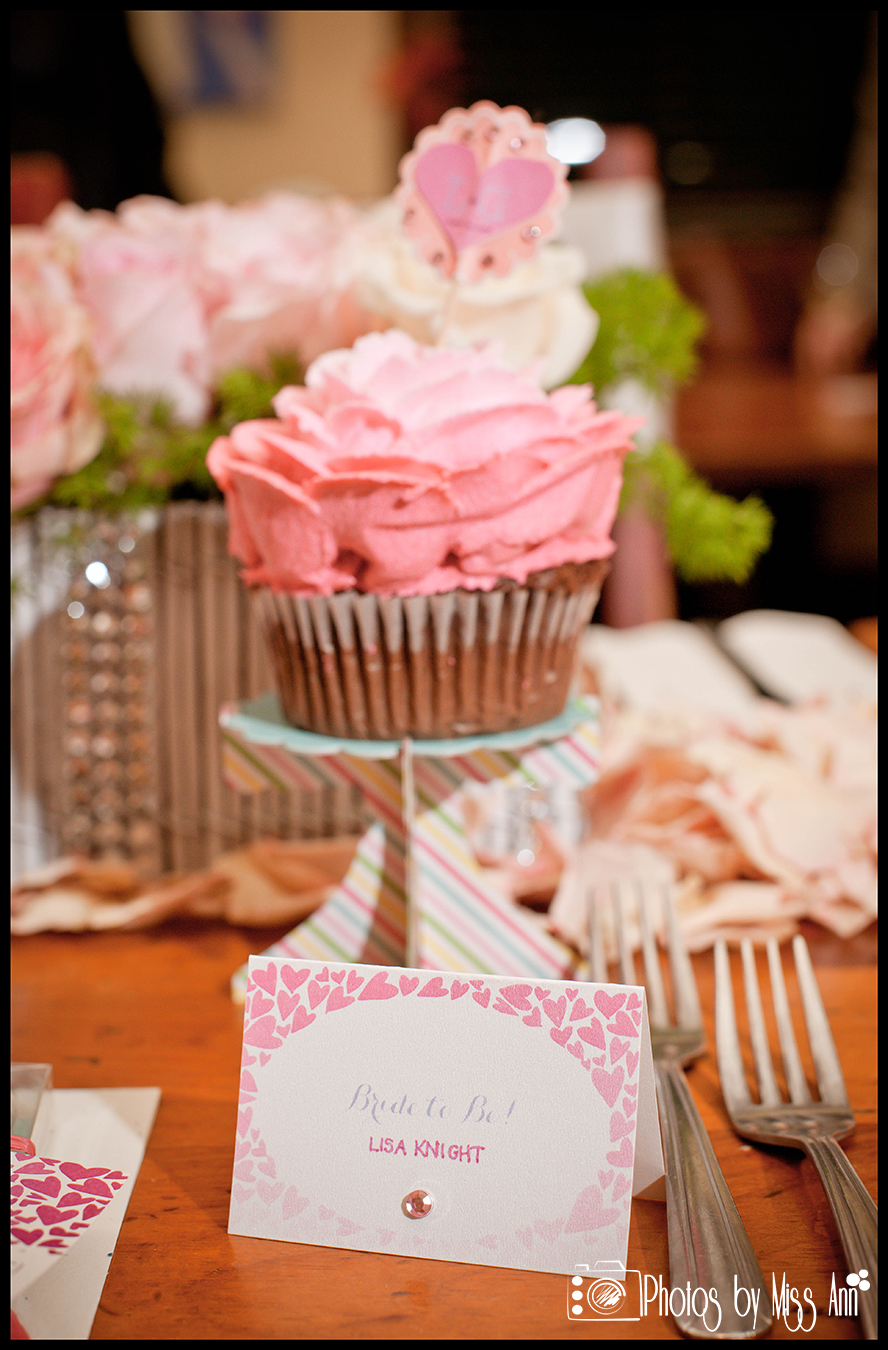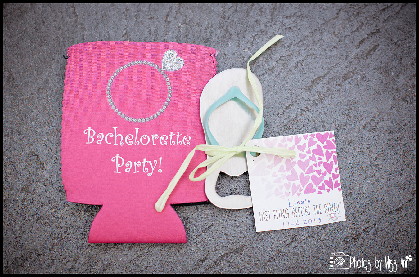 Heightening the theme, I had delicious rose chocolate cupcakes made and placed at each place setting on an individual cupcake stands. Sitting on top of the cupcakes were handmade jeweled heart banners that had “L + G: Super in Love” printed. Several other stationary items were at each place setting as well such as matching pink jeweled place cards, favor tags, a “Words to the Bride” card, and a “20 Questions” game sheet all having the same similar emblems. The party favors for each of the bachelorettes were flip flop bottle openers and pink “Bachelorette Party” coozie’s. Which in the end, were pretty simple but held meaning by incorporating the tropical destination wedding location of the bride and groom.