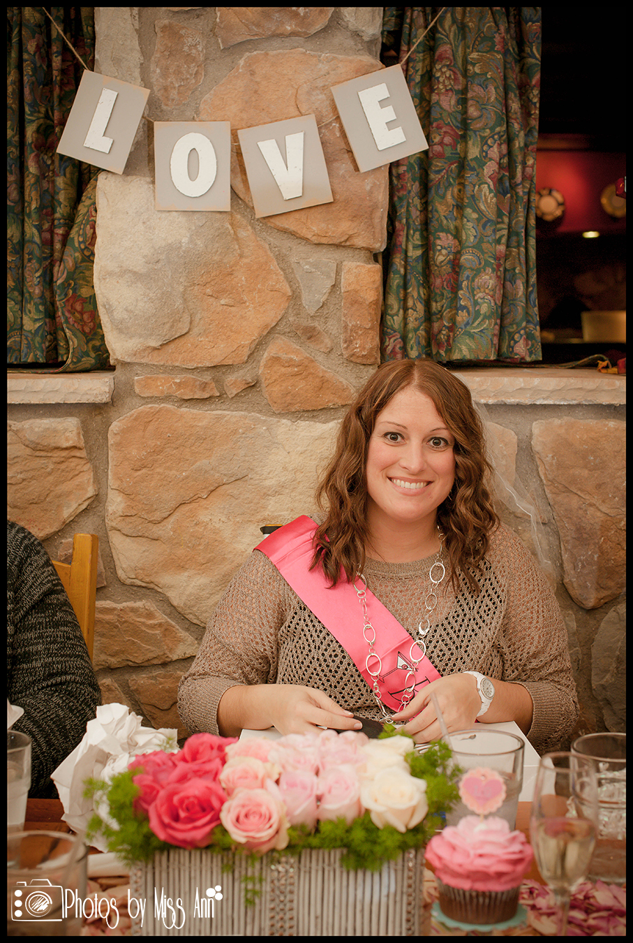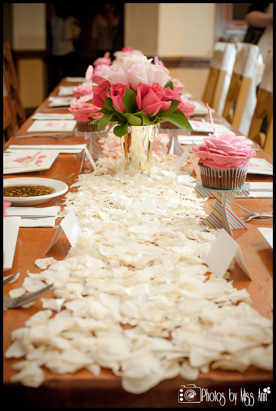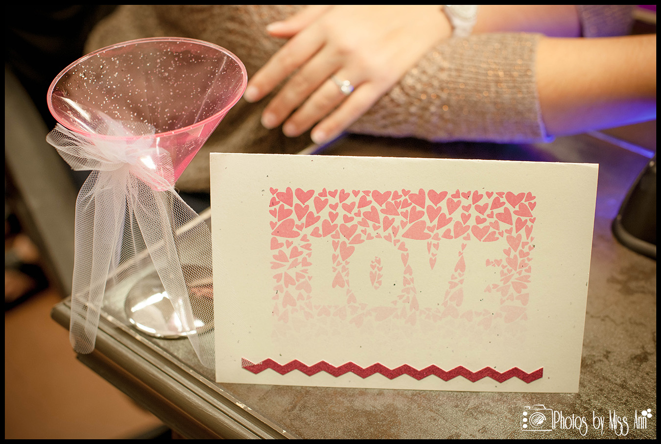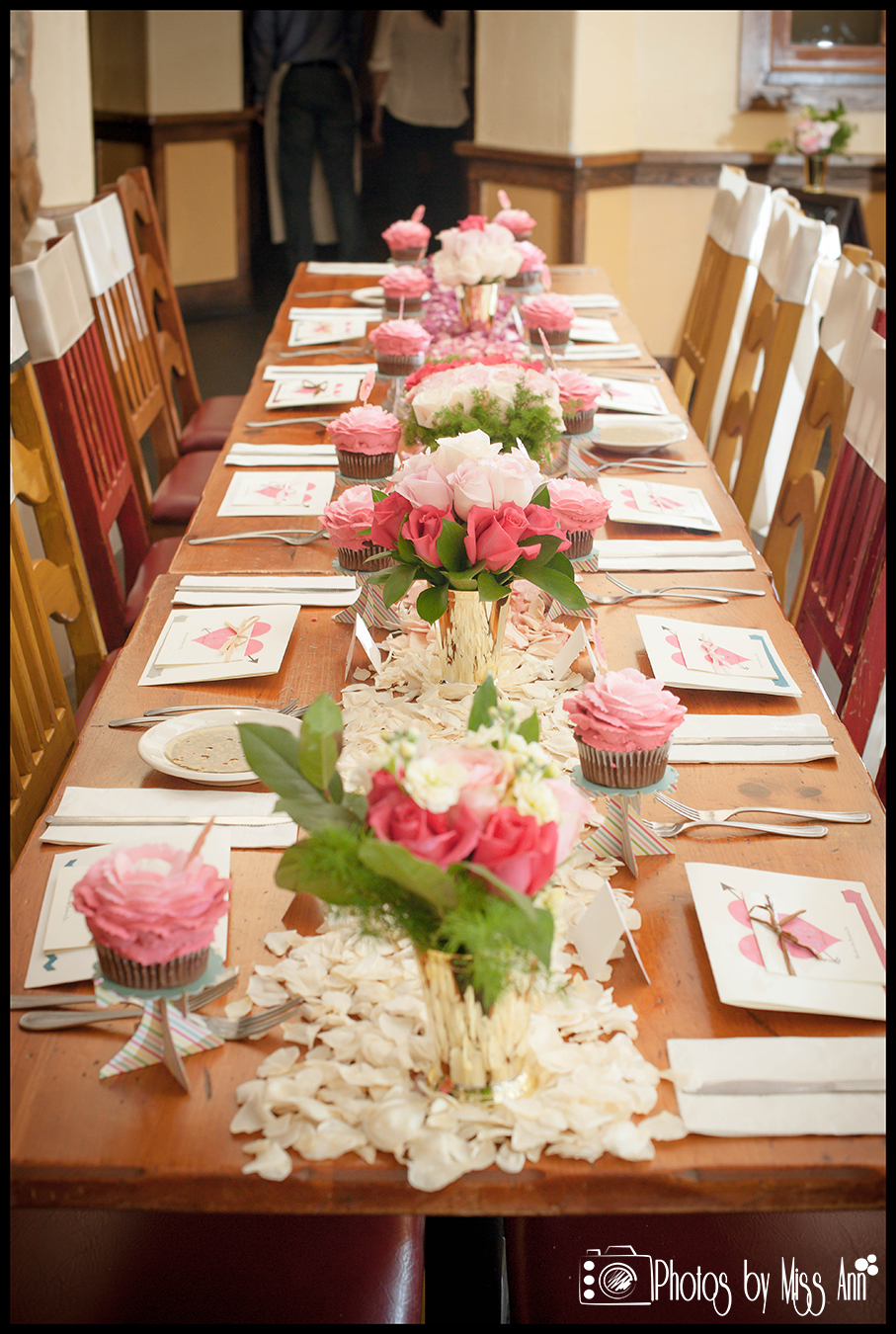 Heightening the theme, I had delicious rose chocolate cupcakes made and placed at each place setting on an individual cupcake stands. Sitting on top of the cupcakes were handmade jeweled heart banners that had “L + G: Super in Love” printed. Several other stationary items were at each place setting as well such as matching pink jeweled place cards, favor tags, a “Words to the Bride” card, and a “20 Questions” game sheet all having the same similar emblems. The party favors for each of the bachelorettes were flip flop bottle openers and pink “Bachelorette Party” coozie’s. Which in the end, were pretty simple but held meaning by incorporating the tropical destination wedding location of the bride and groom.