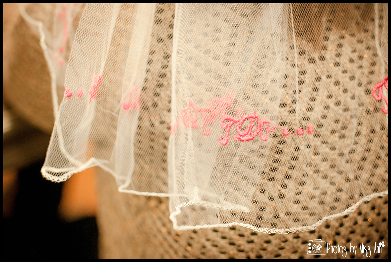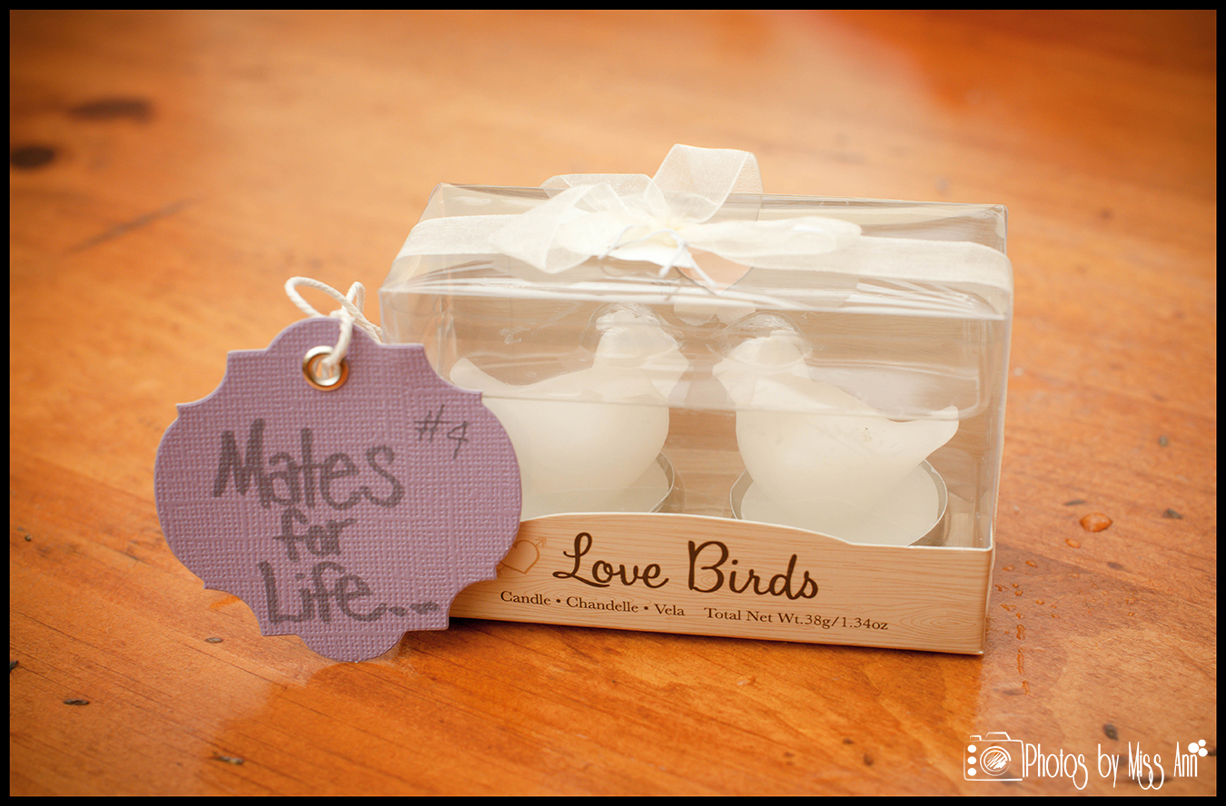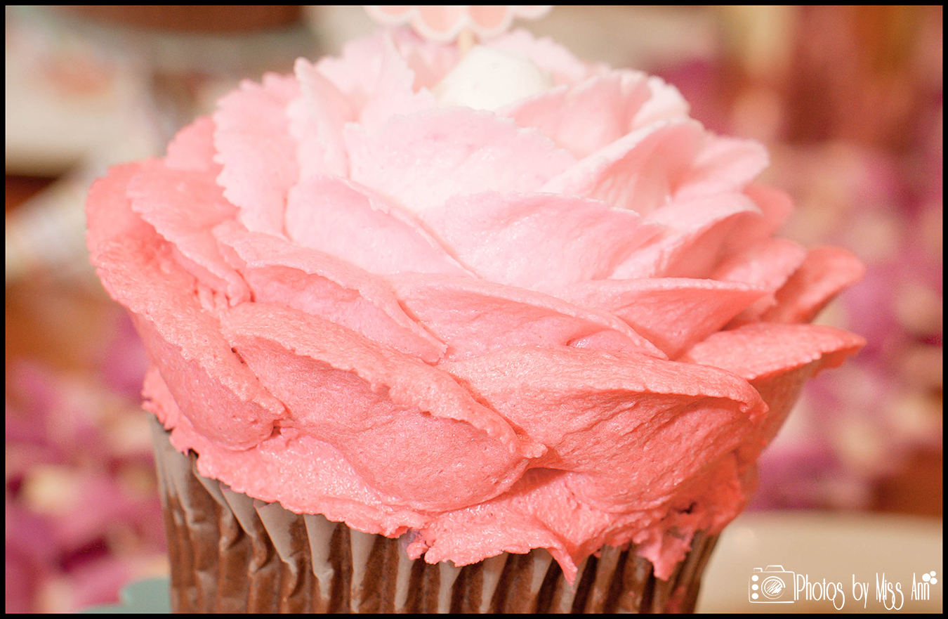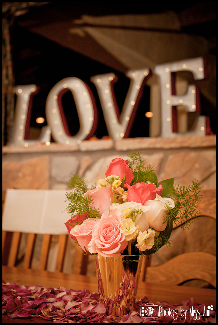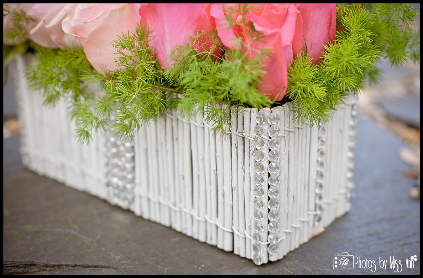 Heightening the theme, I had delicious rose chocolate cupcakes made and placed at each place setting on an individual cupcake stands. Sitting on top of the cupcakes were handmade jeweled heart banners that had “L + G: Super in Love” printed. Several other stationary items were at each place setting as well such as matching pink jeweled place cards, favor tags, a “Words to the Bride” card, and a “20 Questions” game sheet all having the same similar emblems. The party favors for each of the bachelorettes were flip flop bottle openers and pink “Bachelorette Party” coozie’s. Which in the end, were pretty simple but held meaning by incorporating the tropical destination wedding location of the bride and groom.
