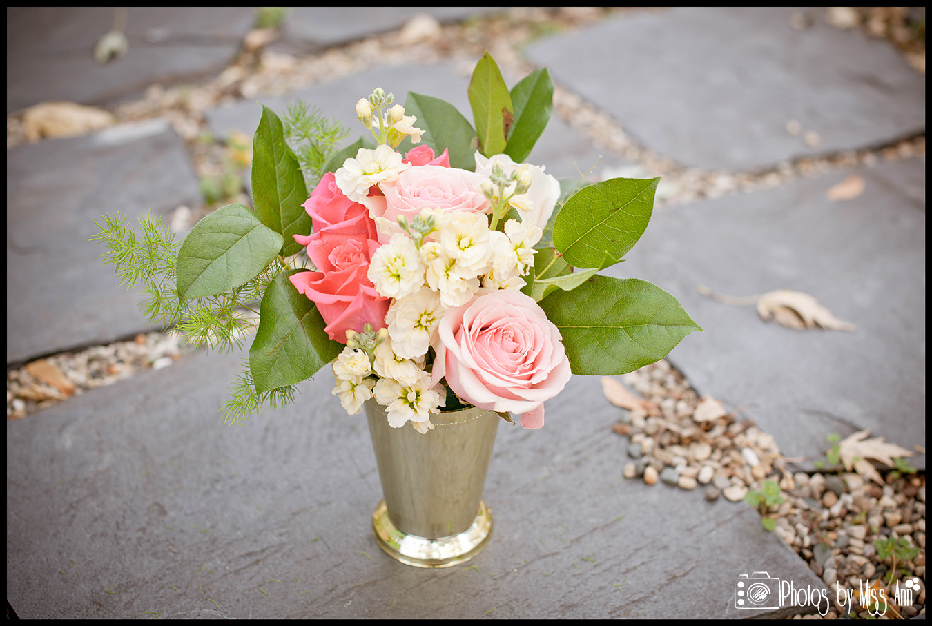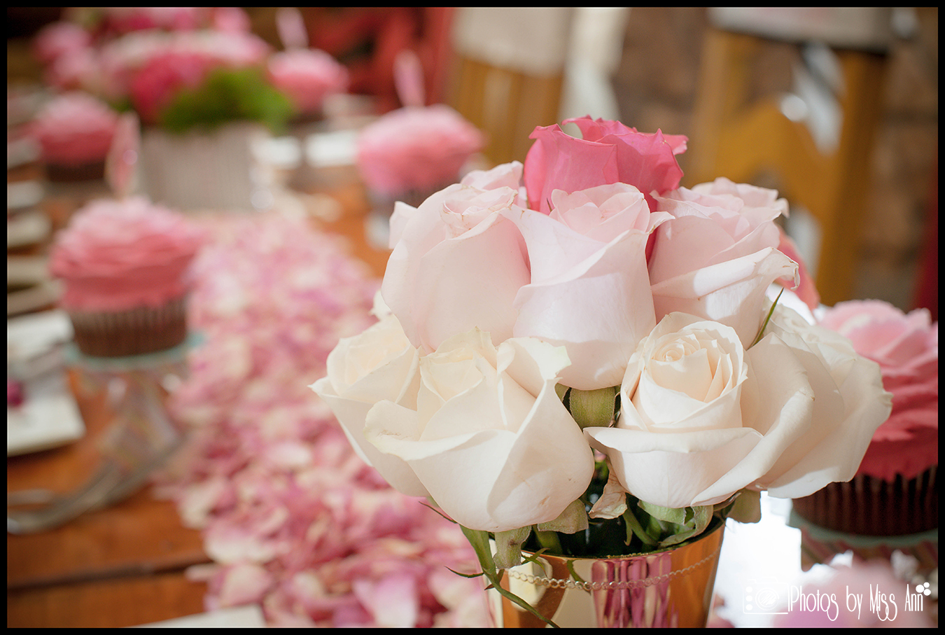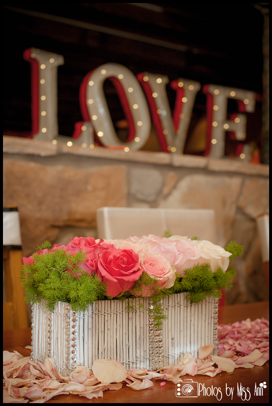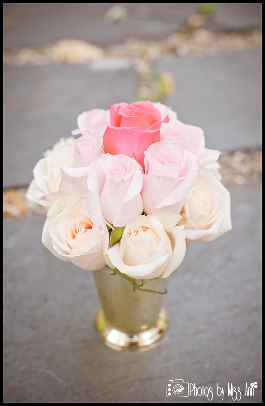The backbone of our table design was the ombre petals we designed into being the table runner. As you have seen in our previous posts, Flyboy Naturals is one of our favorite wedding vendors to work with so it was a no brainer to commission them again for another spectacular event we were planning. We used a total of 60 cups (2,500 petals for thick coverage) of freeze dried petals for our 12 person, long table design. The petal colors used were the following: Iceberg, Bridal Pink, Simplicity Bright Pink, and Super Nova. This series of colors really made our ombre color scheme come to life as you will see below in the photos. On top of the petal table runner and also on the top ledge behind the bride, were small gold mint julep cup arrangements that followed suit on the fade from light to dark pink. But our crowning glory middle centerpiece we are describing as an Ombre Rose Box, was my favorite by far!