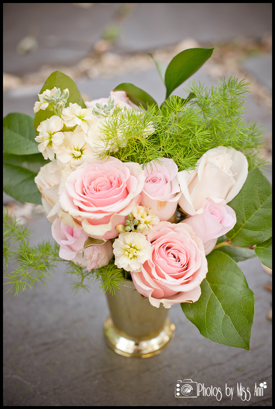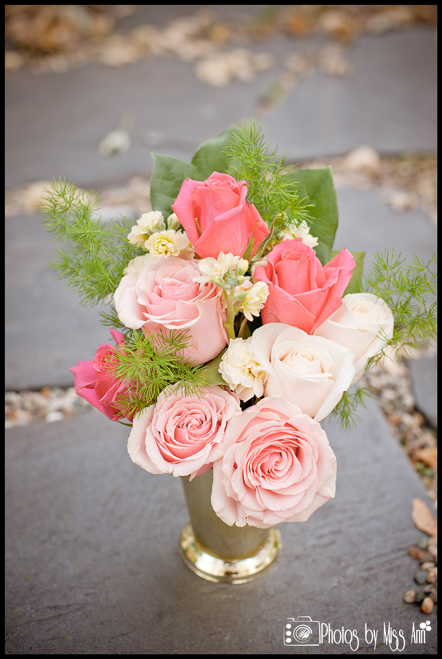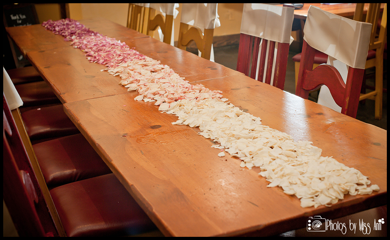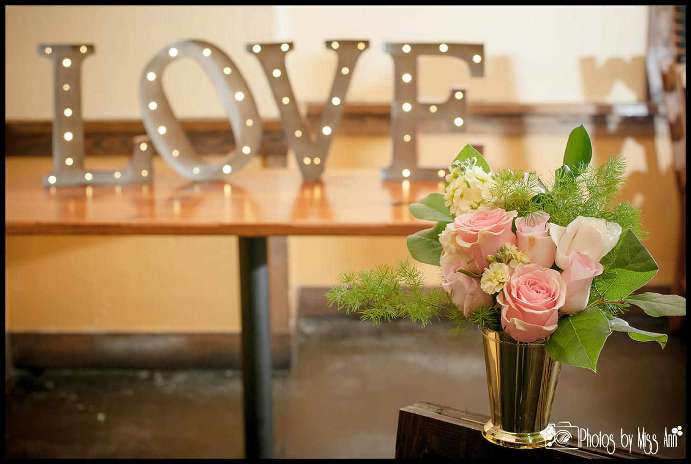 The backbone of our table design was the ombre petals we designed into being the table runner. As you have seen in our previous posts, Flyboy Naturals is one of our favorite wedding vendors to work with so it was a no brainer to commission them again for another spectacular event we were planning. We used a total of 60 cups (2,500 petals for thick coverage) of freeze dried petals for our 12 person, long table design. The petal colors used were the following: Iceberg, Bridal Pink, Simplicity Bright Pink, and Super Nova. This series of colors really made our ombre color scheme come to life as you will see below in the photos. On top of the petal table runner and also on the top ledge behind the bride, were small gold mint julep cup arrangements that followed suit on the fade from light to dark pink. But our crowning glory middle centerpiece we are describing as an Ombre Rose Box, was my favorite by far!