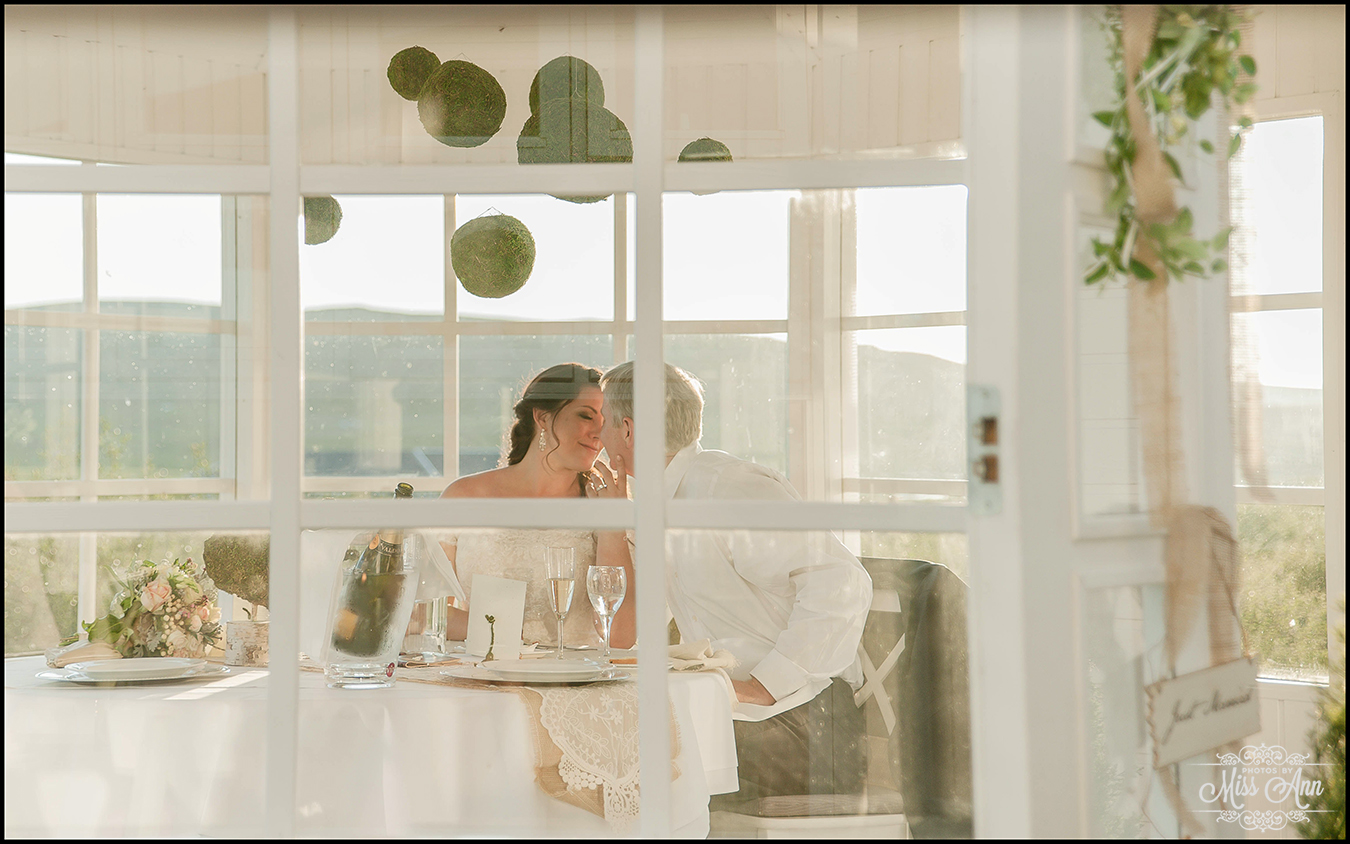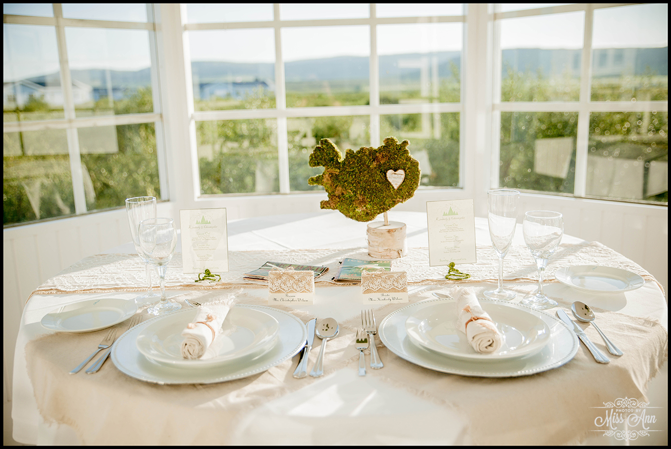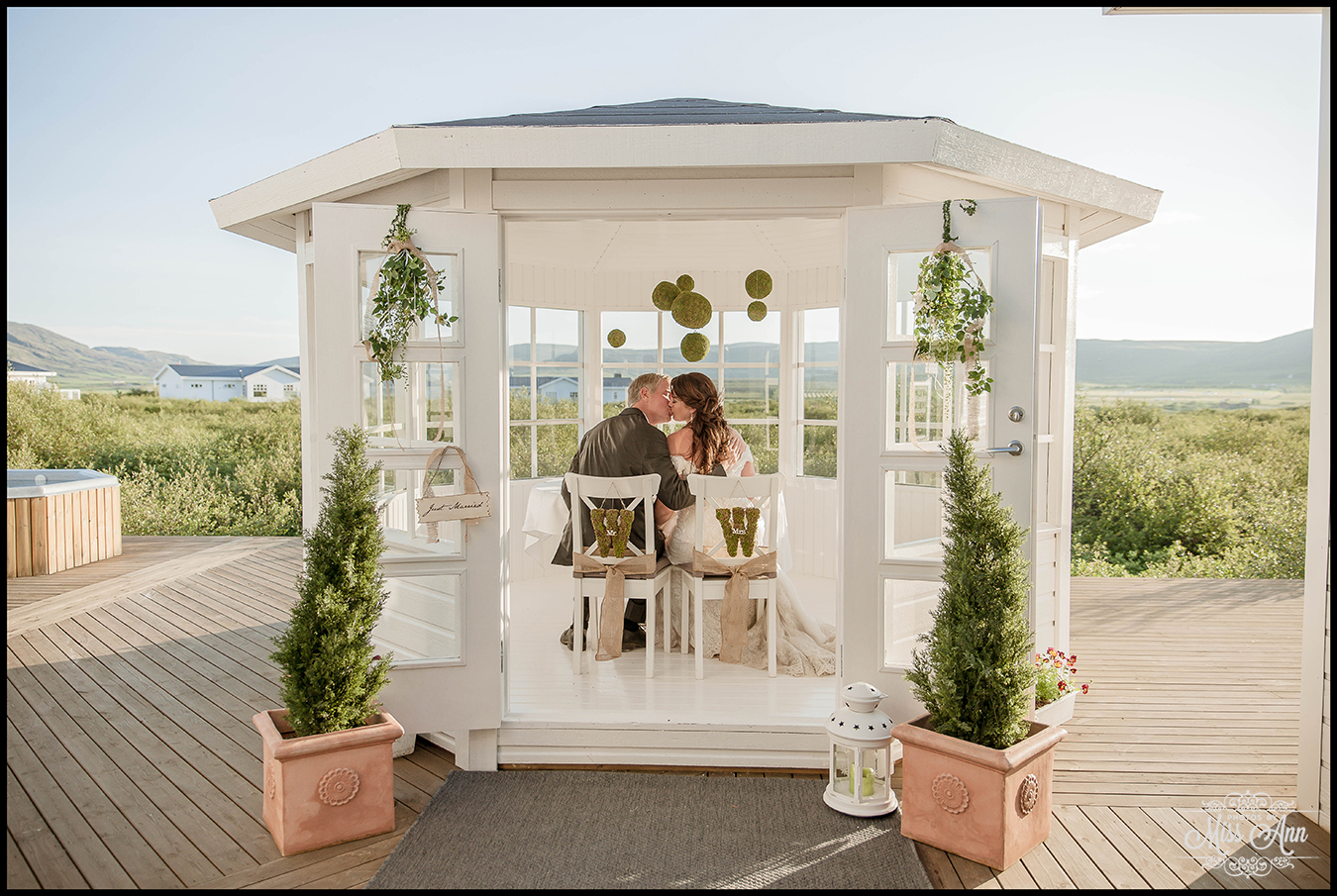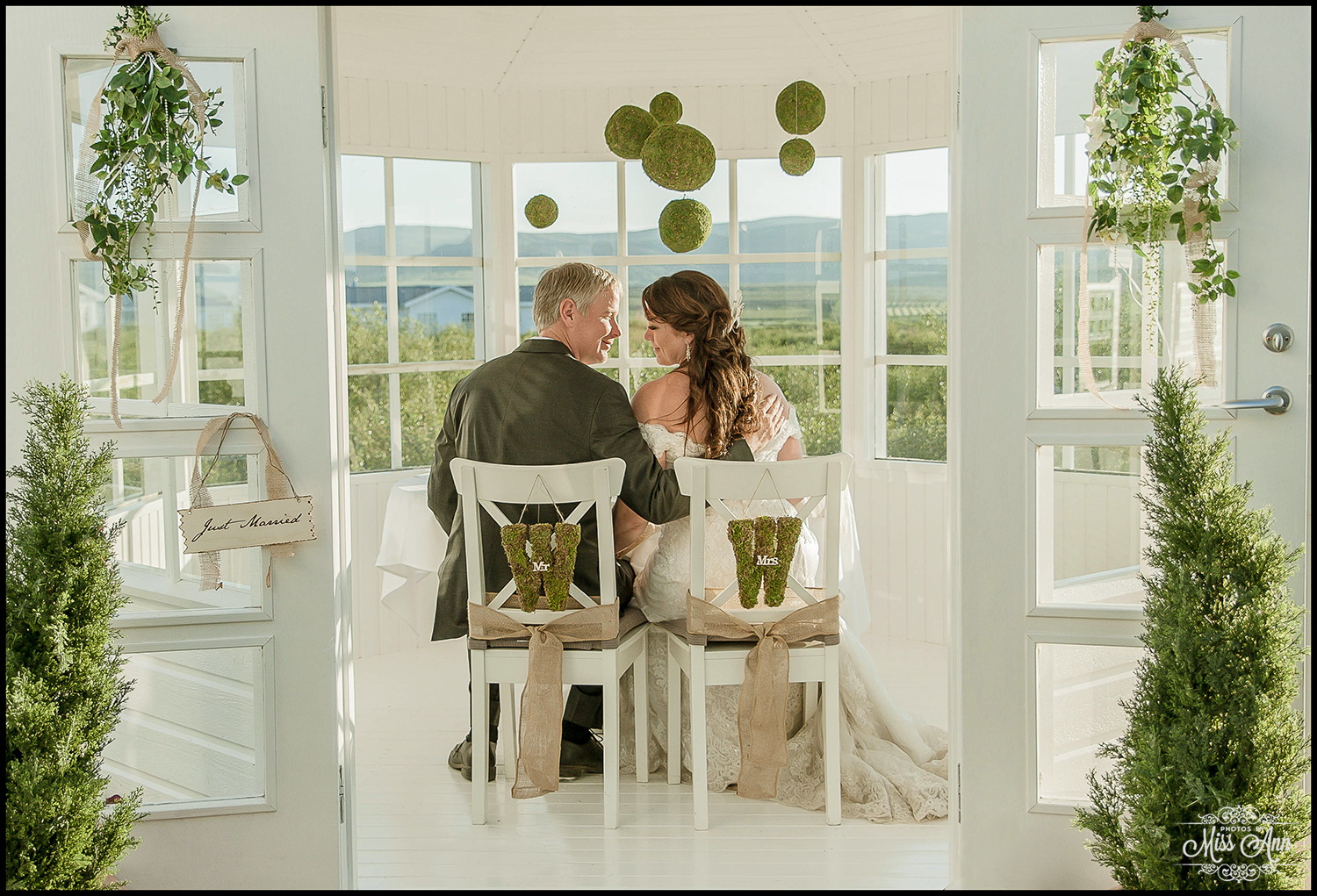 Drawing close to 9pm under the midnight sun, Kim and Chris headed back to Hotel Grimsborgir to delight in their private gazebo dinner overlooking the river and the mountains. The reception space from head to toe was tailored in bright white, but earthy tones and fabulous textures like moss, lace, and burlap. We loved doing the surprise reception styling for them! As soon as the couple headed in to their secluded dreamy escape they were all smiles. They were over the moon with each other as they drank champagne and started in on their 3 course Icelandic wedding meal.