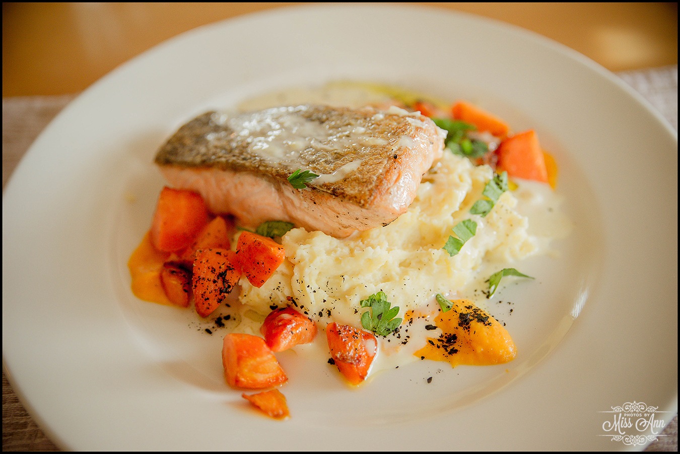 - Locally caught baked Salmon with carrots and citrus sauce.