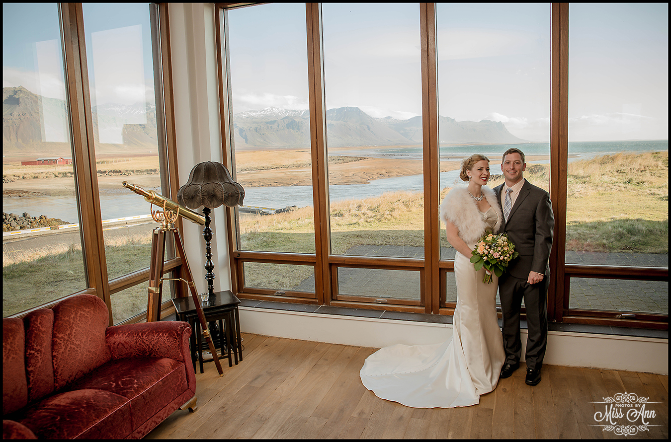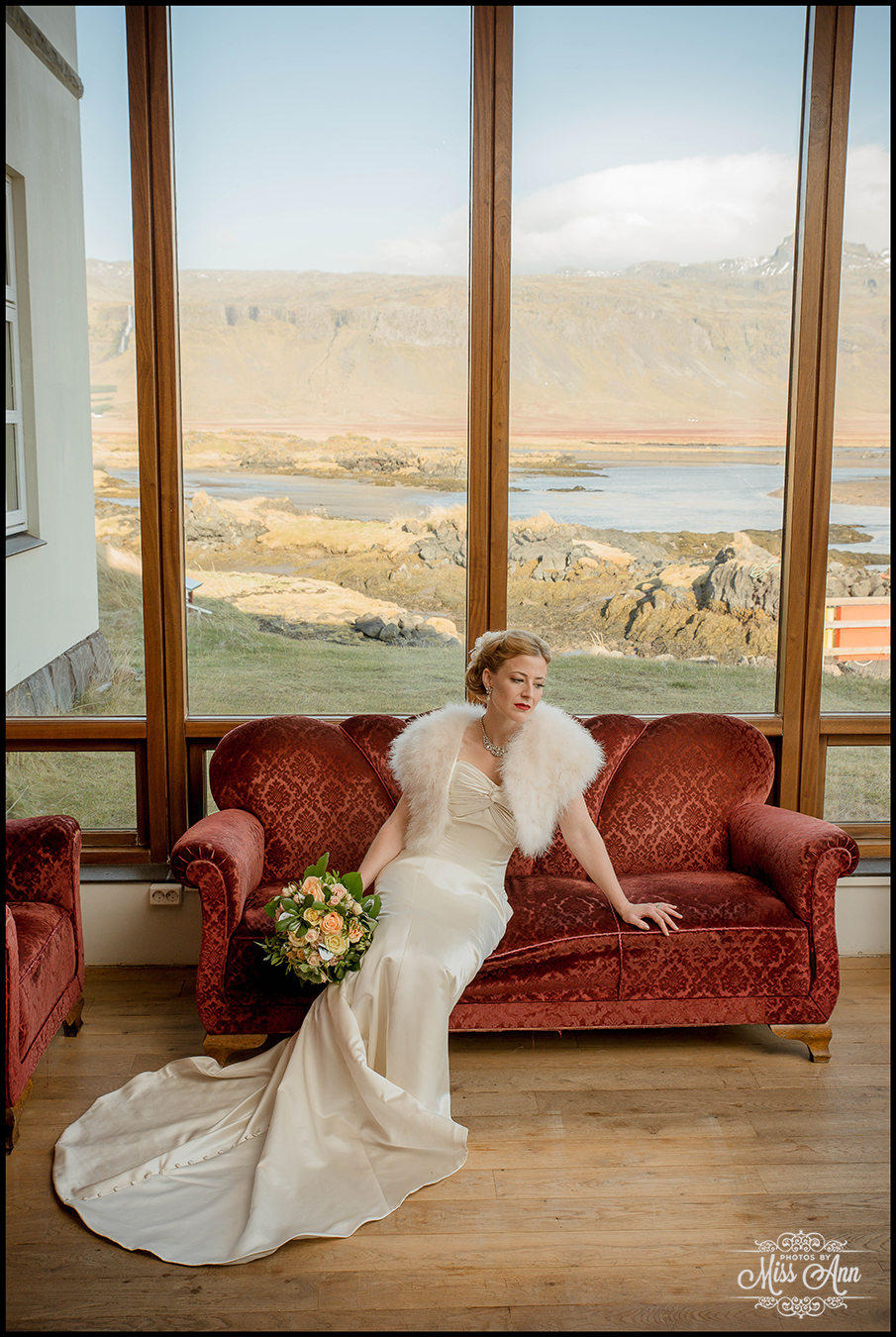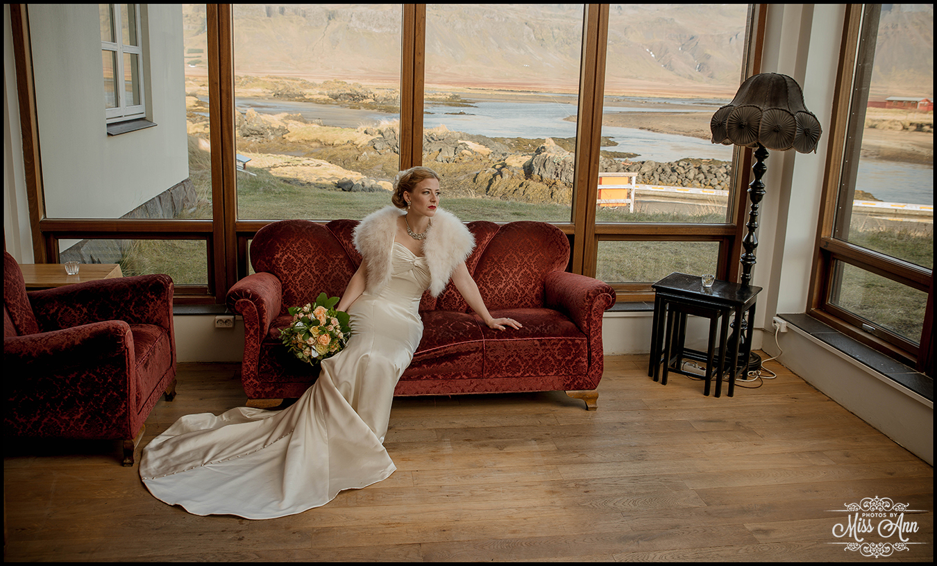 Their guests gathered together at 11am on that hilltop to celebrate their love and admiration, and Tiffany + Brian spoke their heartfelt vows to each other under that majestic morning light. After bearing through the strong winds, we decided to take the group inside for their formal Iceland wedding portraits and it was so beautiful! Hotel Budir has this gorgeous parlor room that boasts a phenomenal panoramic view and vintage red velvet couches, swoon! It went perfectly as you’ll see below with Tiff & Brian’s “Old Hollywood Glam” look!