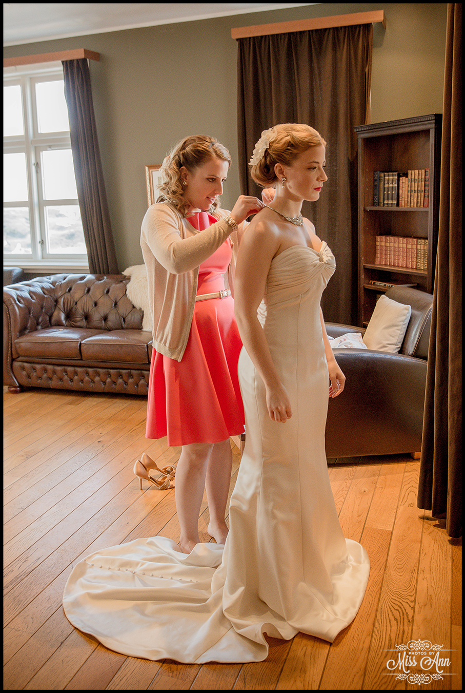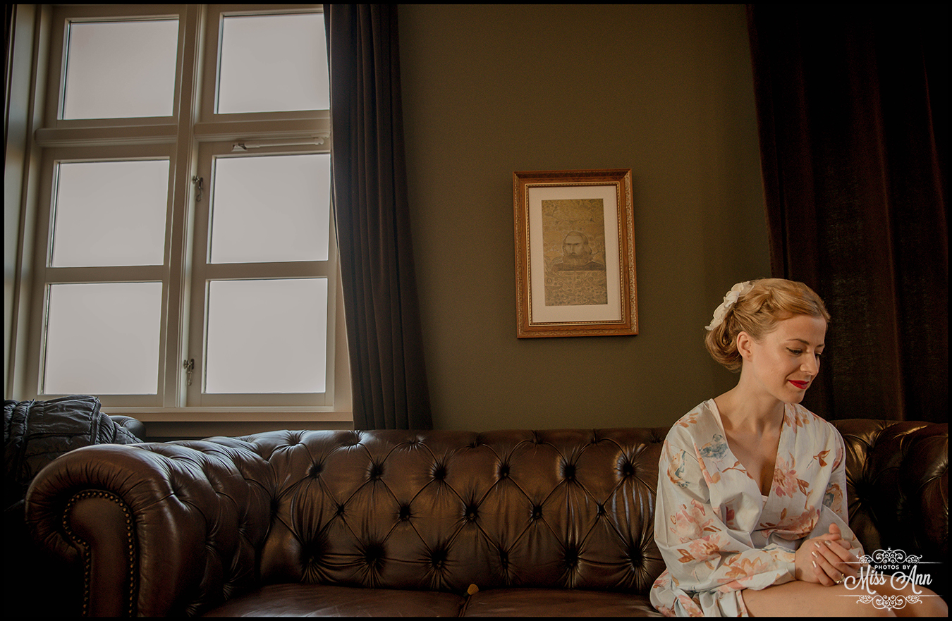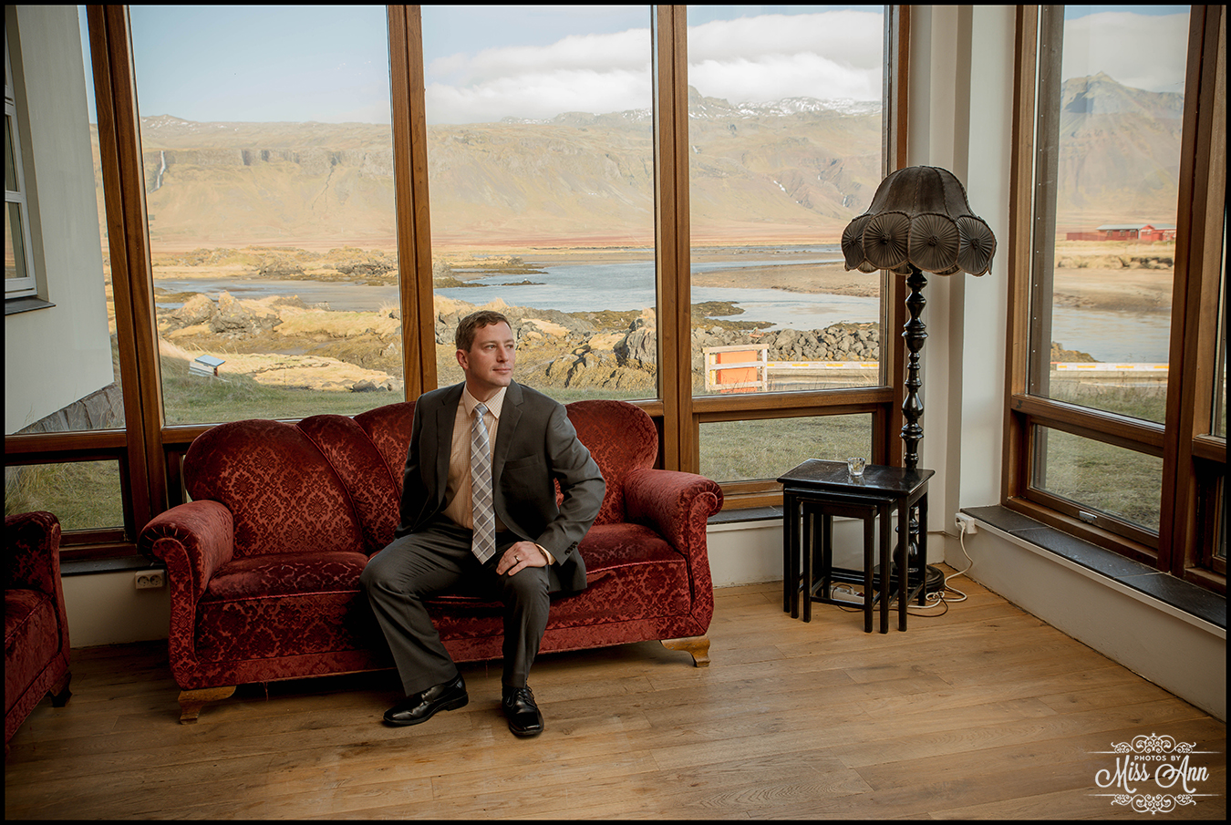 Their guests gathered together at 11am on that hilltop to celebrate their love and admiration, and Tiffany + Brian spoke their heartfelt vows to each other under that majestic morning light. After bearing through the strong winds, we decided to take the group inside for their formal Iceland wedding portraits and it was so beautiful! Hotel Budir has this gorgeous parlor room that boasts a phenomenal panoramic view and vintage red velvet couches, swoon! It went perfectly as you’ll see below with Tiff & Brian’s “Old Hollywood Glam” look!