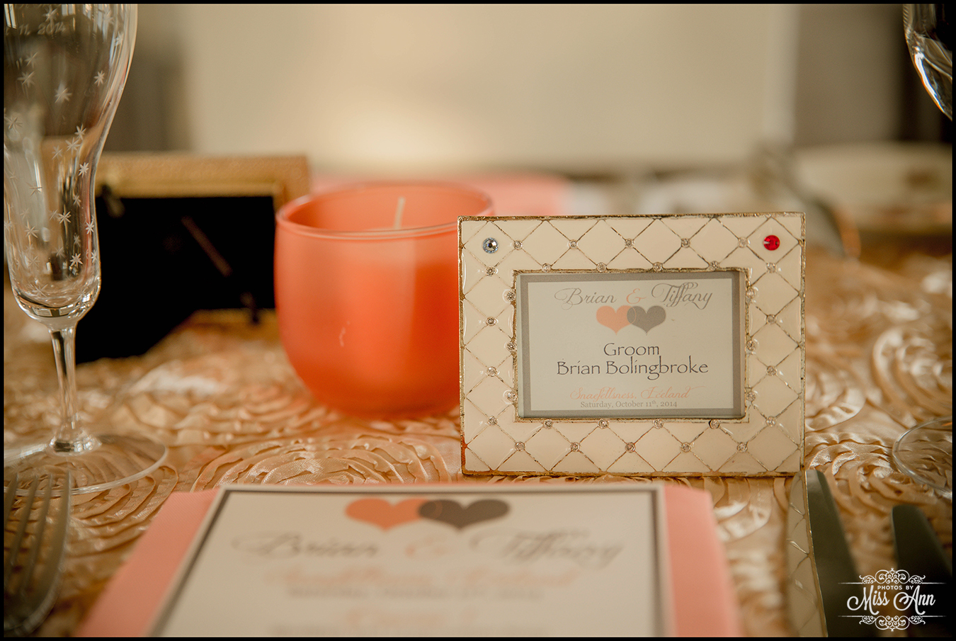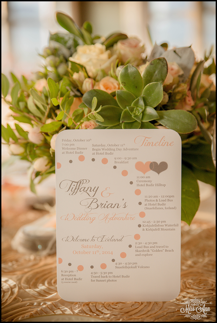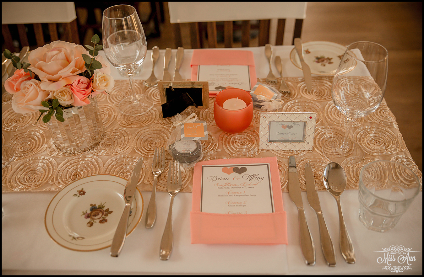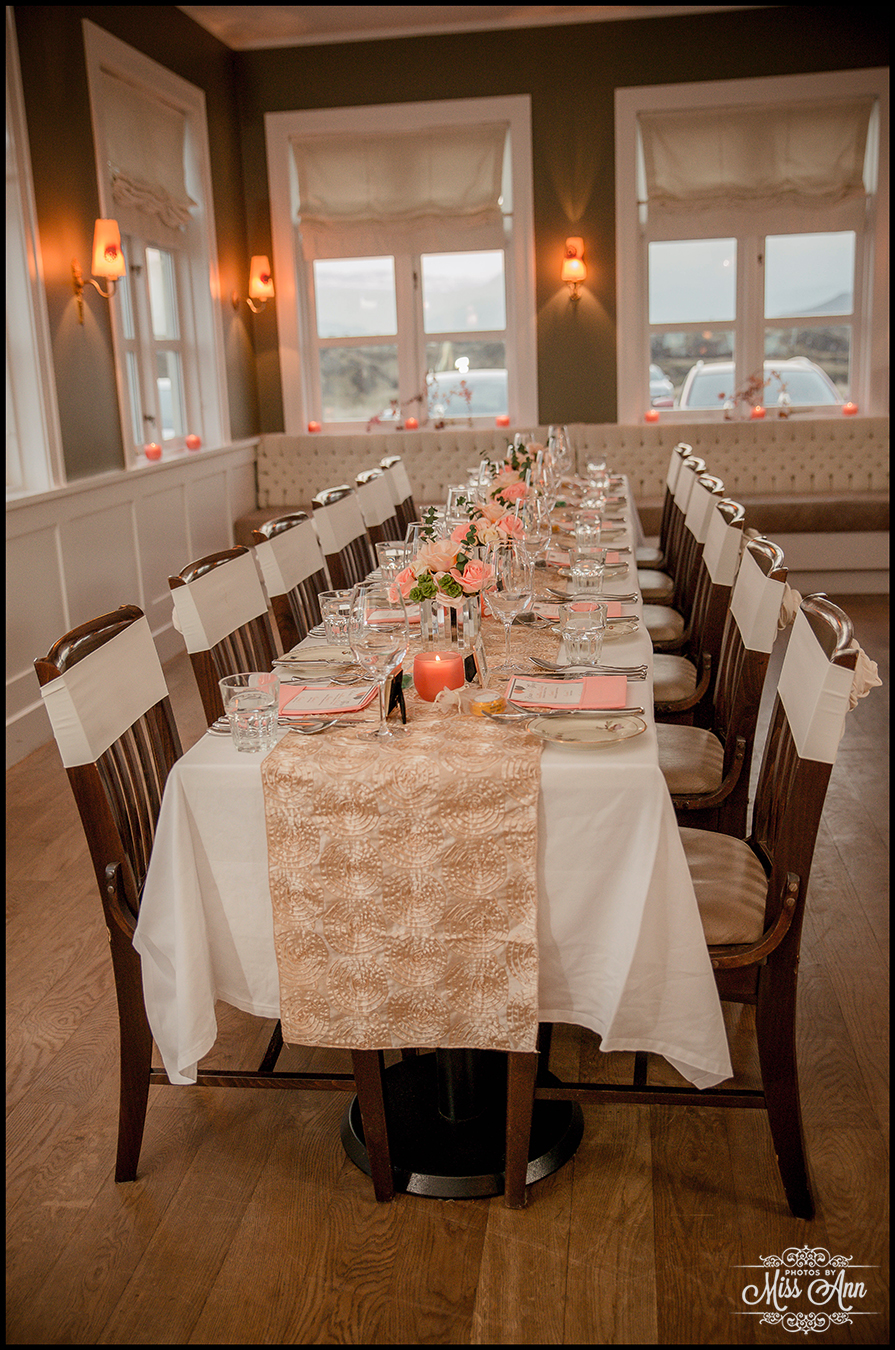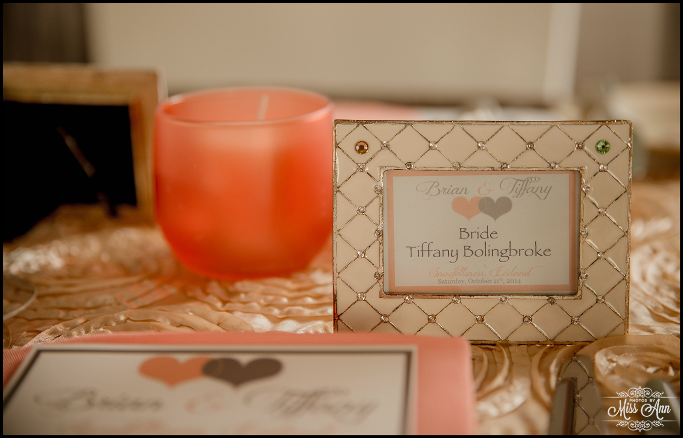 During my 21 months of planning time with Brian and Tiffany we brainstormed and mocked up all sorts of ideas for them to finalize a fabulous design and style scheme. Their perimeters were that they wanted to incorporate the colors peach, champagne, and a soft silver. It was also important have it flow throughout all of their stationary and decor. We carried those colors throughout their Iceland save-the-dates, Iceland wedding invitation, place cards, timeline cards, favor tags, menu, and their stunning Iceland wedding reception centerpieces! I think it all came together, eh? I’ll let you be the judge as you delight in the awesome Iceland wedding reception images below!