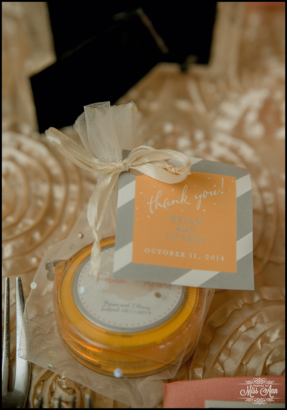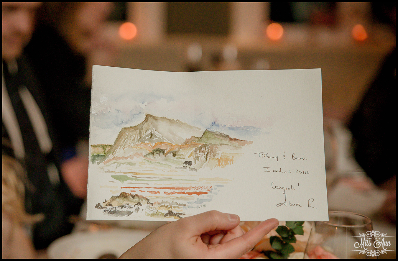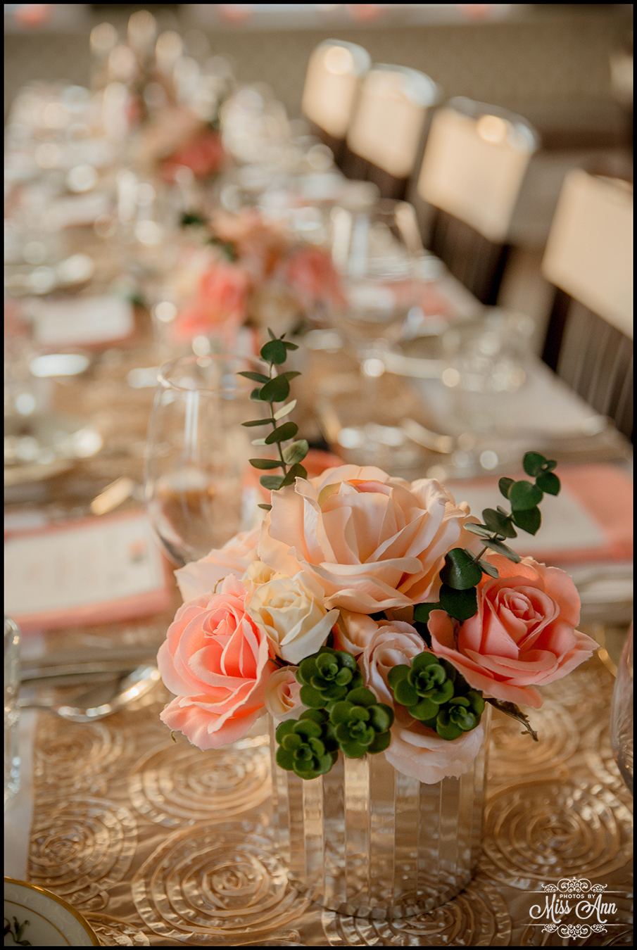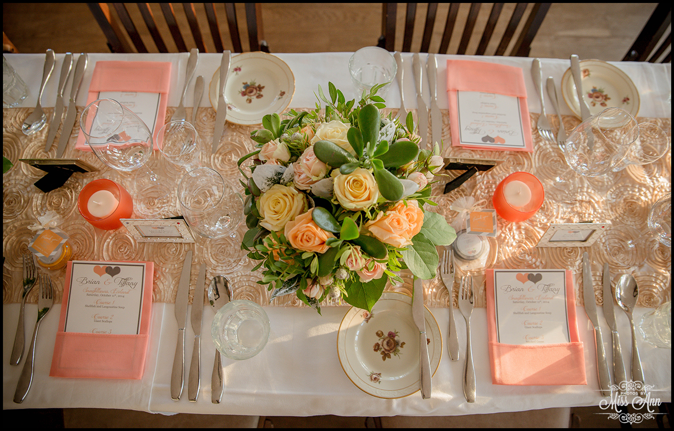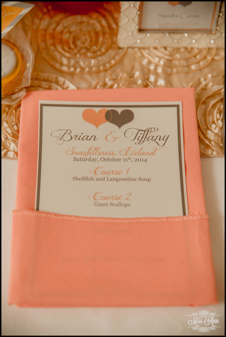 During my 21 months of planning time with Brian and Tiffany we brainstormed and mocked up all sorts of ideas for them to finalize a fabulous design and style scheme. Their perimeters were that they wanted to incorporate the colors peach, champagne, and a soft silver. It was also important have it flow throughout all of their stationary and decor. We carried those colors throughout their Iceland save-the-dates, Iceland wedding invitation, place cards, timeline cards, favor tags, menu, and their stunning Iceland wedding reception centerpieces! I think it all came together, eh? I’ll let you be the judge as you delight in the awesome Iceland wedding reception images below!