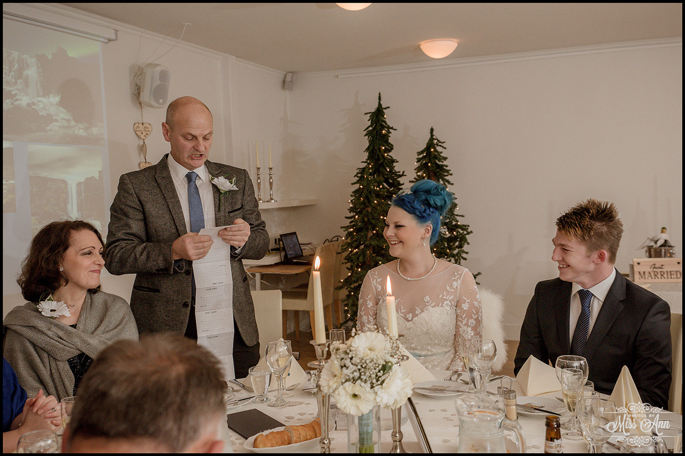 The day began at the wonderful Northern Lights Inn, where at 8am the guests all loaded a bus to go to the famed Thingvellir National Park for the couple’s Iceland sunrise wedding ceremony at Öxarárfoss Waterfall. Despite the rain, the scene was set by uber romantic mini lanterns and white chiavari chairs (yes they exist in Iceland)! Chloe and Danny vowed their undying love for each other and their friends and family totally swooned!