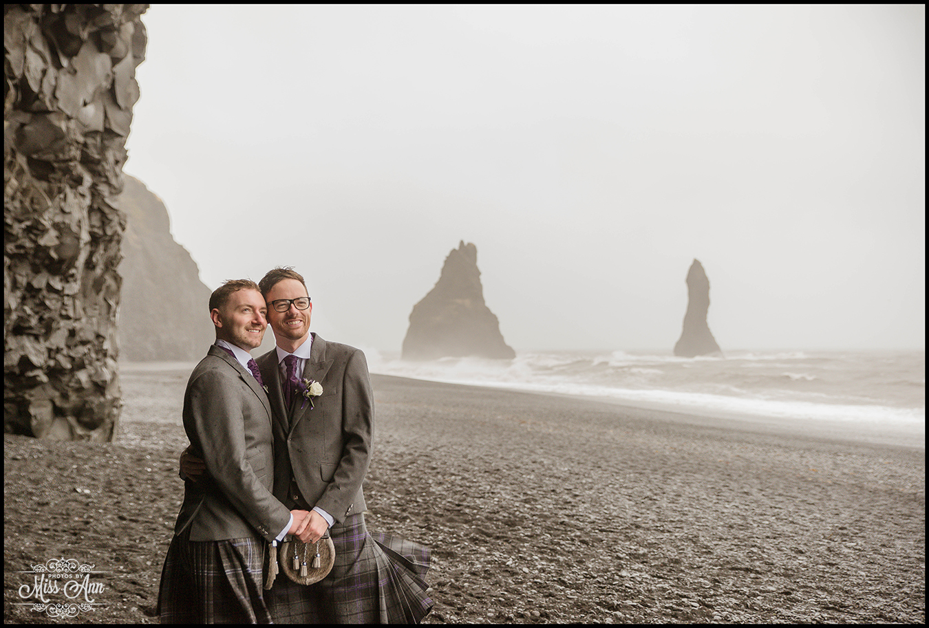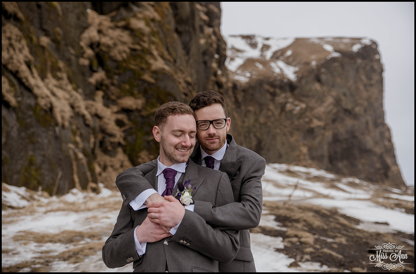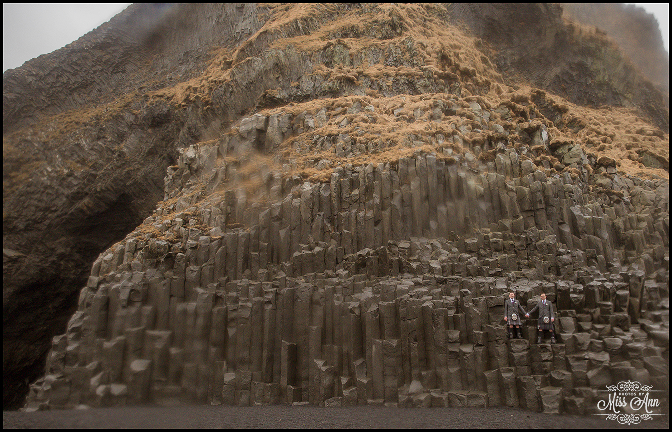 The next several locations on their wedding day adventure came with sideways rain and 20-30mph wind gusts. We mustn’t forget Rule #1 about getting married in Iceland: Iceland is moody and unpredictable! Pretty sure most couples would have tapped out at this point and said, “Plan B indoor locations, please!” Paul and Marc, didn’t! The guests and grooms prevailed over it and made it to another cave on a gorgeous black sand beach. The group drank Prosecco, recanted awesome stories of the grooms, and had many laughs over the ever-changing Icelandic weather which had just transitioned to hail/snow. To be expected and embraced! The guests found their way back to the jeeps for a packed lunch and the grooms and I continued on for some epic rainy day wedding portraits in front of some gorgeous basalt rocks that emerged from the sea.