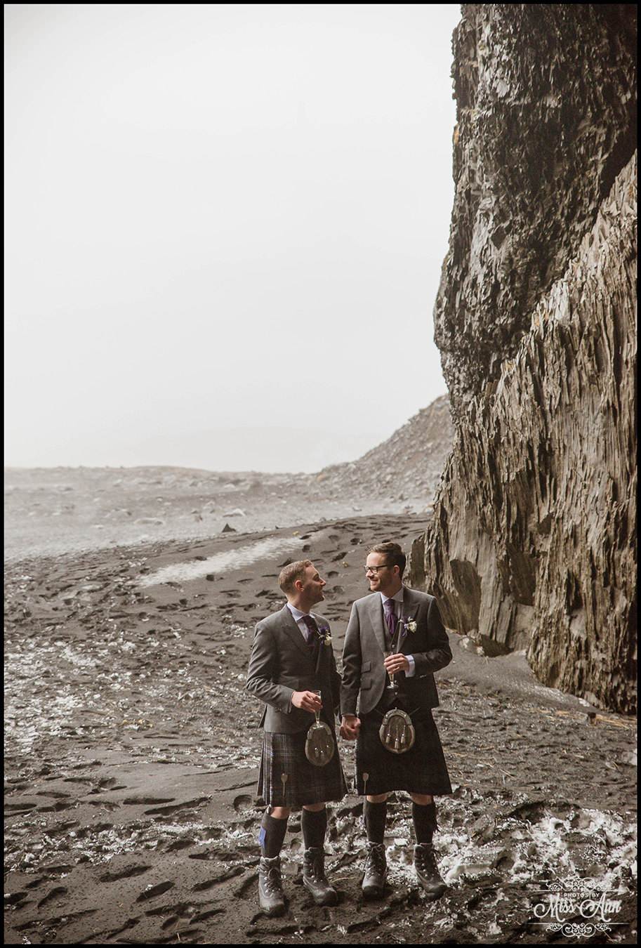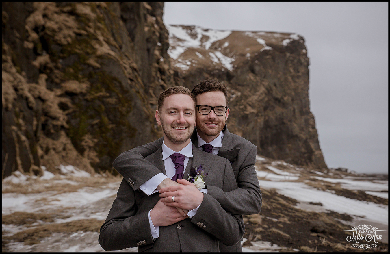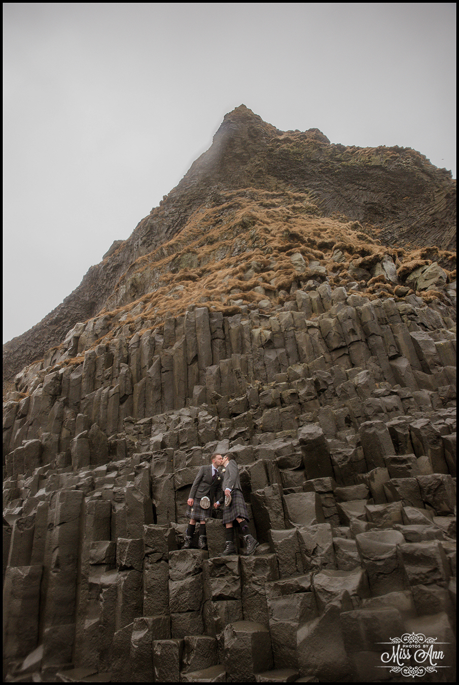 The next several locations on their wedding day adventure came with sideways rain and 20-30mph wind gusts. We mustn’t forget Rule #1 about getting married in Iceland: Iceland is moody and unpredictable! Pretty sure most couples would have tapped out at this point and said, “Plan B indoor locations, please!” Paul and Marc, didn’t! The guests and grooms prevailed over it and made it to another cave on a gorgeous black sand beach. The group drank Prosecco, recanted awesome stories of the grooms, and had many laughs over the ever-changing Icelandic weather which had just transitioned to hail/snow. To be expected and embraced! The guests found their way back to the jeeps for a packed lunch and the grooms and I continued on for some epic rainy day wedding portraits in front of some gorgeous basalt rocks that emerged from the sea.