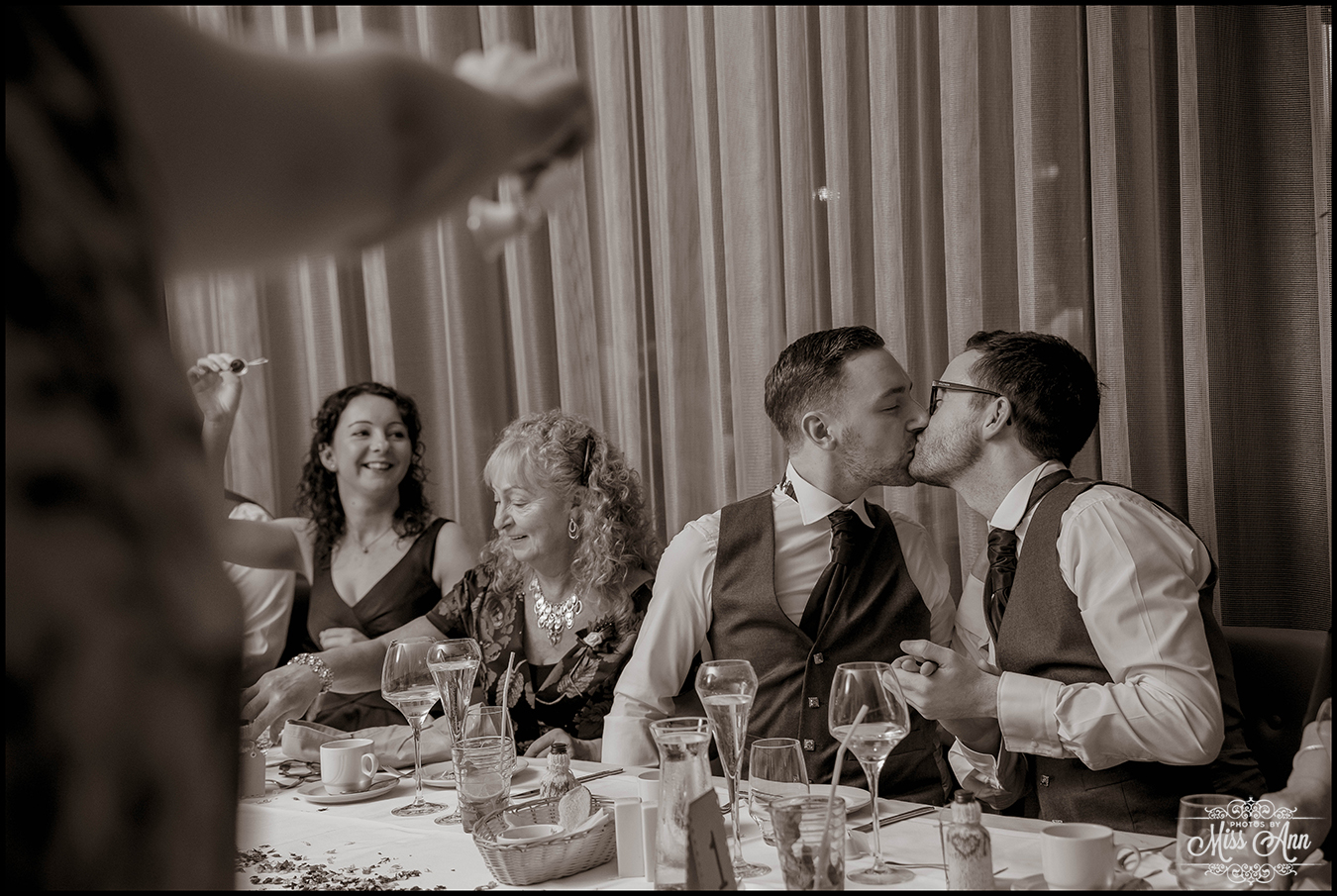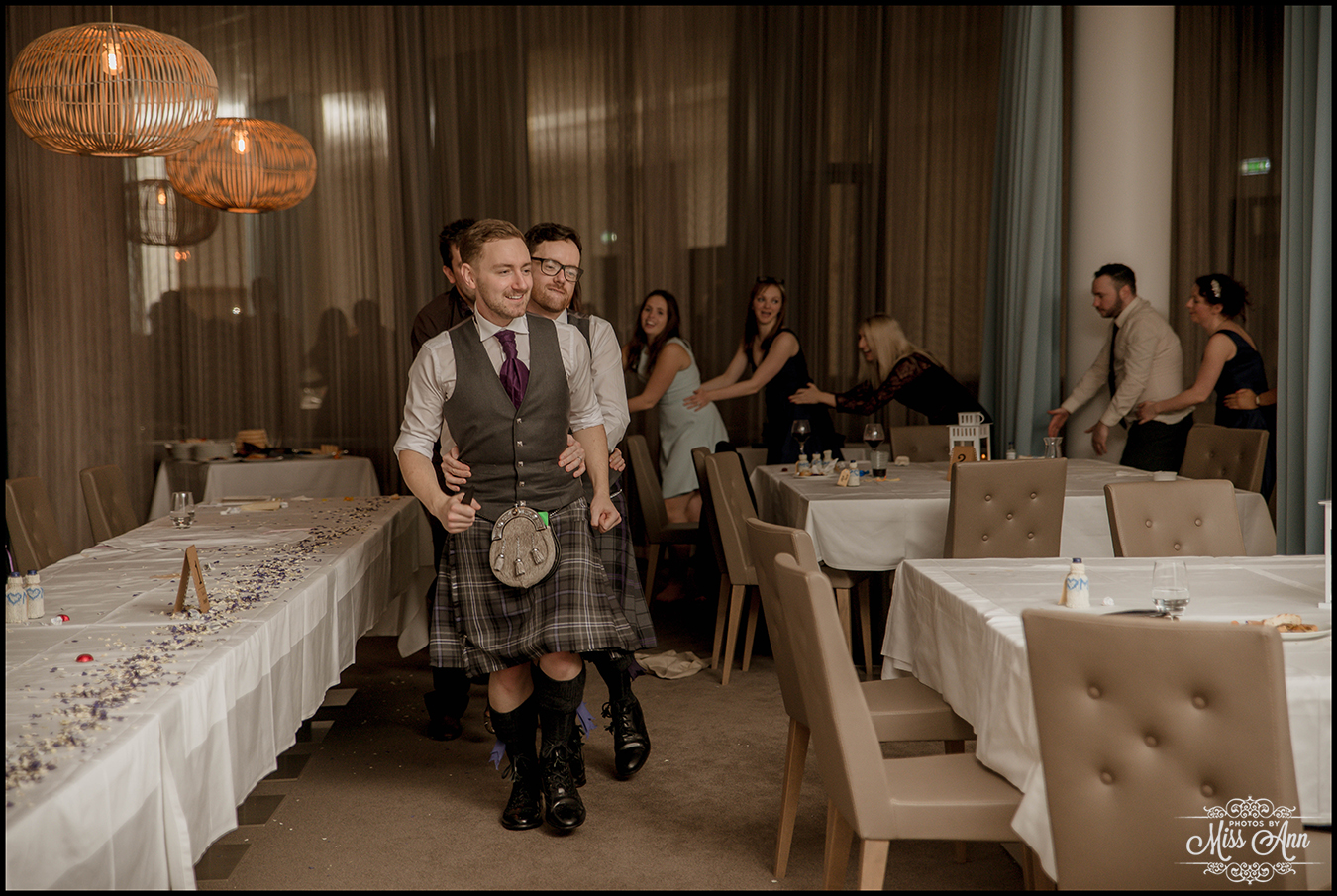Marc + Paul’s Iceland wedding reception was full of endless amounts of energy! Their guests were pleasantly surprised by the party favors on the table… Mini bottles of Reyka Vodka which were covered by little hand knit Icelandic sweaters that had their initials on them! How flipping cute, right?! From the endless laughs, smiles, stories, the Scottish Gay Gordon traditional dancing, to late night Icelandic snacks the guests and grooms went strong long after midnight!
