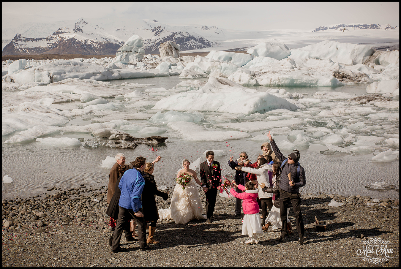 Bethany and Richard fell in love with holding their Iceland wedding ceremony at the legendary Jokulsarlon Glacier Lagoon and so we did… Around 9am on a fabulous April morning, all of the guests began their Icelandic adventure wedding day from Vik and headed east for a thrill-seeking day of sunshine, hiking, and being awed by the vivid landscapes! Upon arrival to the lagoon, the excitement between the bride and groom was infectious and you could not keep your eyes off of them! They delighted in a beautiful Iceland Humanist wedding ceremony where they spoke their own vows to each other, ended with a sweet kiss in front of the floating icebergs and a rose petal toss in celebration!