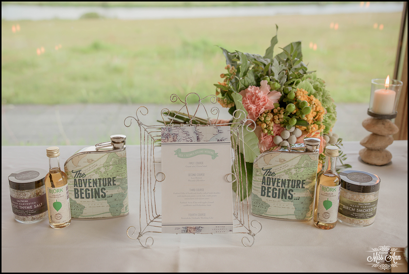 Upon returning to Hotel Ranga, the couple was greeted with a stunningly styled (by us, Iceland Wedding Planner of course) intimate Iceland wedding reception for two overlooking the beautiful Ranga River. Accoutrements included connections to nature within the rock centerpieces, organic salt Iceland wedding favors, an elegant Iceland wedding menu card, and flasks that said, “The Adventure Begins…” A luxury elopement in Iceland screams details. That’s just what this fabulous couple received! As the sun began to set after dinner, we headed back out to a sweet little sod farm for a few more images ending our adventure just after midnight!