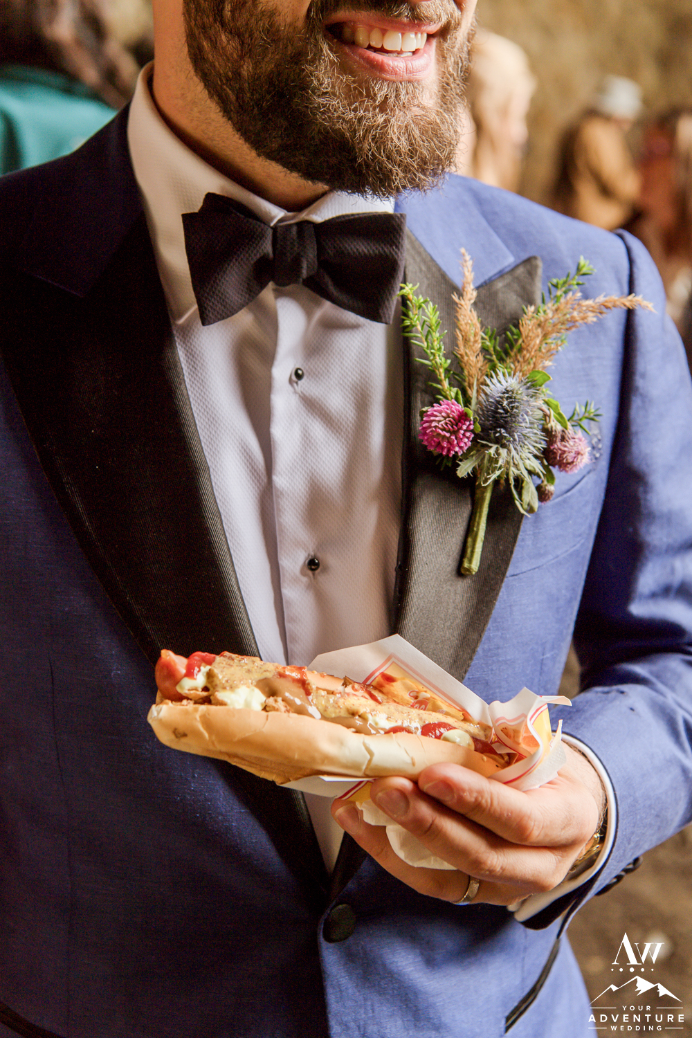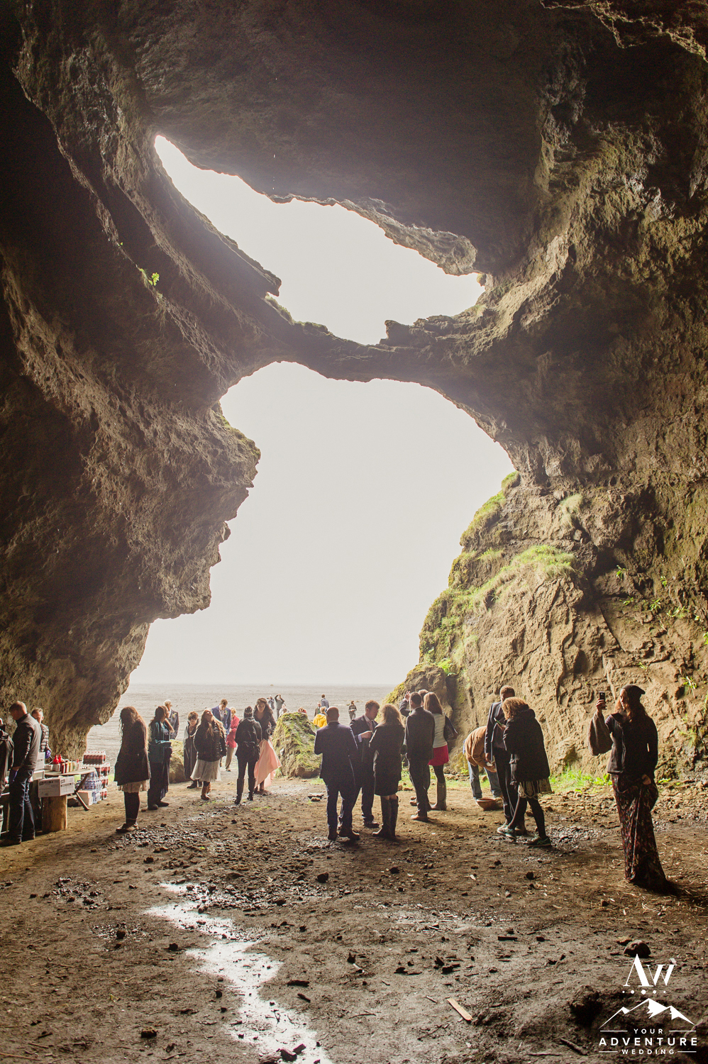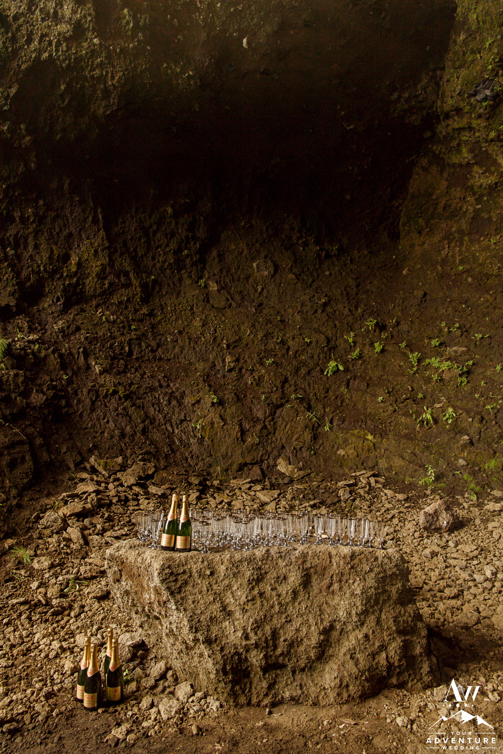 The second stop on the adventure wedding agenda was a hot dog bbq lunch in a private cave! To get there, we forged some sweet rivers and jammed out to music. Once there everyone ate a delicious lamb hot dog with all the sauces (Icelanders LOVE their sauces) and fixings (like raw and fried onions), toasted with Christophe’s family’s champagne (La Caravelle) and had a fun Icelandic sing-along. The energy from all the excitement in there was intoxicating and truly an unforgettable experience!