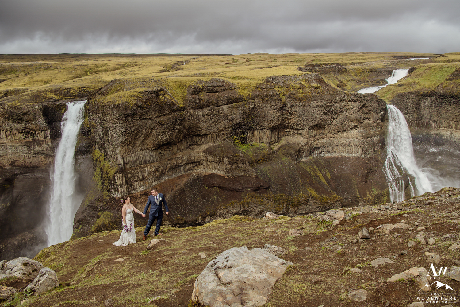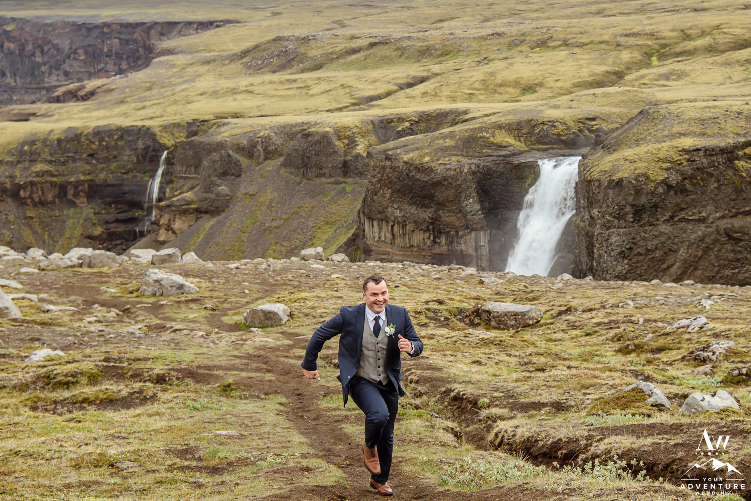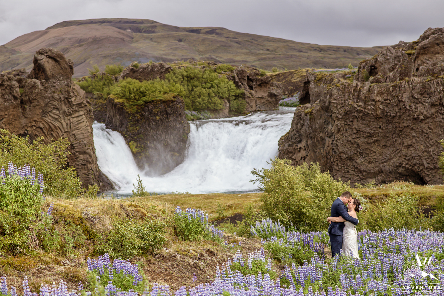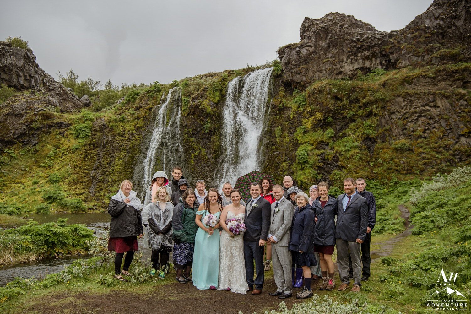 Upon arriving, it was pouring down with rain but the group embraced it, put up their hoods/umbrellas and enjoyed all of what the Icelandic weather had to offer by fully immersing themselves in it. After the ceremony, Rebecca and James put on their waterproof boots and went exploring with their Iceland wedding photographer! Once that location had been fully explored, we headed on to 3 more offbeat waterfalls in the highlands for more exploration and Iceland wedding photos! The adventure concluded at a lovely black sand beach where the group explored by themselves in the sunshine! It in the end, turned into quite the stunning day!