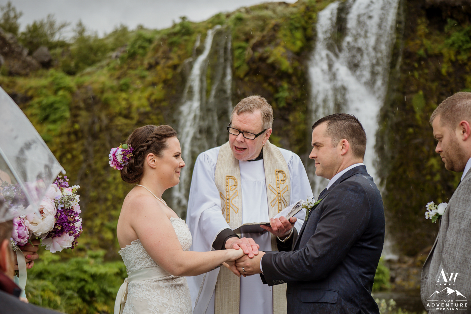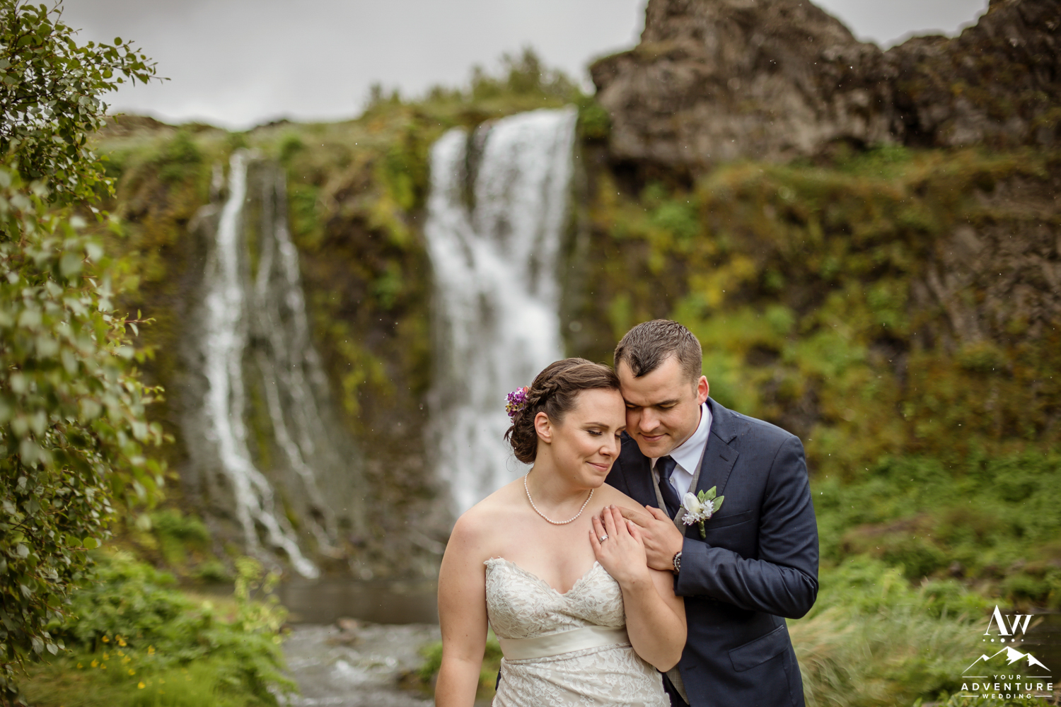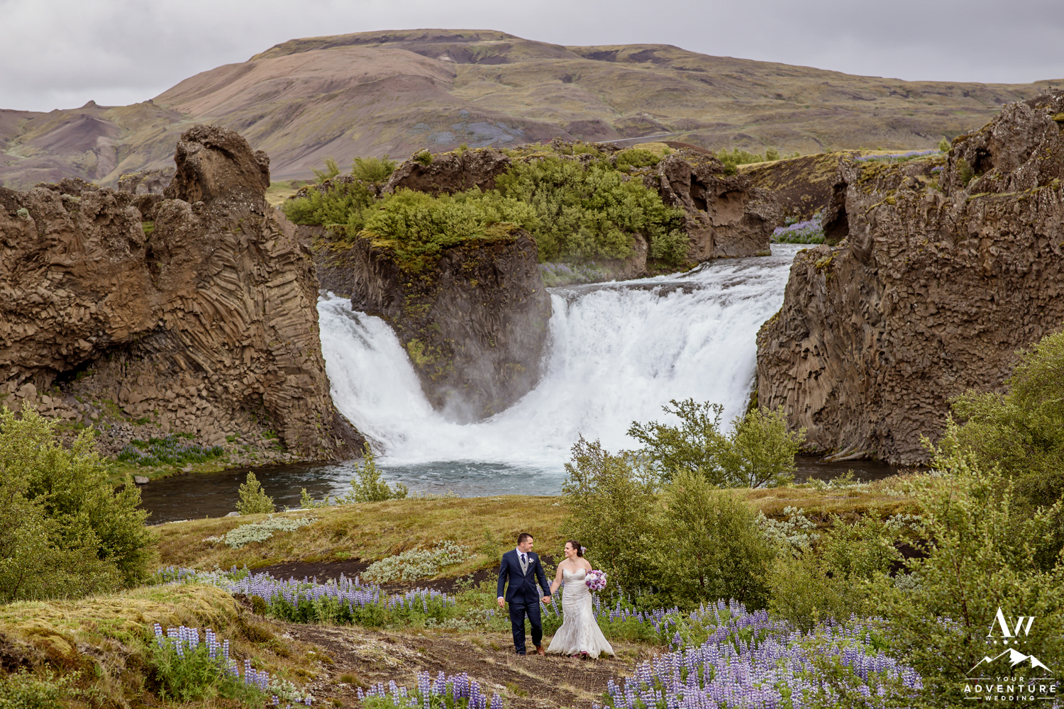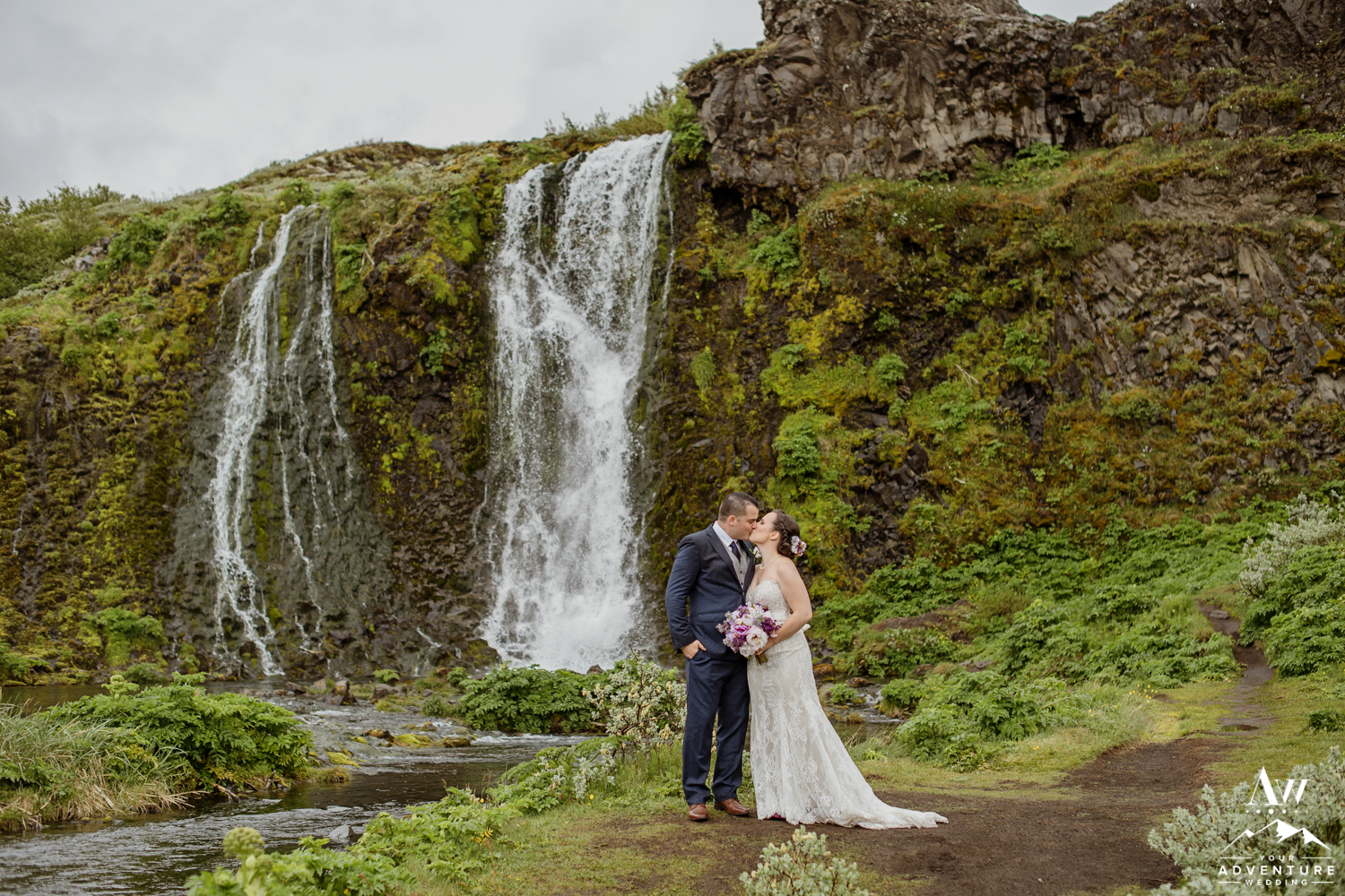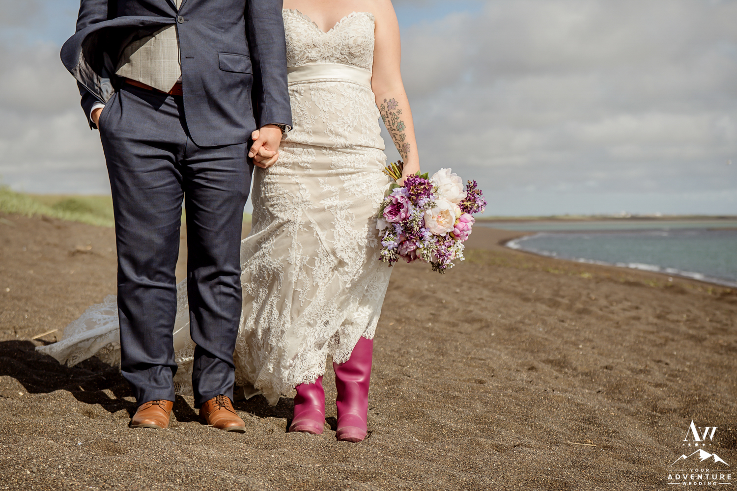 Upon arriving, it was pouring down with rain but the group embraced it, put up their hoods/umbrellas and enjoyed all of what the Icelandic weather had to offer by fully immersing themselves in it. After the ceremony, Rebecca and James put on their waterproof boots and went exploring with their Iceland wedding photographer! Once that location had been fully explored, we headed on to 3 more offbeat waterfalls in the highlands for more exploration and Iceland wedding photos! The adventure concluded at a lovely black sand beach where the group explored by themselves in the sunshine! It in the end, turned into quite the stunning day!