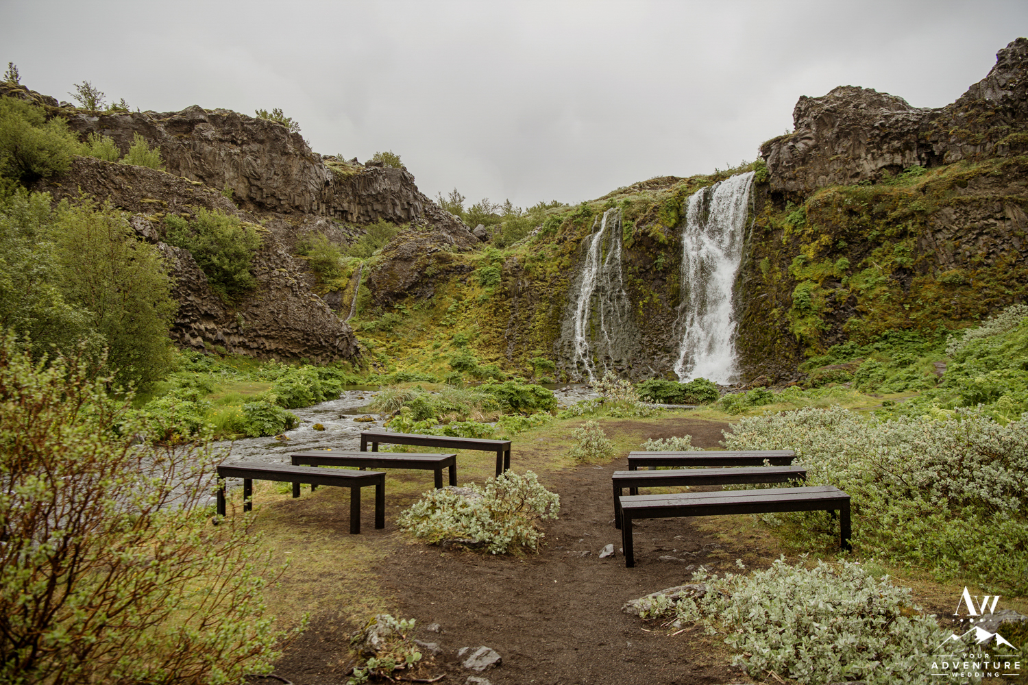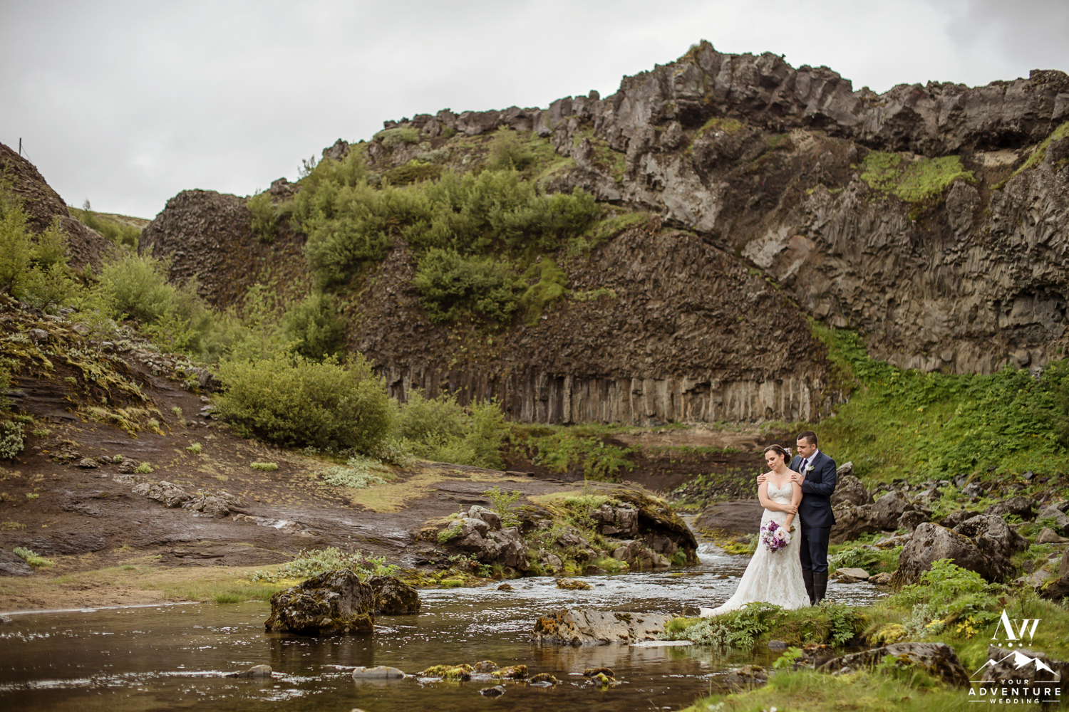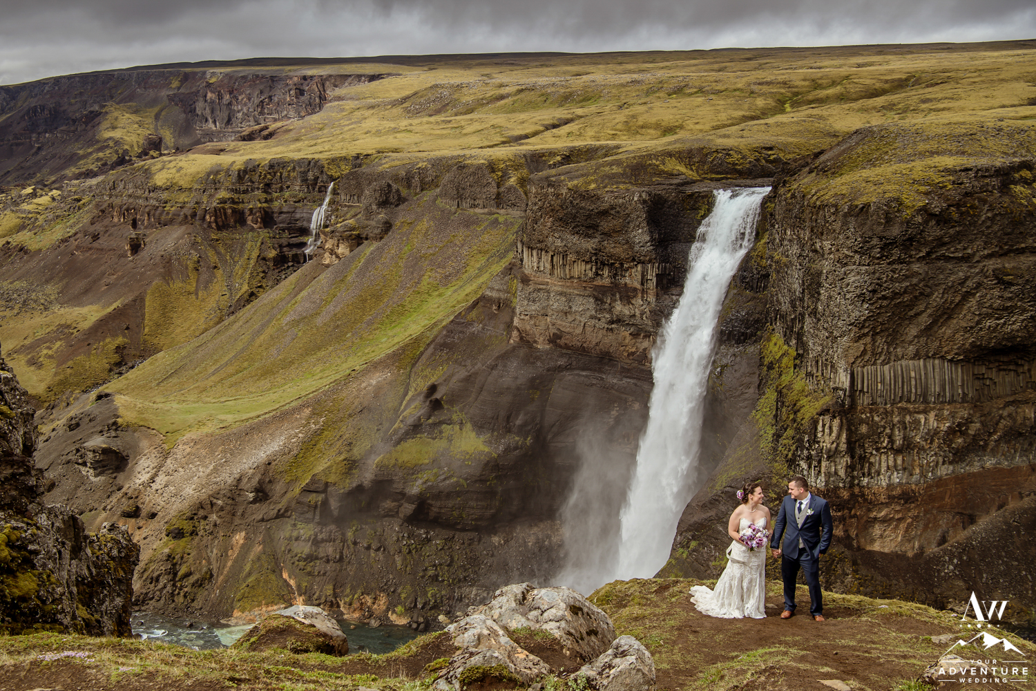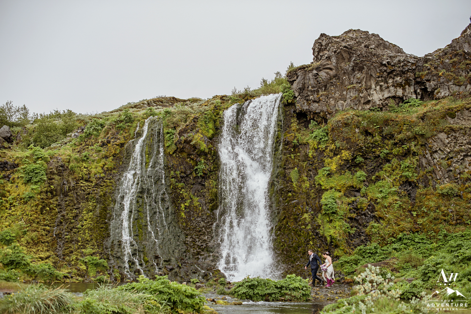 Upon arriving, it was pouring down with rain but the group embraced it, put up their hoods/umbrellas and enjoyed all of what the Icelandic weather had to offer by fully immersing themselves in it. After the ceremony, Rebecca and James put on their waterproof boots and went exploring with their Iceland wedding photographer! Once that location had been fully explored, we headed on to 3 more offbeat waterfalls in the highlands for more exploration and Iceland wedding photos! The adventure concluded at a lovely black sand beach where the group explored by themselves in the sunshine! It in the end, turned into quite the stunning day!