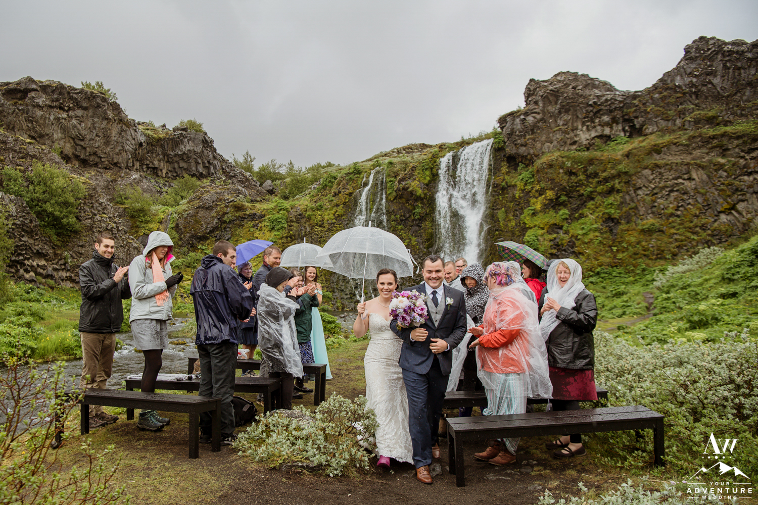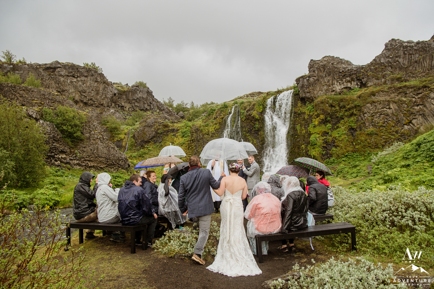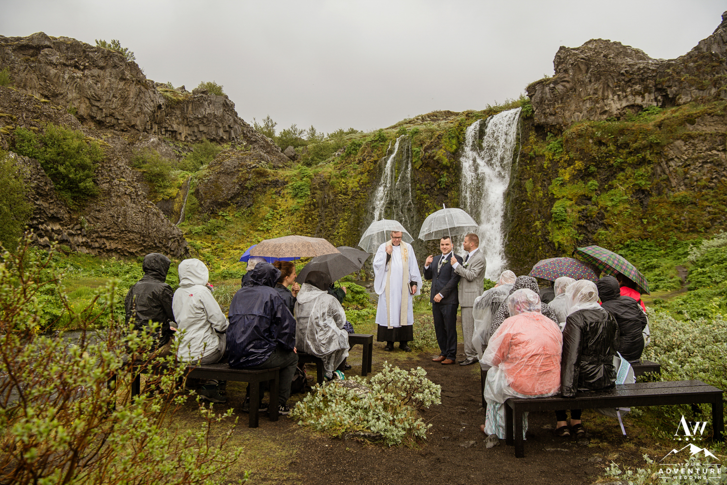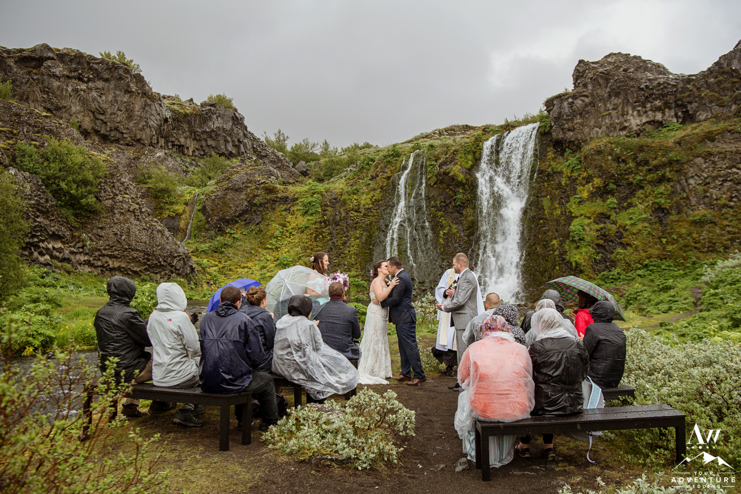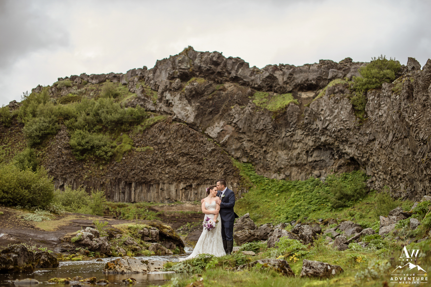 Upon arriving, it was pouring down with rain but the group embraced it, put up their hoods/umbrellas and enjoyed all of what the Icelandic weather had to offer by fully immersing themselves in it. After the ceremony, Rebecca and James put on their waterproof boots and went exploring with their Iceland wedding photographer! Once that location had been fully explored, we headed on to 3 more offbeat waterfalls in the highlands for more exploration and Iceland wedding photos! The adventure concluded at a lovely black sand beach where the group explored by themselves in the sunshine! It in the end, turned into quite the stunning day!