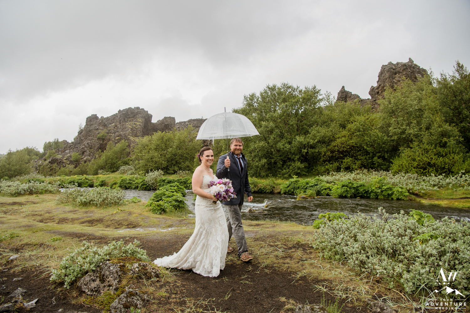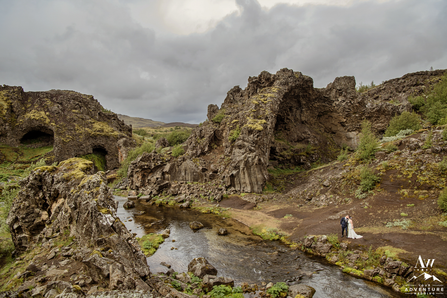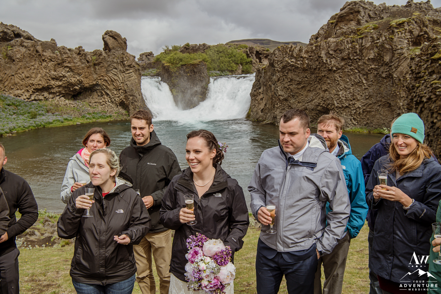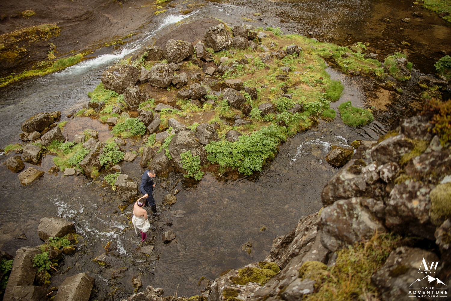 Upon arriving, it was pouring down with rain but the group embraced it, put up their hoods/umbrellas and enjoyed all of what the Icelandic weather had to offer by fully immersing themselves in it. After the ceremony, Rebecca and James put on their waterproof boots and went exploring with their Iceland wedding photographer! Once that location had been fully explored, we headed on to 3 more offbeat waterfalls in the highlands for more exploration and Iceland wedding photos! The adventure concluded at a lovely black sand beach where the group explored by themselves in the sunshine! It in the end, turned into quite the stunning day!