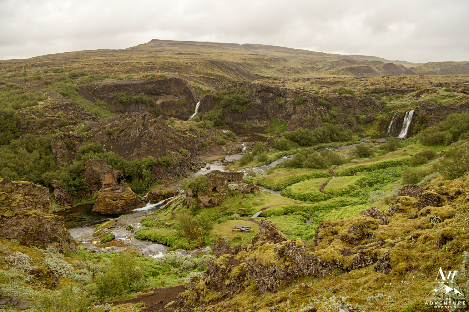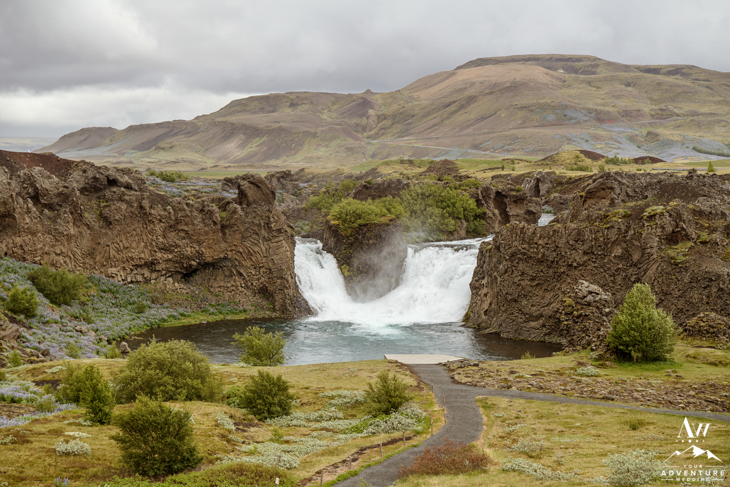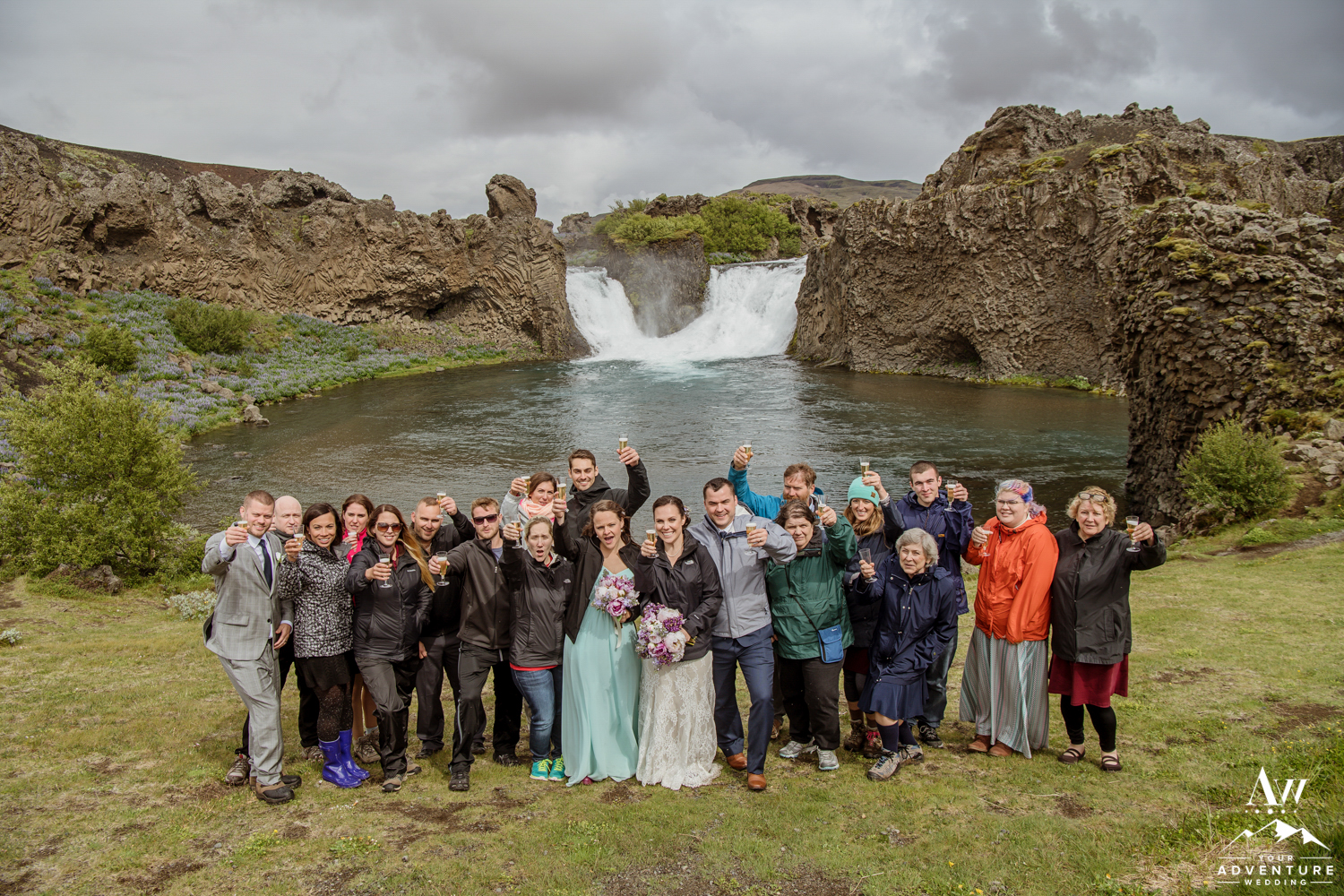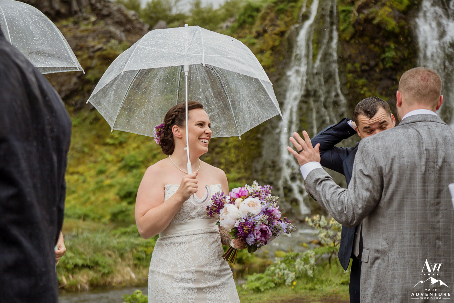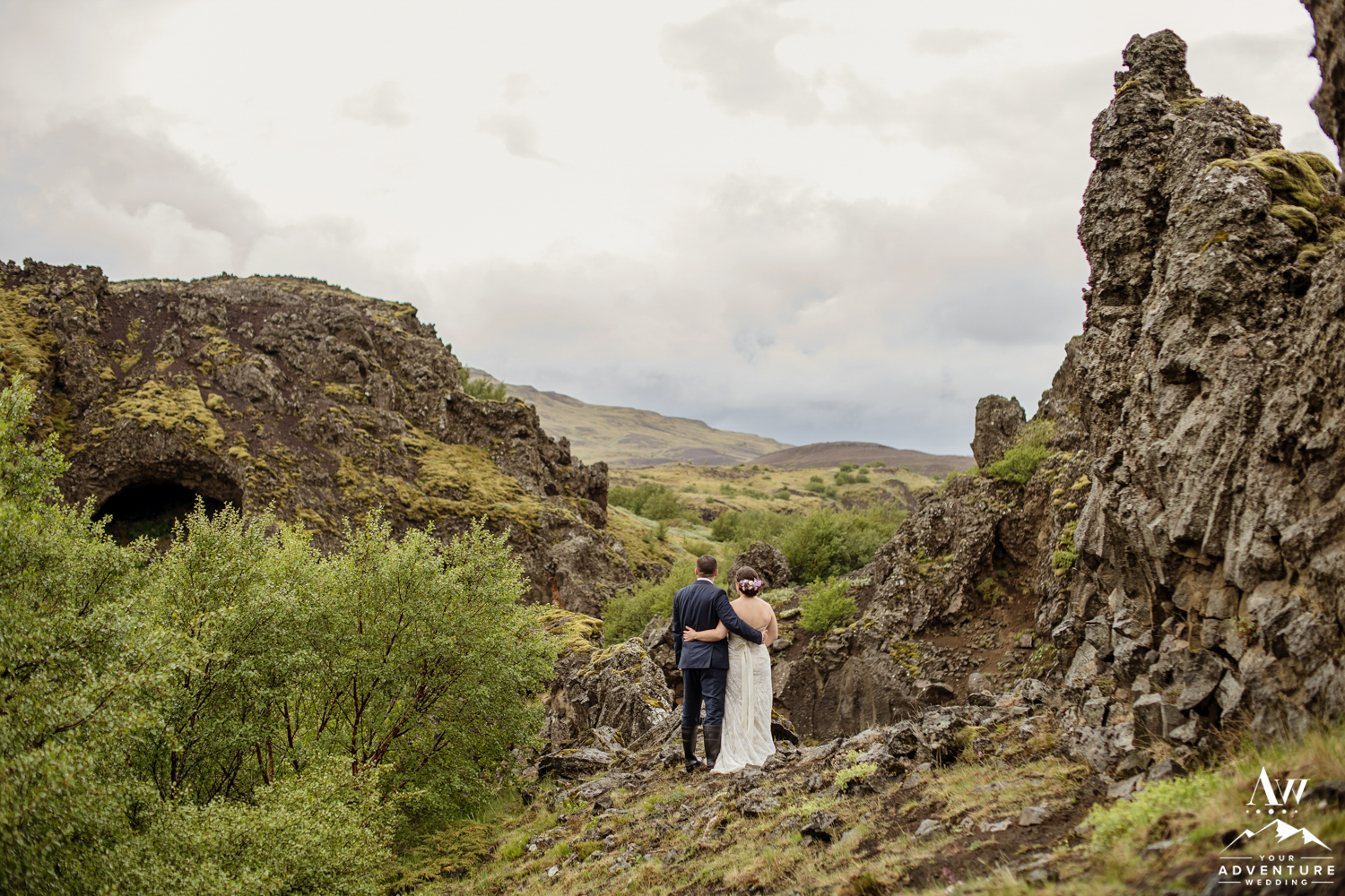 Upon arriving, it was pouring down with rain but the group embraced it, put up their hoods/umbrellas and enjoyed all of what the Icelandic weather had to offer by fully immersing themselves in it. After the ceremony, Rebecca and James put on their waterproof boots and went exploring with their Iceland wedding photographer! Once that location had been fully explored, we headed on to 3 more offbeat waterfalls in the highlands for more exploration and Iceland wedding photos! The adventure concluded at a lovely black sand beach where the group explored by themselves in the sunshine! It in the end, turned into quite the stunning day!