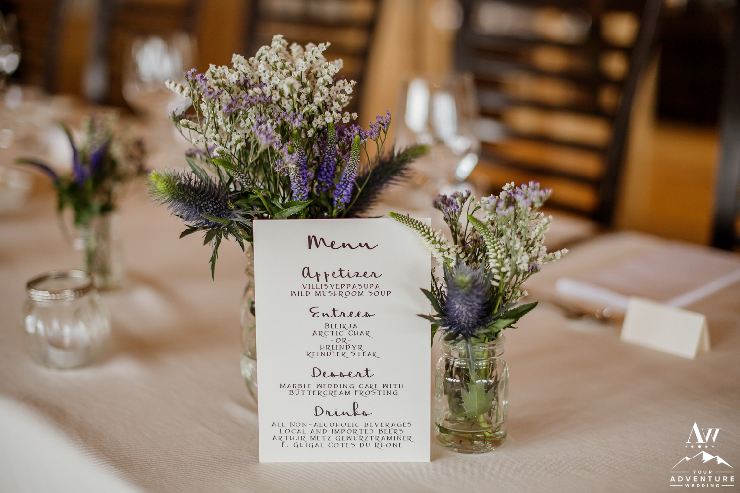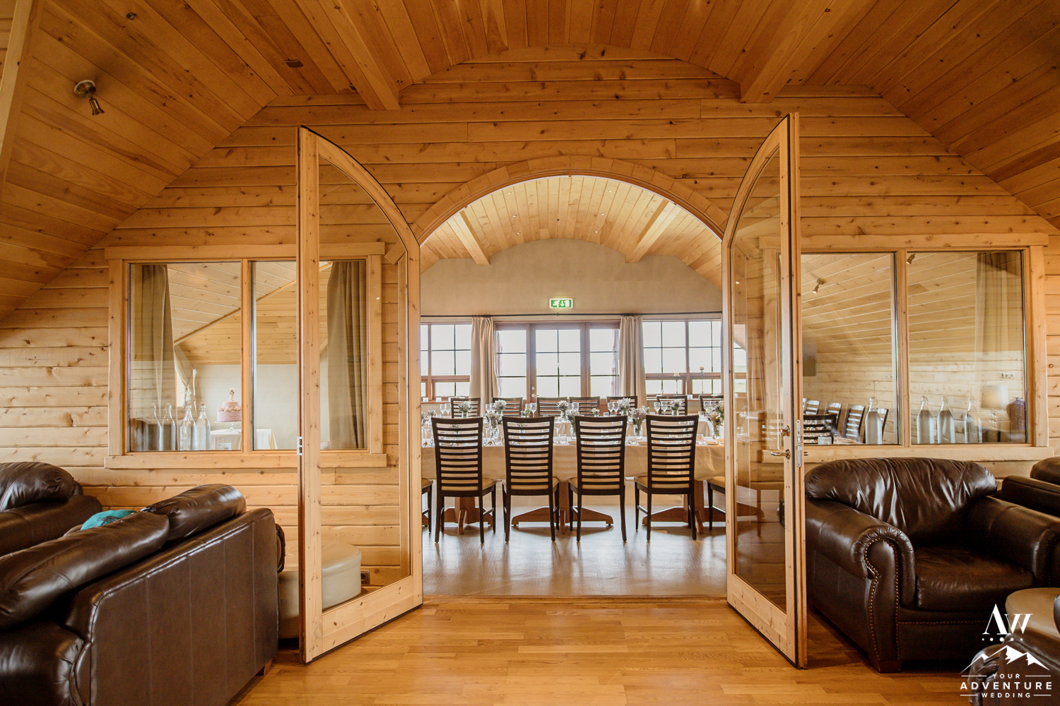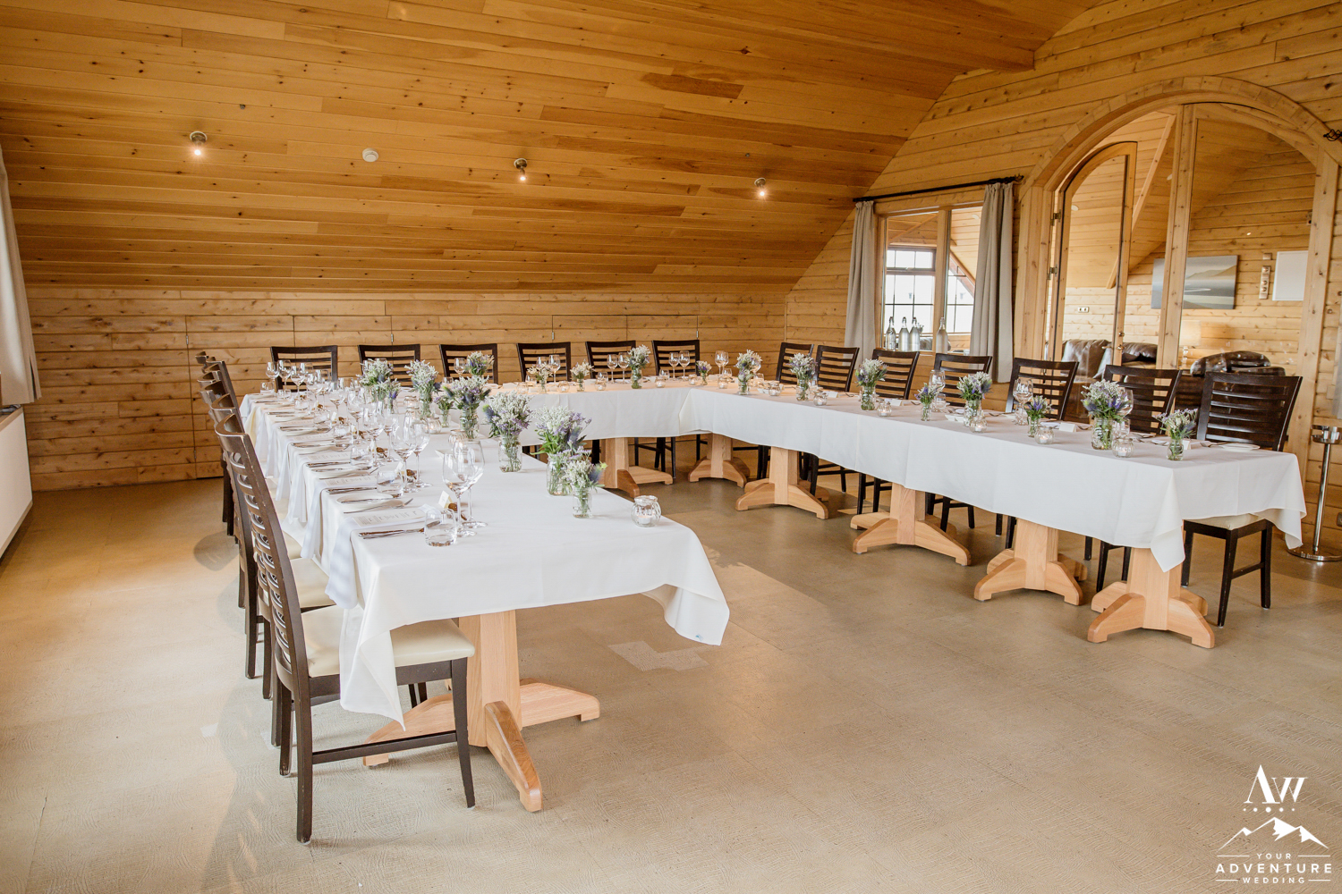 We are firm believers that after an adventure wedding in Iceland the couple and guests need a little rest and refresh time. So once the group delighted in that time, they were invited back to River Hall at Hotel Ranga to enjoy a delicious 3 course Iceland wedding meal. As you will see there were intimate details the guests enjoyed like the wild flowers, menus, and the ambiance the candles brought overlooking the beautiful Ranga River!
