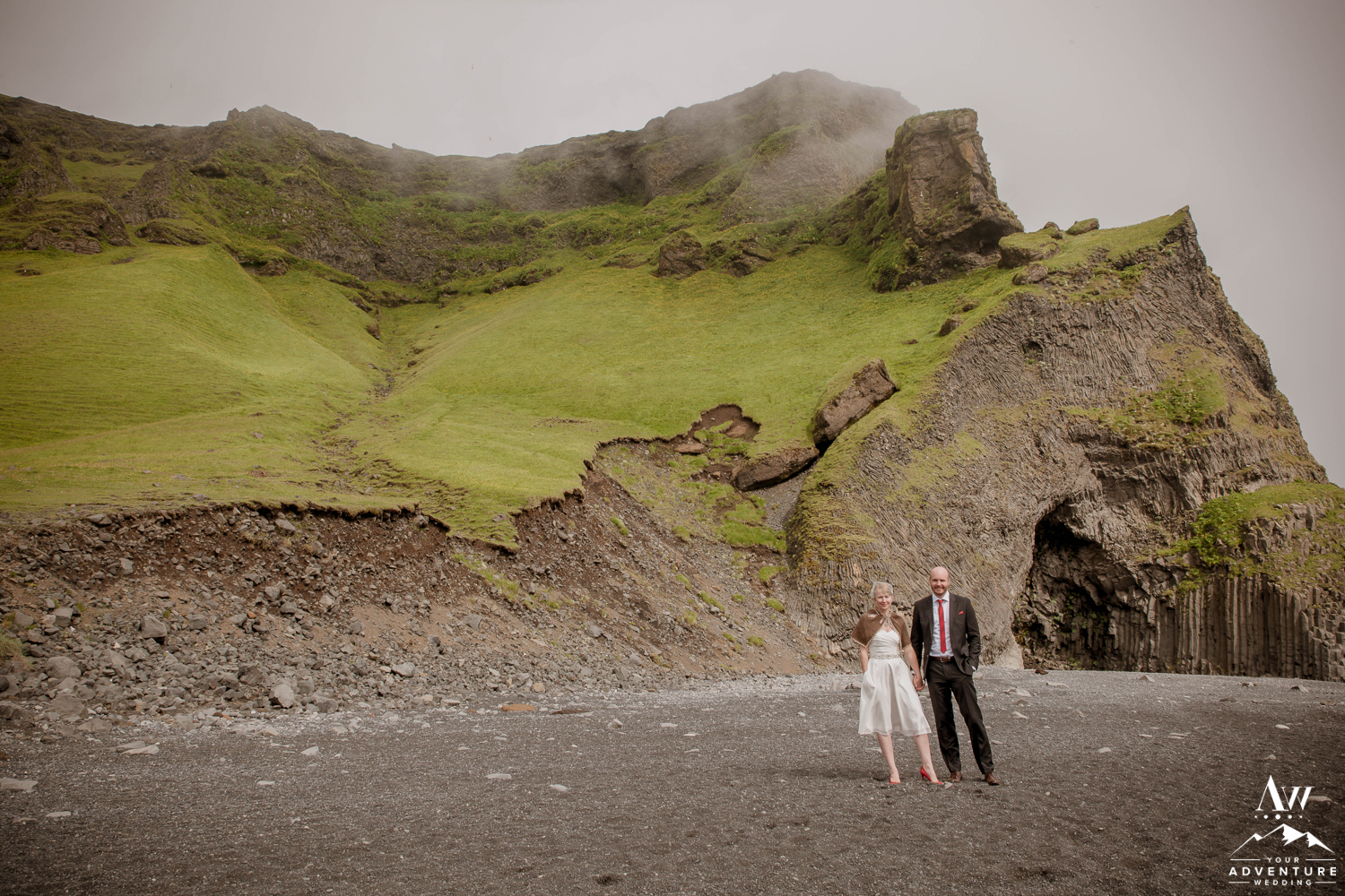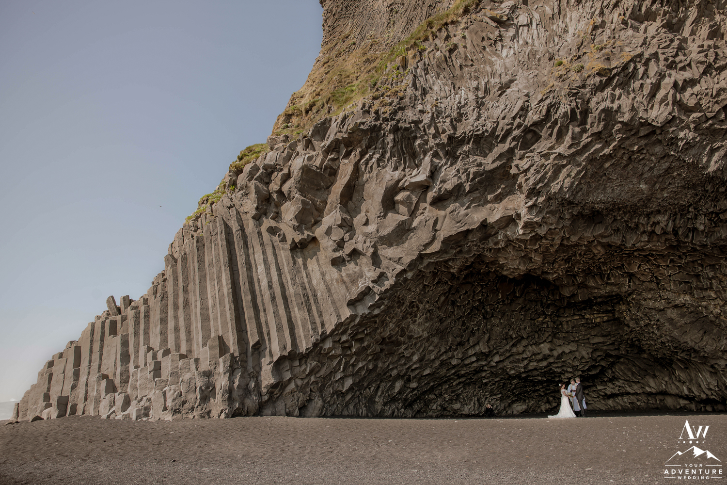 If you are dying to have your wedding in a cave or you need to seek shelter during your adventure wedding in Iceland (and you didn’t hire Iceland Wedding Planner, so you could delight in one of our secret/private wedding cave venues), there are still some options for you, don’t worry! For example, Reynisfjara Black Sand Beach Cave can be an option for you during the Spring-Fall wedding season in Iceland (but only during low tide times, you can check tide levels HERE). There are actually three caves within the one location (see the Iceland wedding photo images below). Just be aware that, more often than not you will be joined by dozens to hundreds of onlooking tourists, and potentially other wedding couples, at any given time inside the cave.