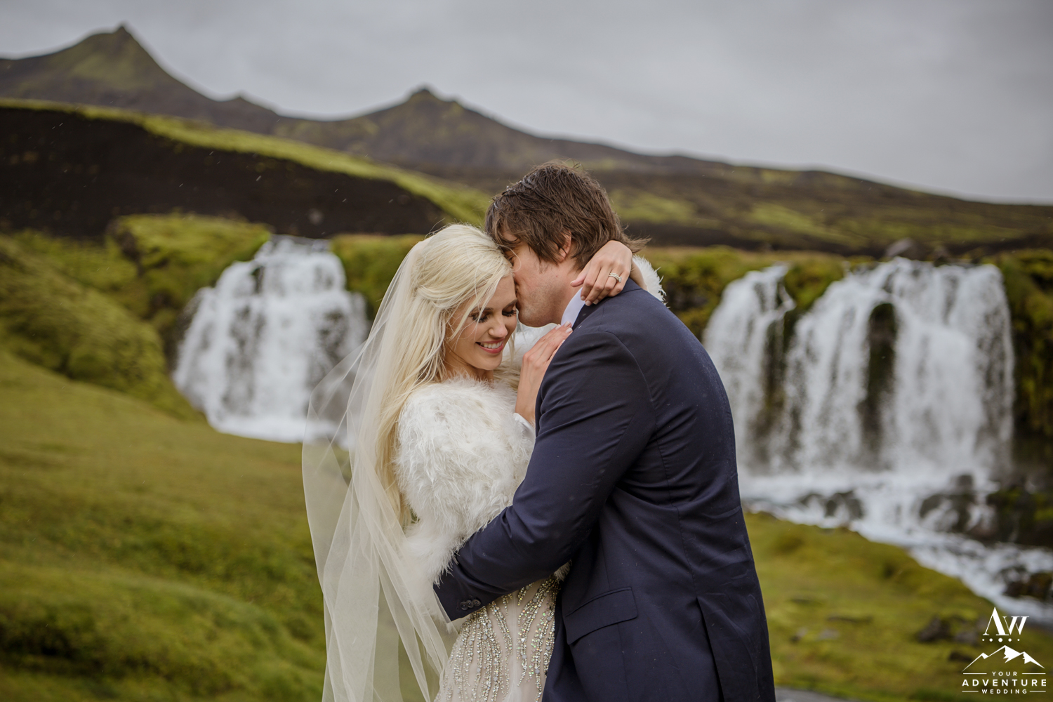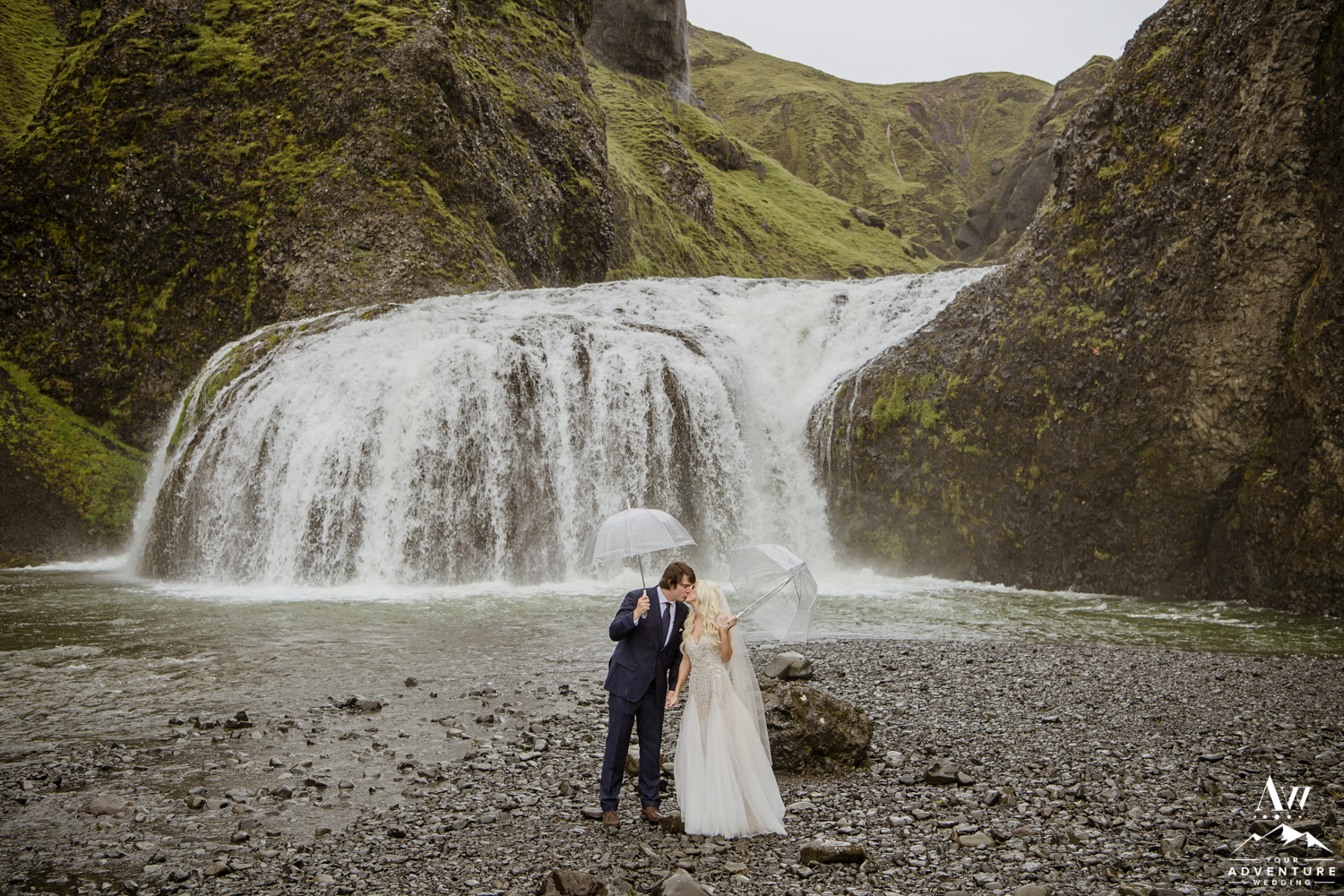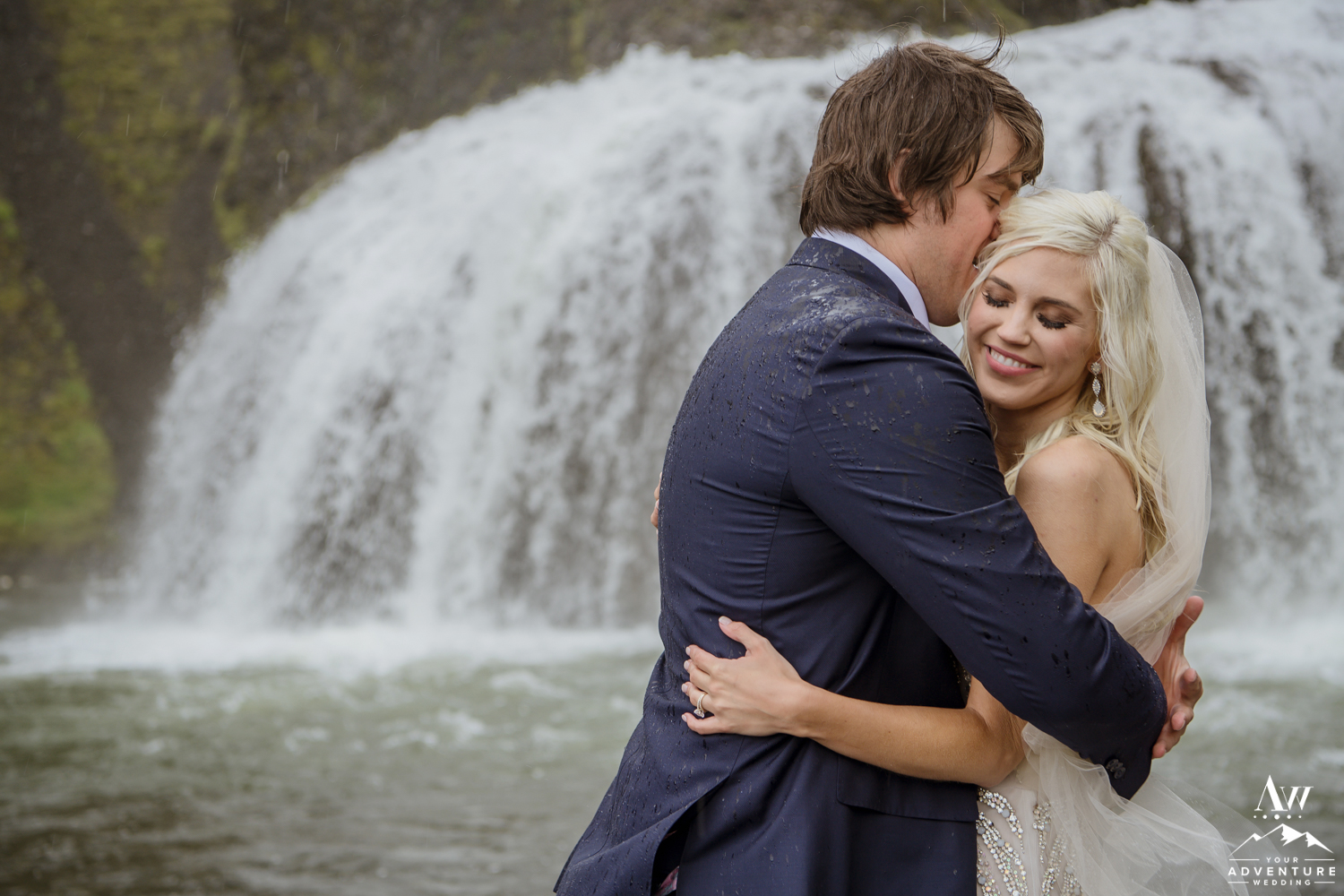 The super jeep team lined up outside of the hotel, ready for Cameron and Beau’s half day Iceland adventure wedding day. Everyone was boasting with excitement! But first, our Iceland Wedding Planner and super cool video team (White in Revery) grabbed Cameron and Beau and headed to the first location of the day for a intimate first look at a secret waterfall. A perfect kickoff to their luxury adventure wedding! It’s super nice if having an Iceland wedding with guests, to have a few minutes before to yourselves. Despite the pouring rain, Cameron and Beau embraced it by literally dancing and laughing in it and were all smiles!