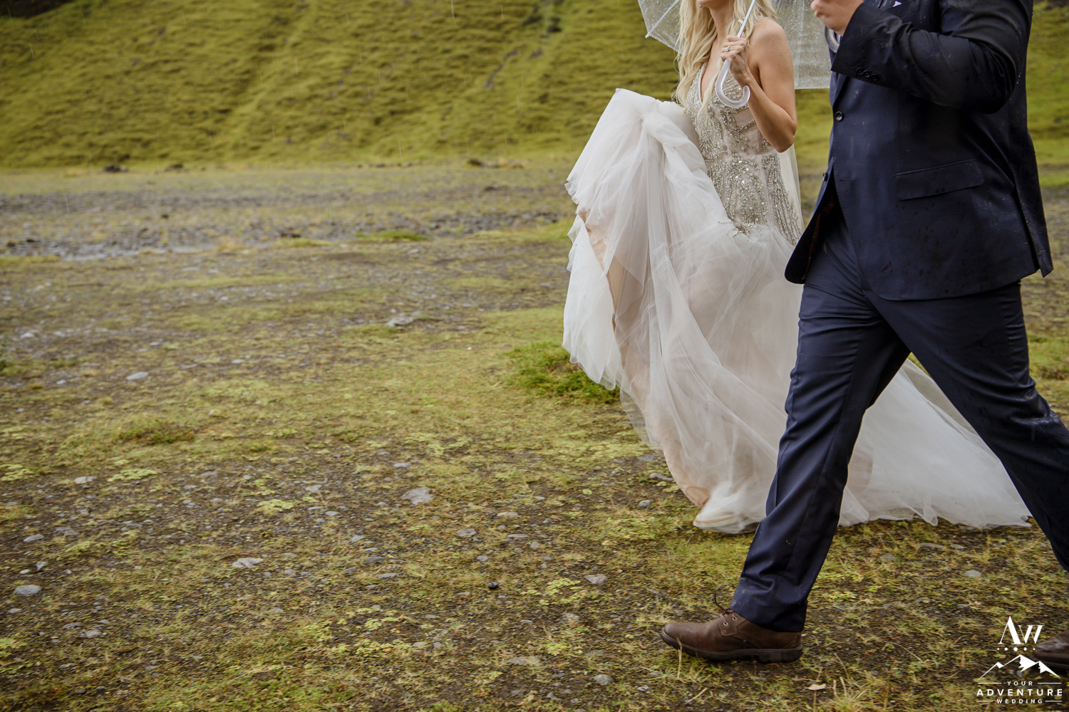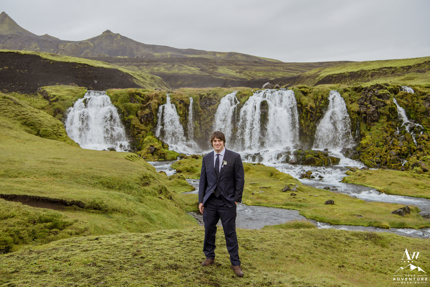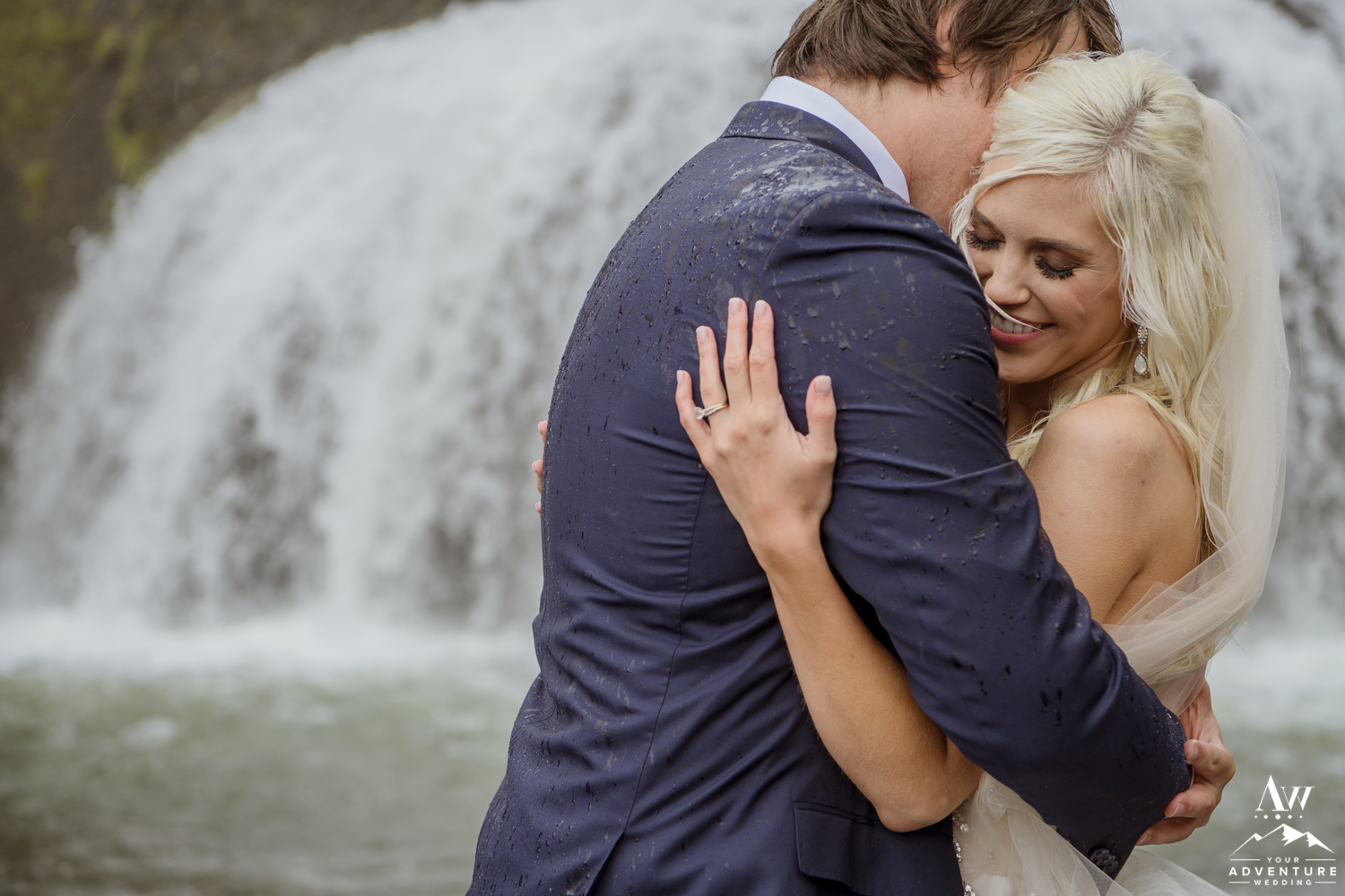 The super jeep team lined up outside of the hotel, ready for Cameron and Beau’s half day Iceland adventure wedding day. Everyone was boasting with excitement! But first, our Iceland Wedding Planner and super cool video team (White in Revery) grabbed Cameron and Beau and headed to the first location of the day for a intimate first look at a secret waterfall. A perfect kickoff to their luxury adventure wedding! It’s super nice if having an Iceland wedding with guests, to have a few minutes before to yourselves. Despite the pouring rain, Cameron and Beau embraced it by literally dancing and laughing in it and were all smiles!