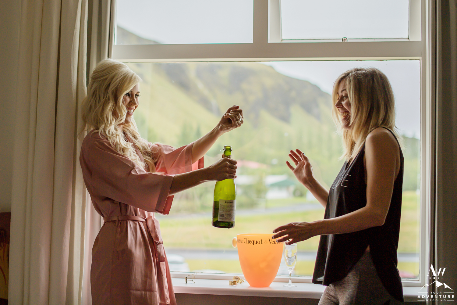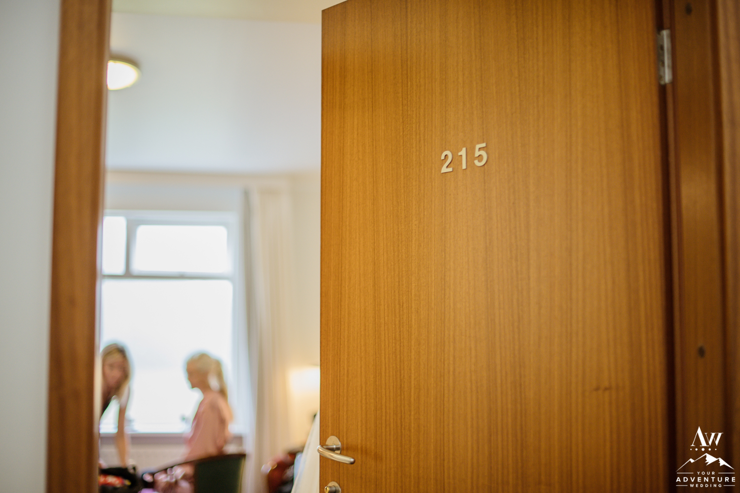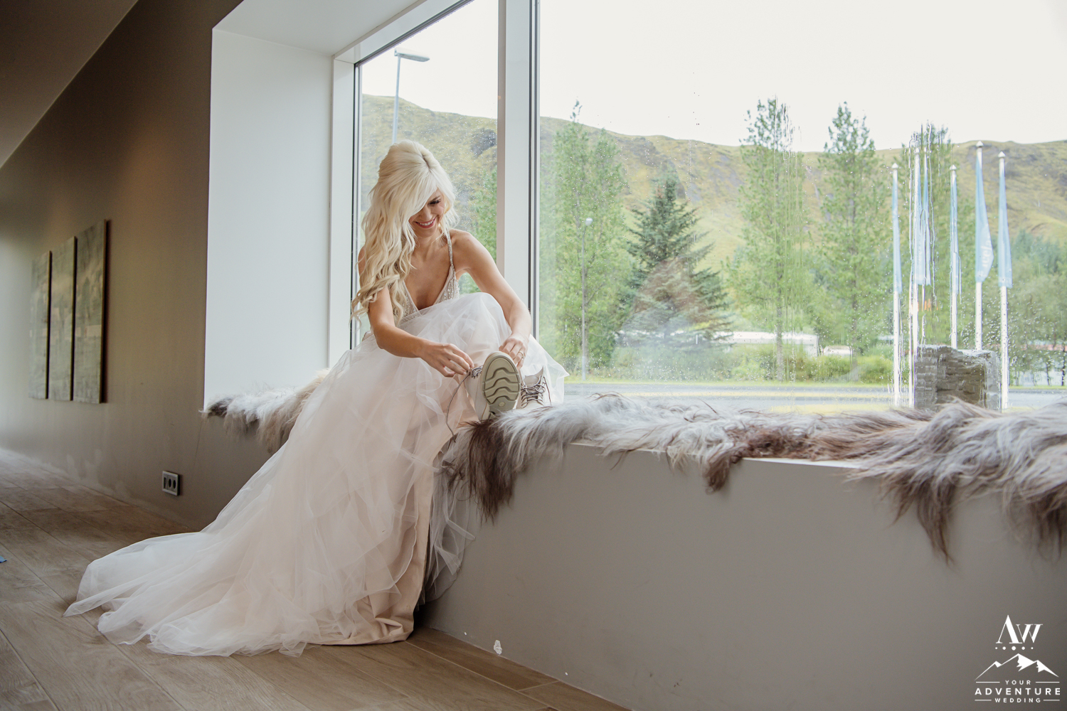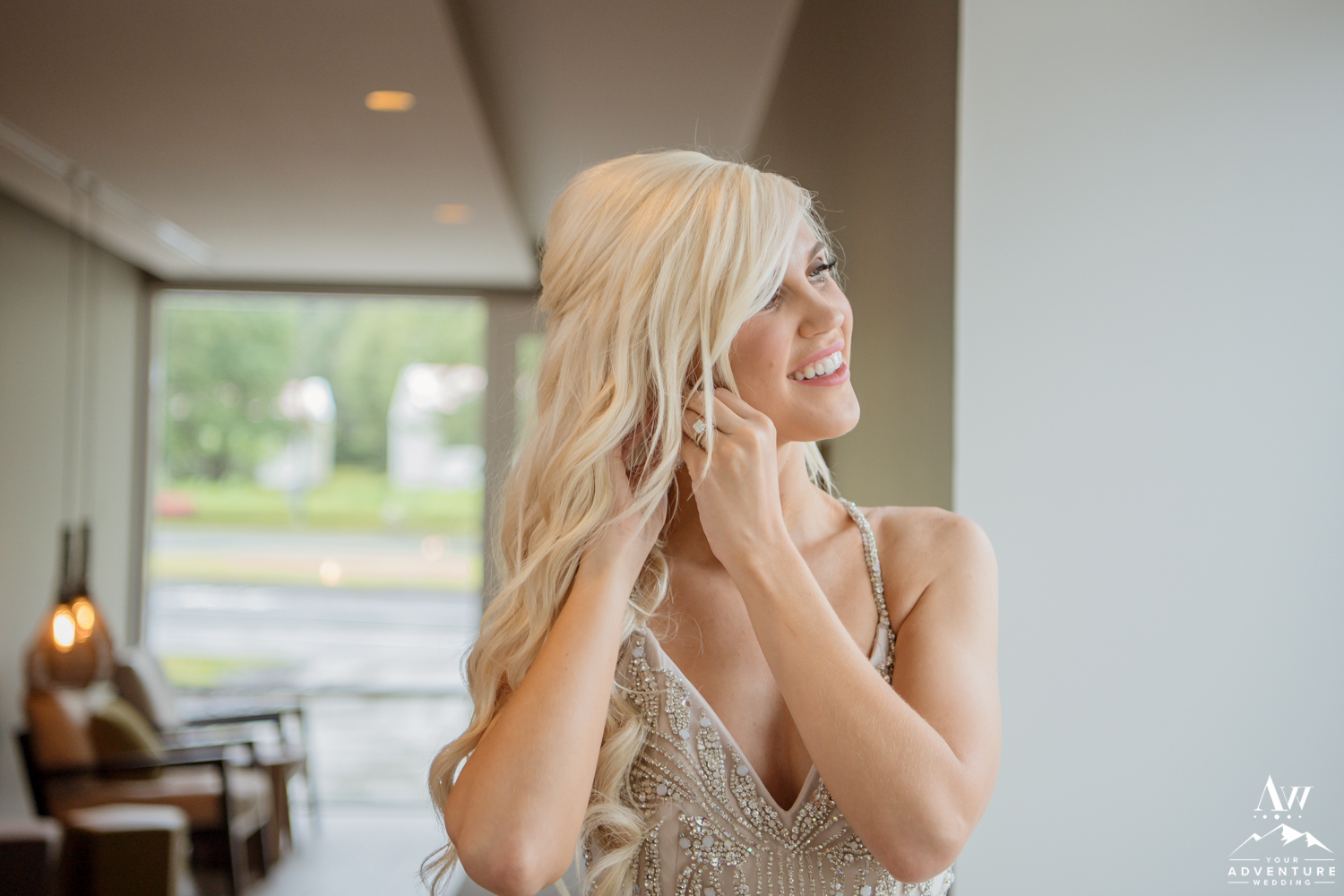 The rainy but lovely foggy morning began at Icelandair Klaustur around 9am with a delicious breakfast, champagne, and Cameron’s talented sister (Blonde Fayetteville) doing her hair and makeup. Oh my gosh, you MUST see Cameron’s glamorous Iceland wedding details… From the captivating Haley Paige wedding dress (Thanks- Tesori Bridal), to the stunning ring, earrings, and adventure wedding boots (Timberlands).