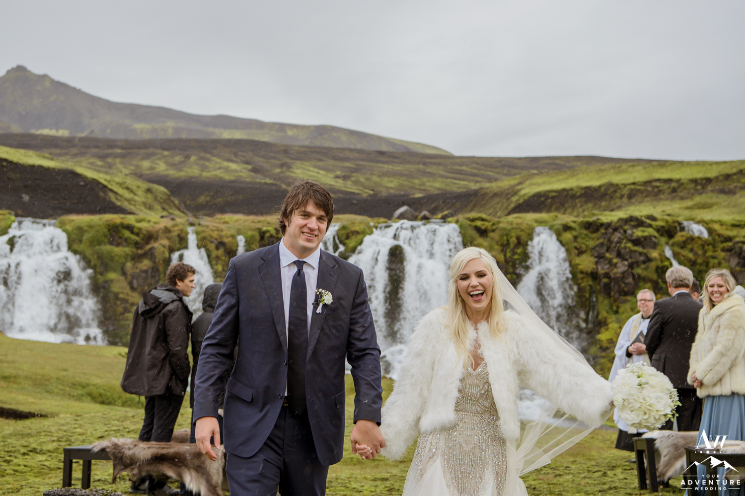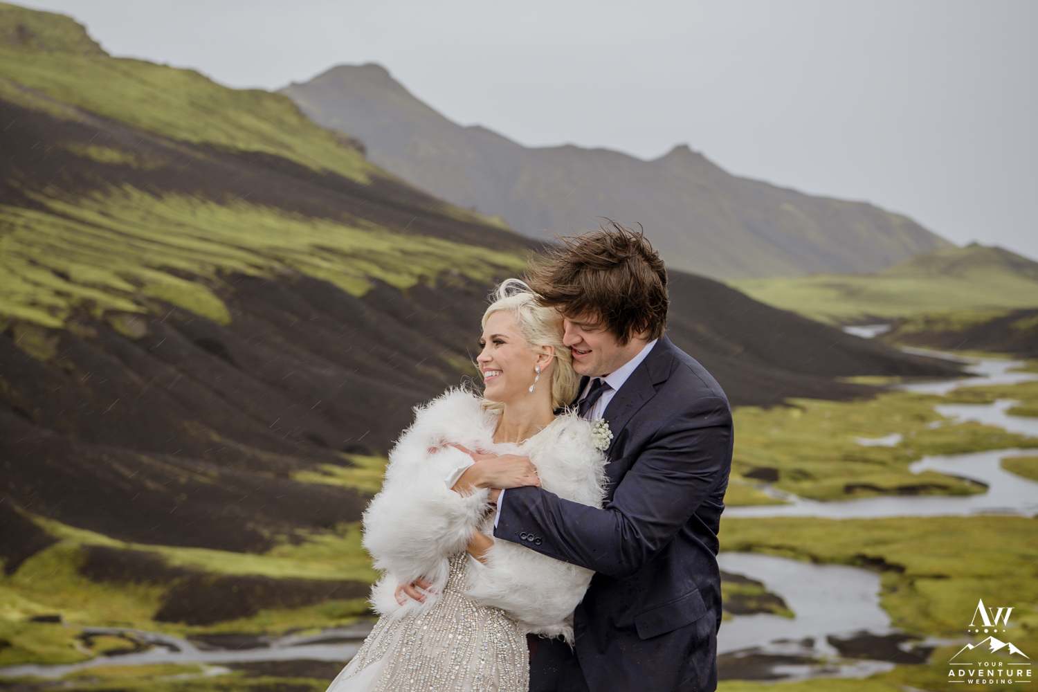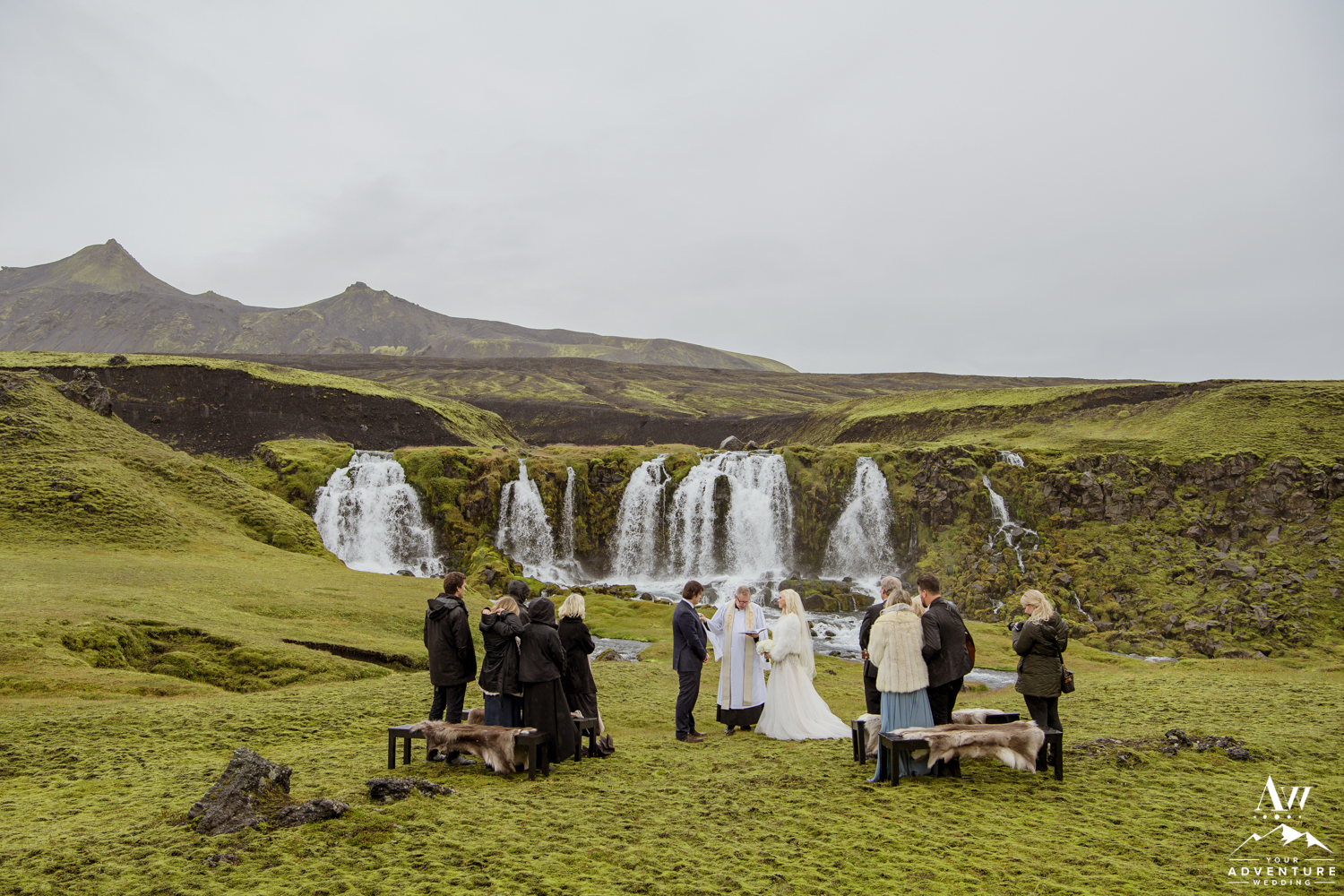 Cameron and Beau invited 10+ of their loved ones with them to Iceland to join in on the intimate exploration the mysterious Icelandic highlands during their custom adventure wedding. Since epic, private, and luxury were priorities on their list of “must haves” for an Iceland wedding location, our team transported them to a stunning secret waterfall where they professed their lifetime commitment to each other. Keeping their guests comfy despite the rain was also important, so the twist of luxury of having black benches and reindeer furs were perfect!