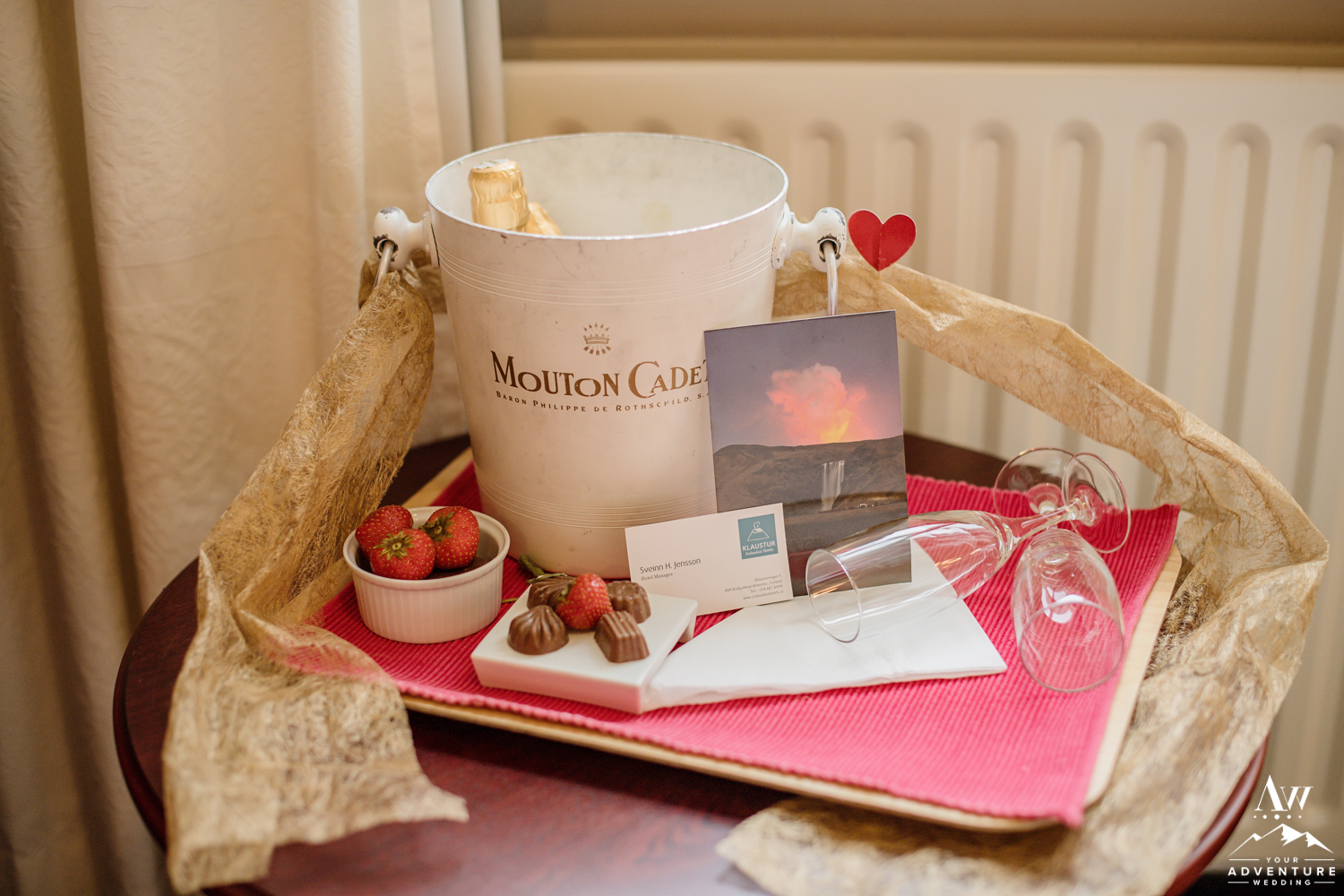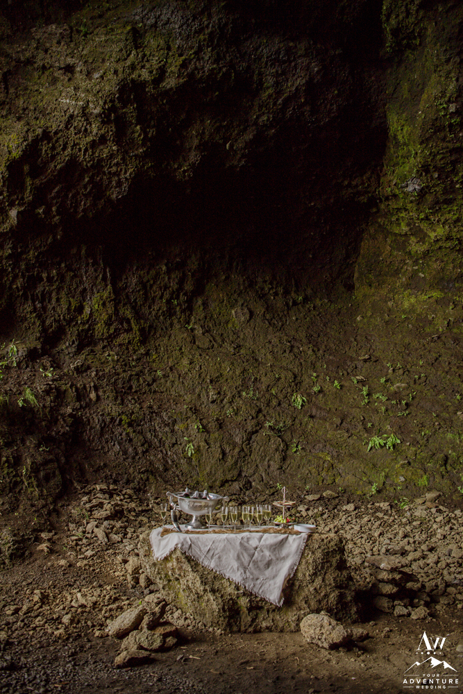 Everyone loaded back into the super jeeps, curious to know where the next awesome place was… Beau + Cameron surprised their guests with having a luxury champagne toast in a fantastic natural cave! It was the perfect place to seek shelter in from the rain and the ideal “morale boost” during an adventure wedding day. Our Iceland Wedding Planner team had a beautiful luxurious champagne toast ready for these two love birds and their guests! A delicious shout out to our friends at La Caravelle and Hafliði Ragnarsson (HR Chocolates)!