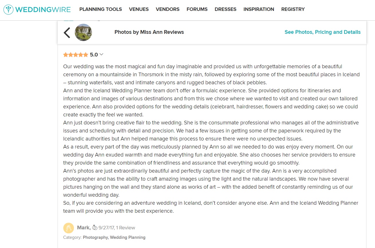 We are tried and true having planned over 100 Iceland adventure weddings and elopements. So today we would like to share with you some of the firsthand reviews from our Iceland wedding planner clients… See more on Google, The Knot, and Wedding Wire.