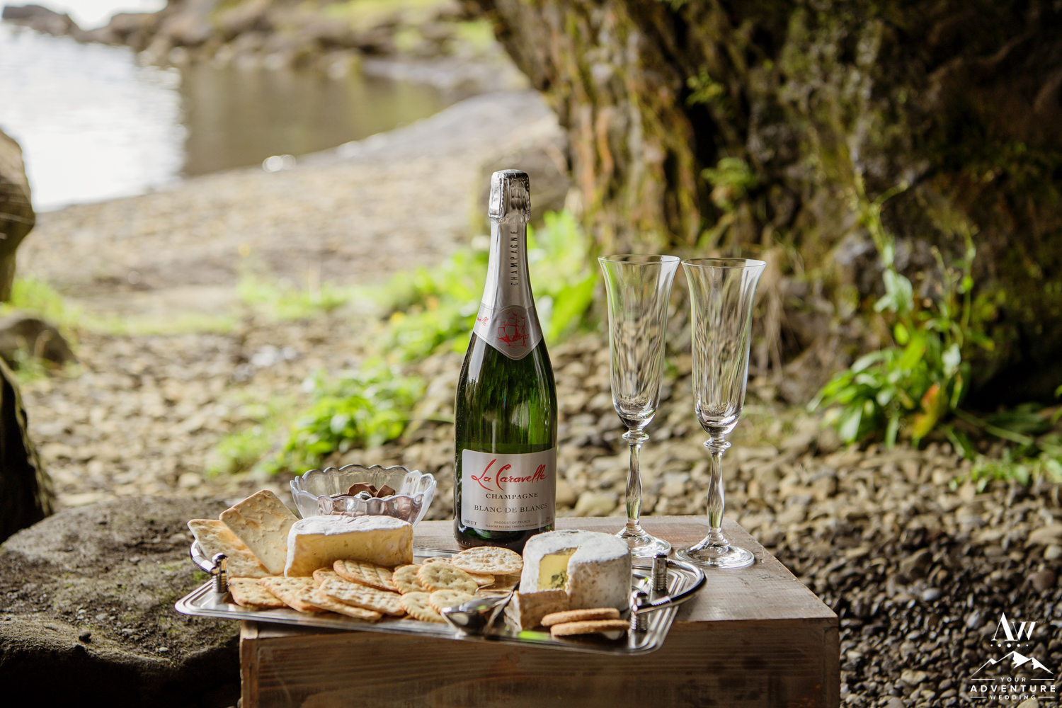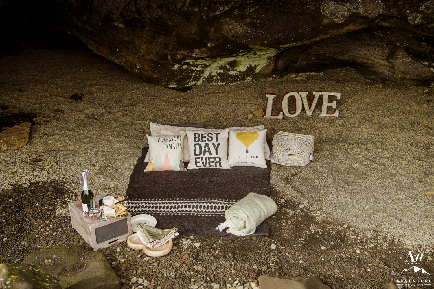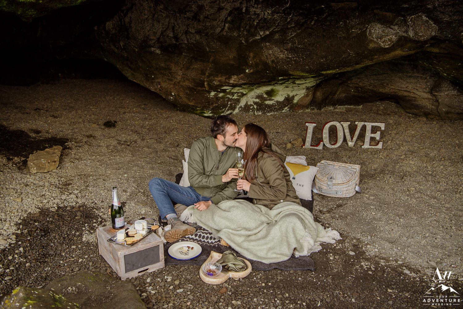 Moments later Gustavo filled Natalia in on what was happening… No tour today to Landmannalaugar, but instead they get to celebrate their LOVE and engagement with someone even more thrilling, a luxury picnic in Iceland! After a short hike they were introduced to their private (and secret) cave where a beautiful surprise picnic was setup by our Iceland Wedding Planner team! Delicious details like La Caravelle champagne, lovely cheese plate, Icelandic chocolates, cozy pillows and blankets!