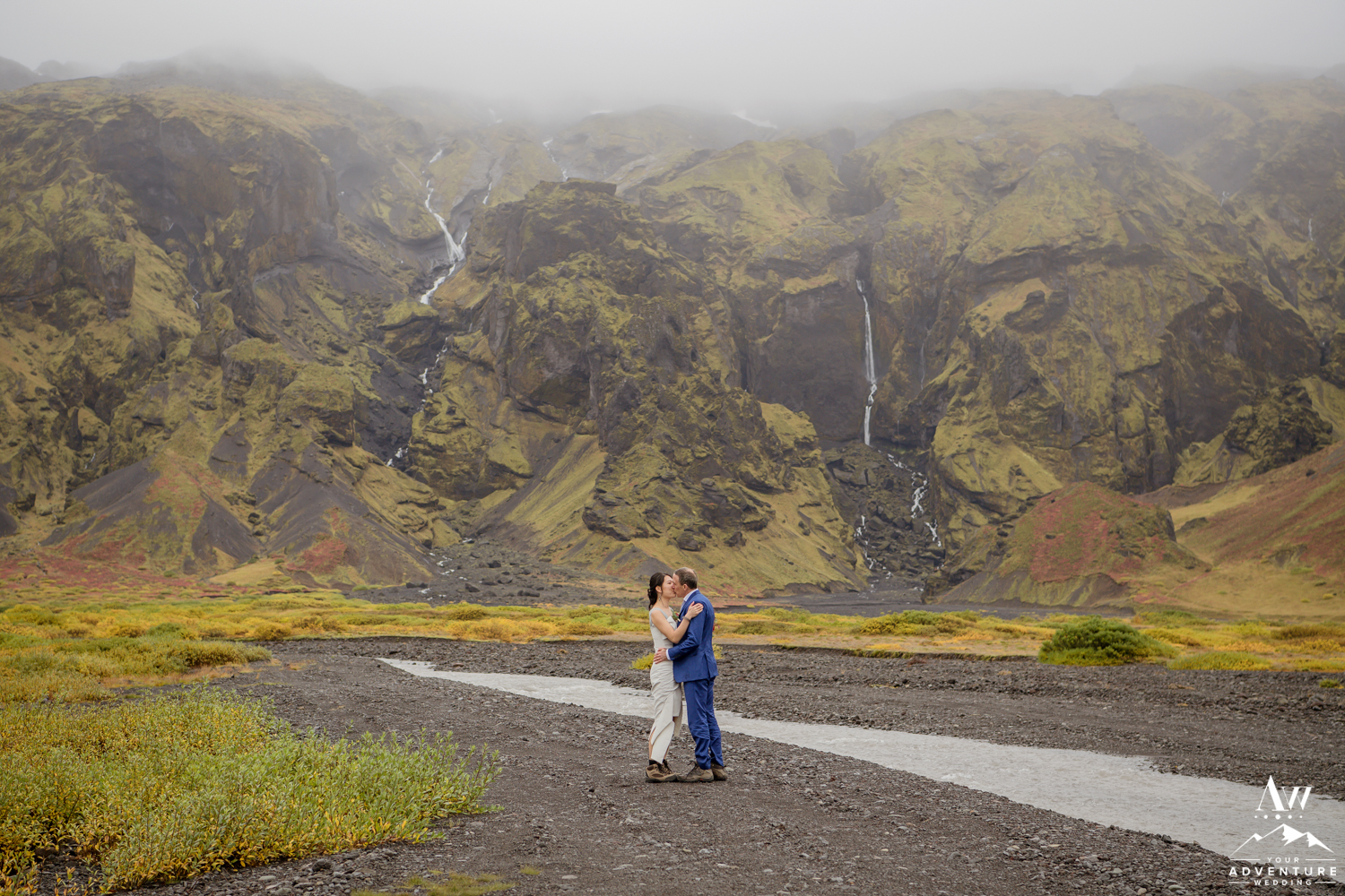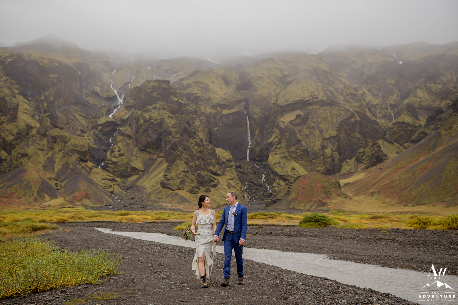 The adventure continued as they hiked down from the mountain.  It seemed like the fog kept following them lower and lower so it seemed they had just finished their Iceland wedding ceremony just in time before more weather came in.  The path was muddy, stony, and steep in parts but these two powered through it with their hiking boots, lots of laughs, jokes, and big fat smiles on their faces!  The colors of fall just beginning were such a beautiful backdrop for their Iceland wedding photos!