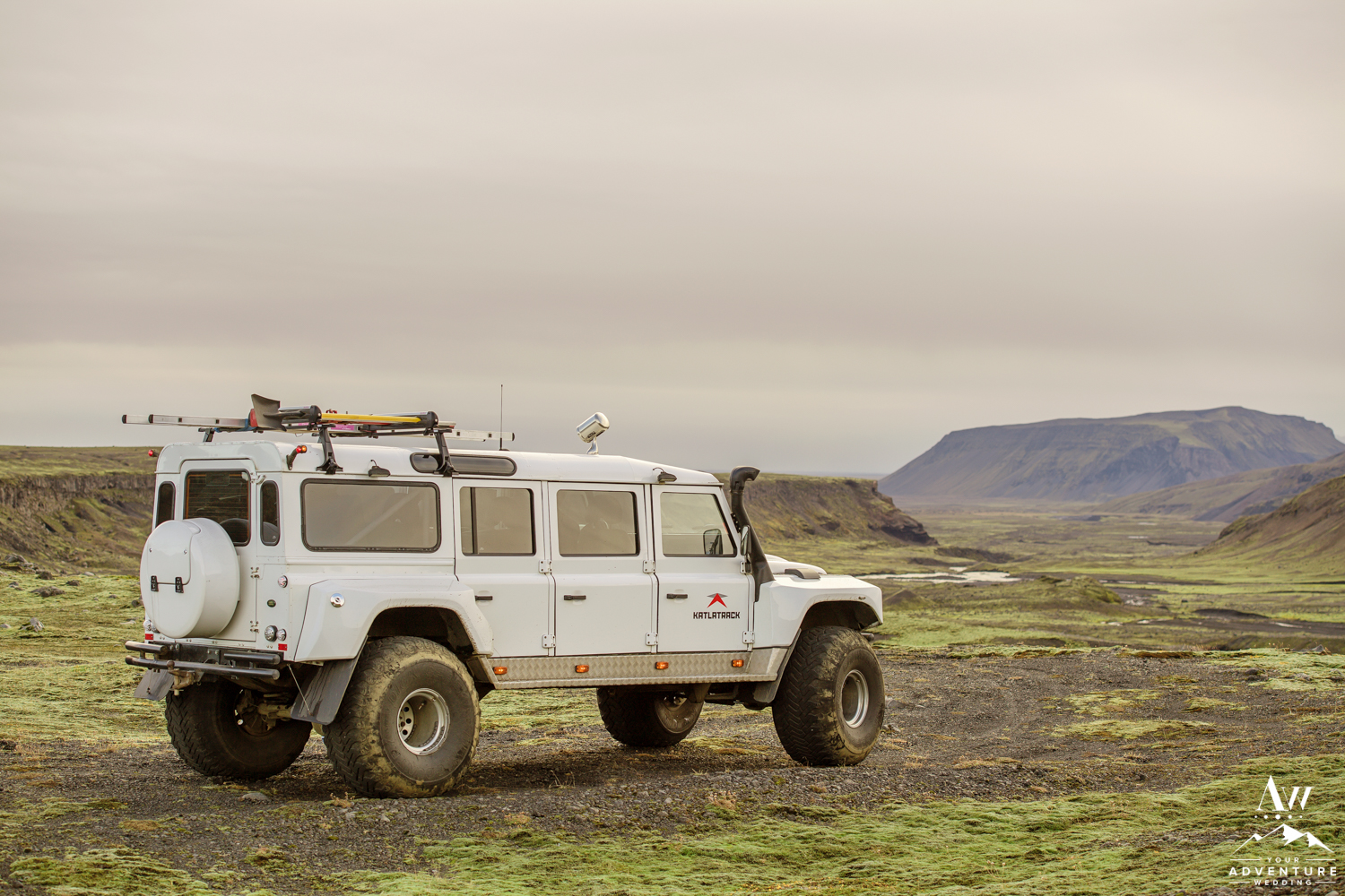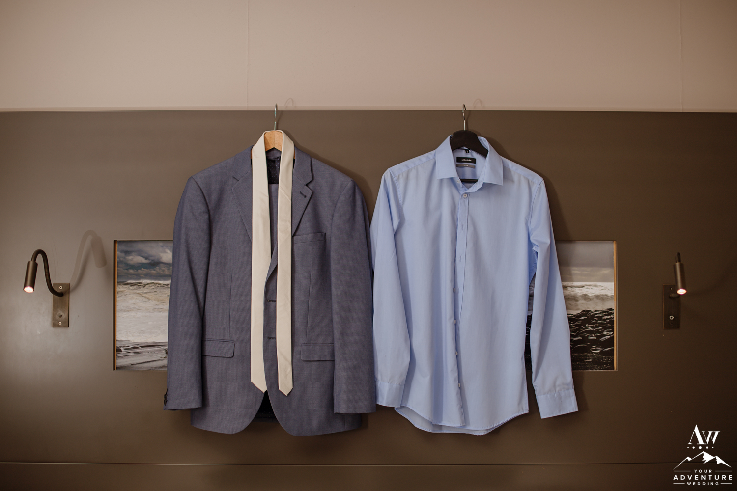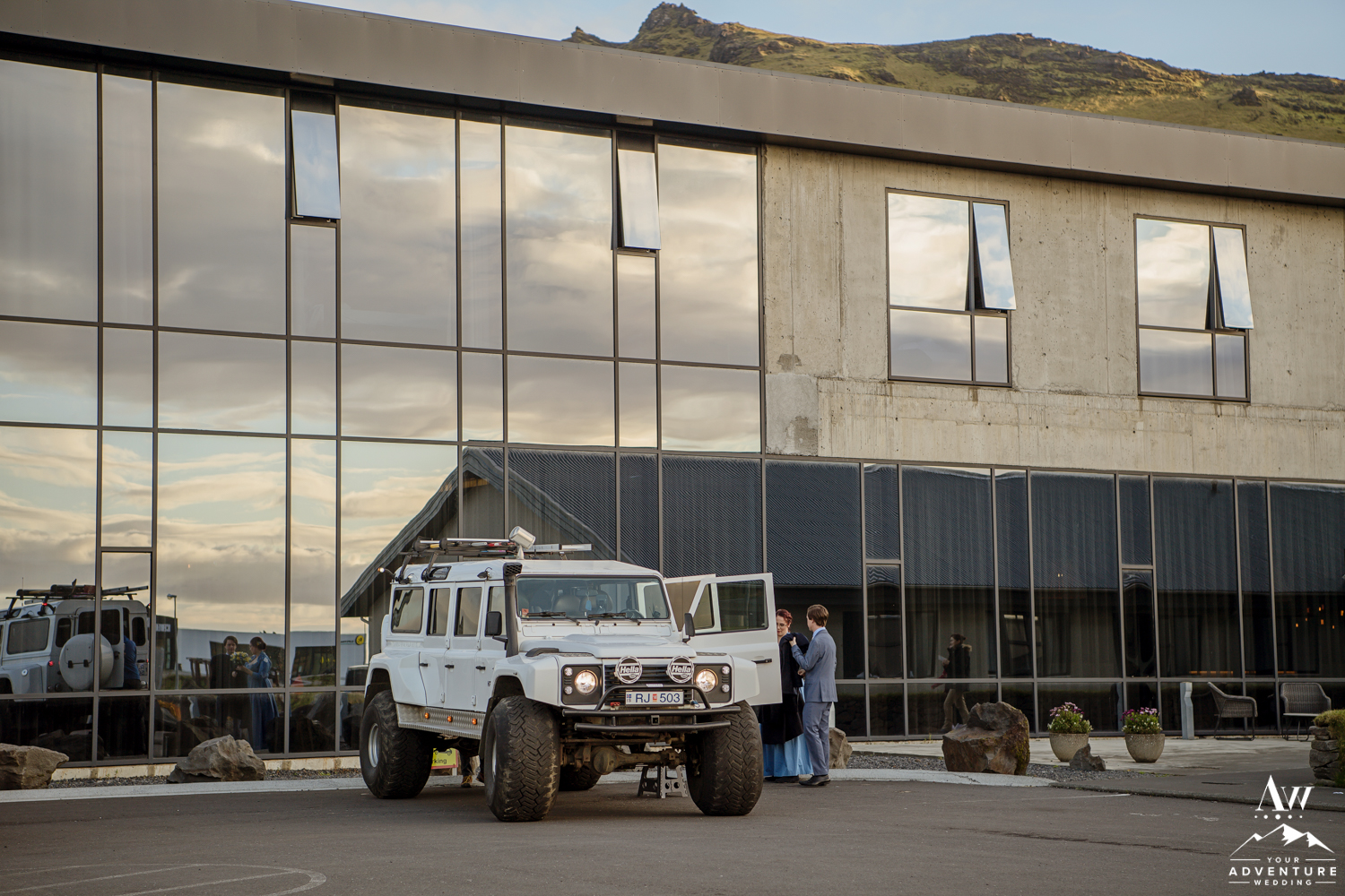 Let’s talk about Katy’s amazingly BLUE wedding dress! As you likely read in one of our previous how to pick an Iceland Wedding Dress, it’s nice to be a contrast in the middle of the landscape you’ll be venturing through. Then to compliment her dress, David wore a handsome gray suit, making him into a very dapper groom! As 8am drew near, our team and the fabulous couple headed downstairs to load into the super jeep for the day!