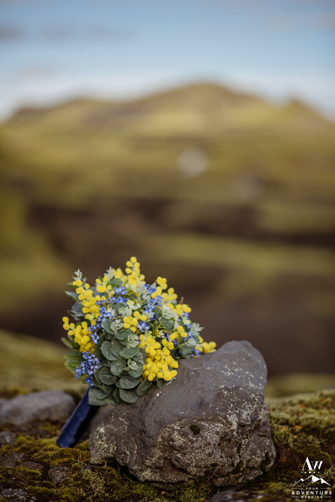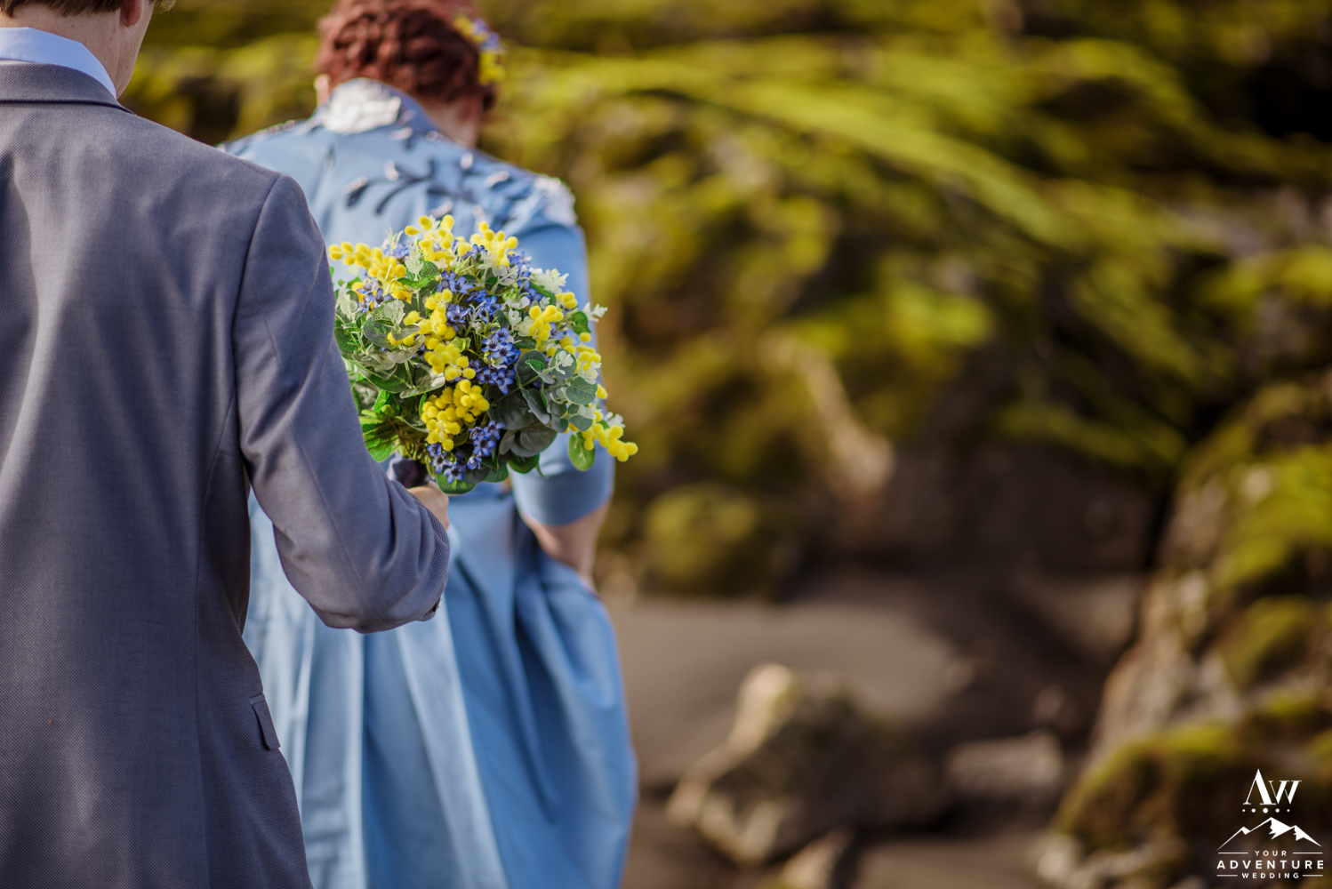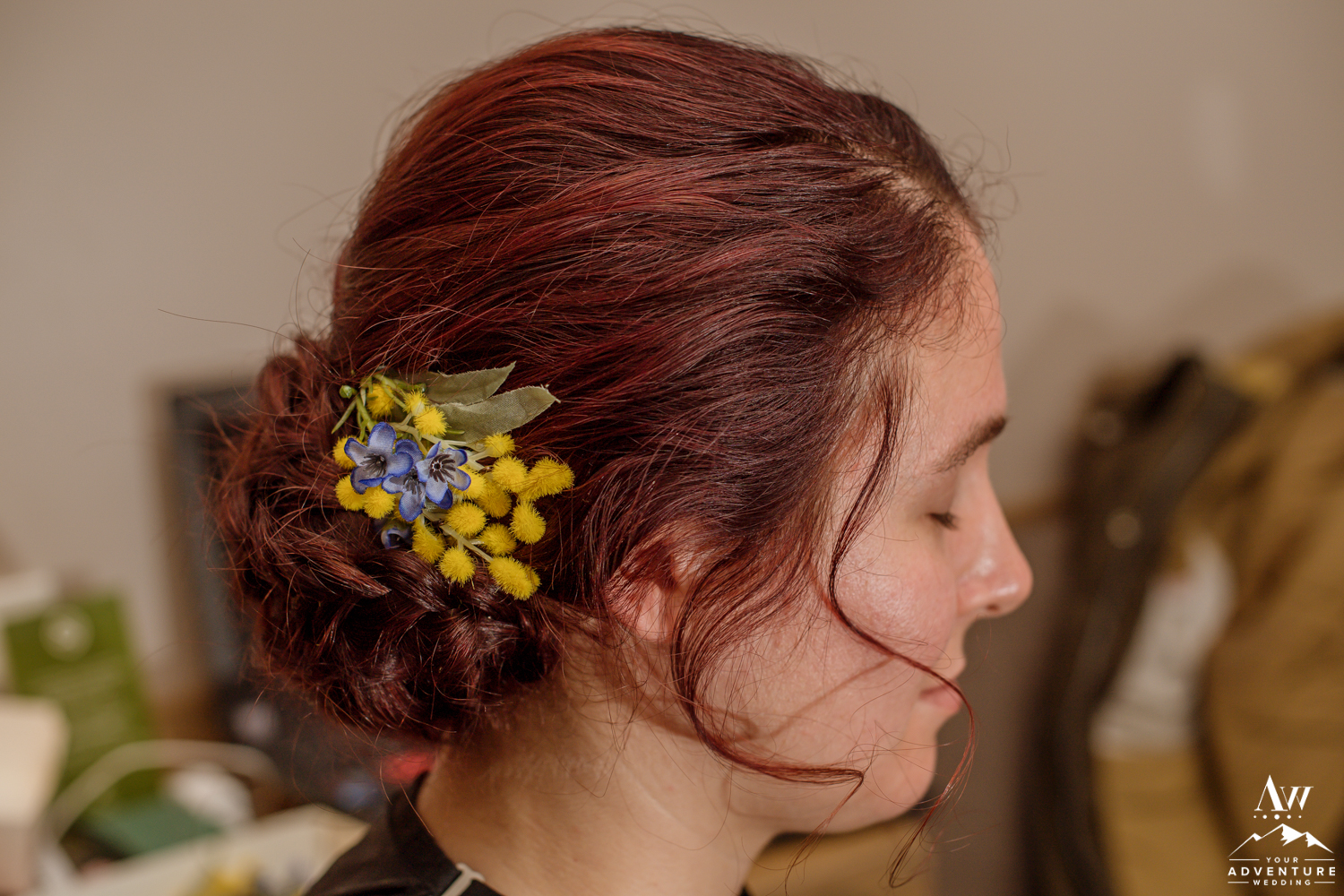Katy + David’s Iceland elopement began at one of our favorite hotels, Icelandair Vik. Having an elopement adventure in Iceland with us means you get up very early (most begin between 5-6am) with our fantastic hair and makeup teams. Katy decided to bring her own silk flowers that had many flowers that were native to Australia as a little piece of home with them. The bright yellow flowers proved to be a nice “pop” of color for their Iceland wedding photos. And speaking of color…
