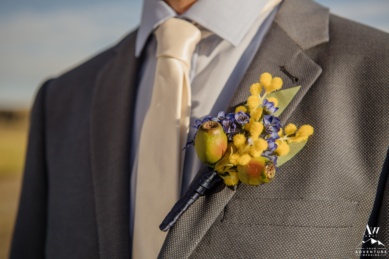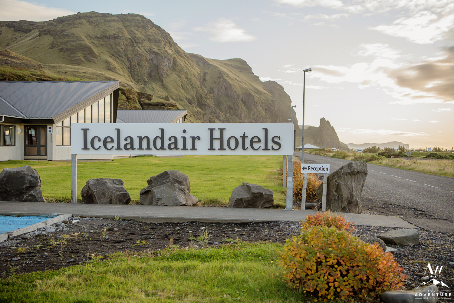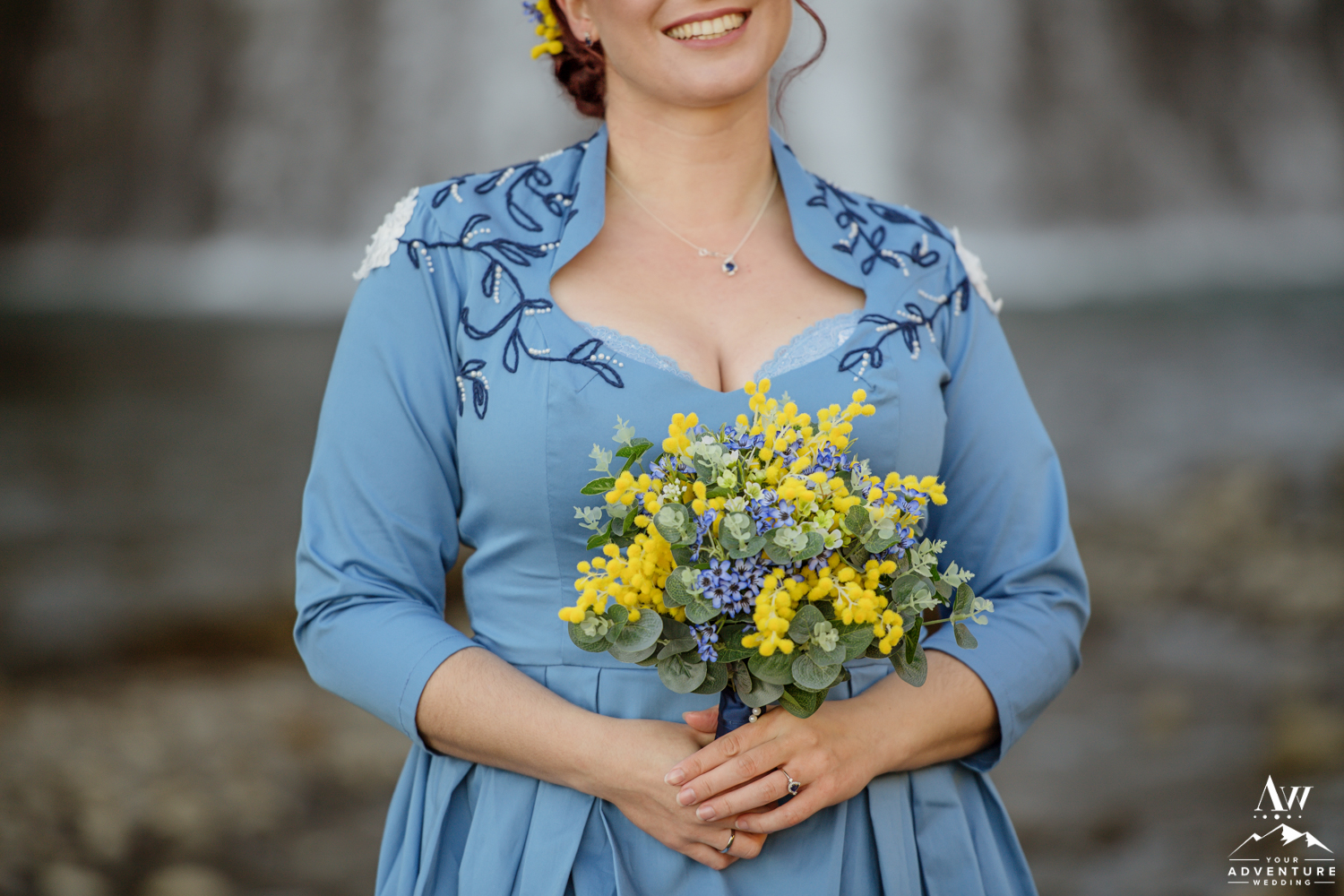 Katy + David’s Iceland elopement began at one of our favorite hotels, Icelandair Vik. Having an elopement adventure in Iceland with us means you get up very early (most begin between 5-6am) with our fantastic hair and makeup teams. Katy decided to bring her own silk flowers that had many flowers that were native to Australia as a little piece of home with them. The bright yellow flowers proved to be a nice “pop” of color for their Iceland wedding photos. And speaking of color…