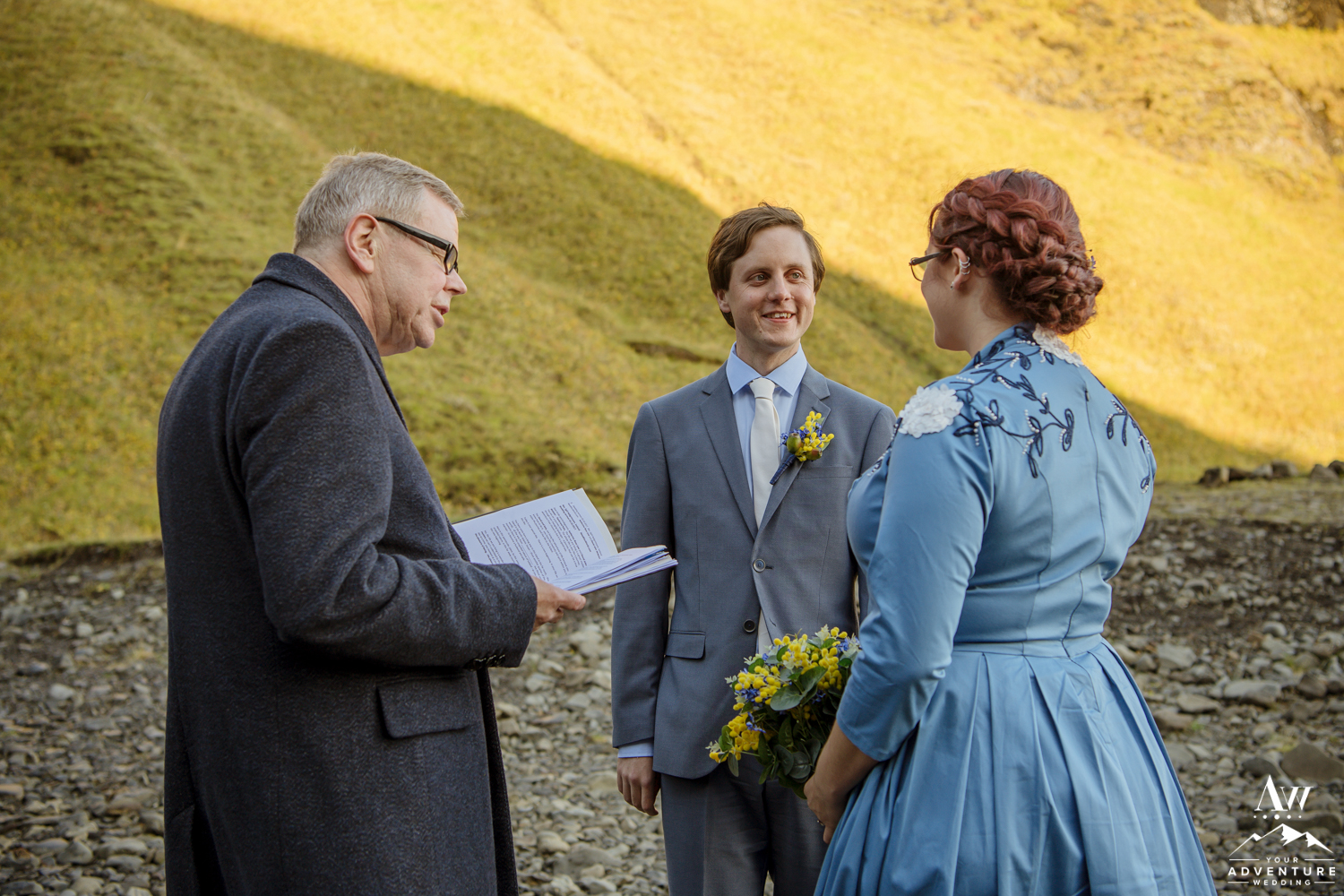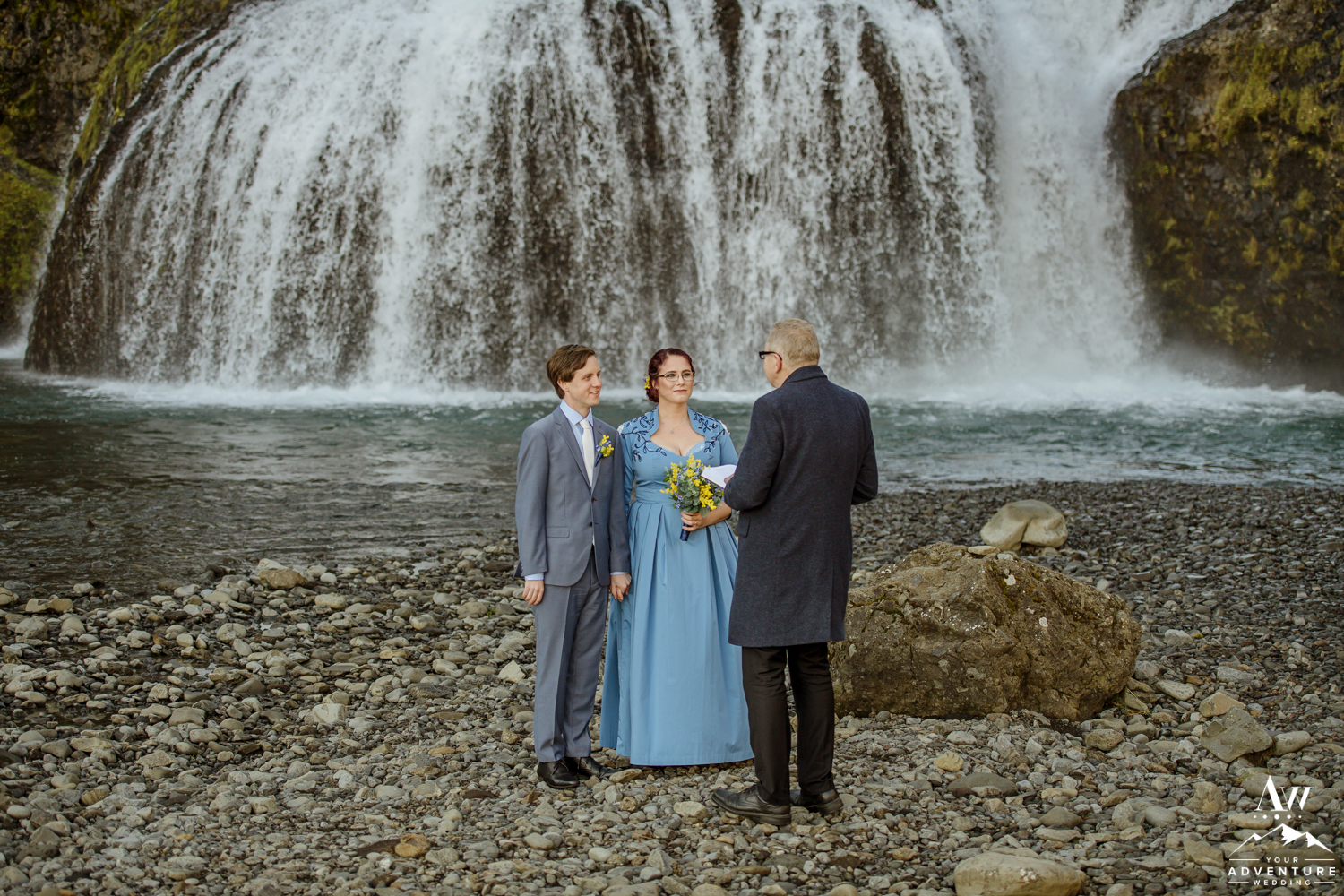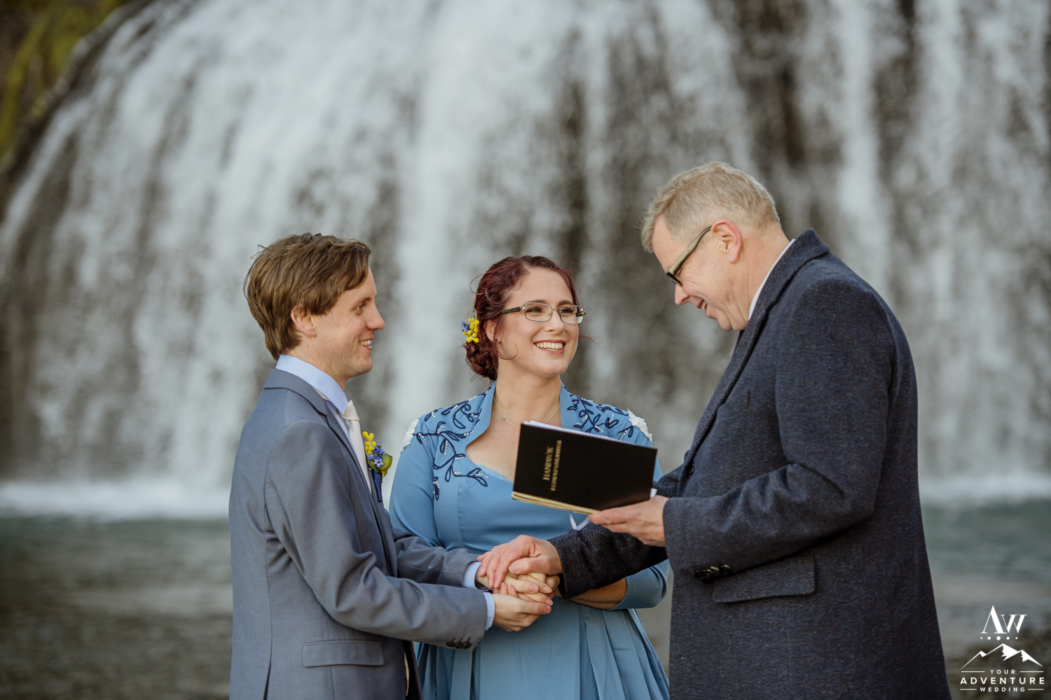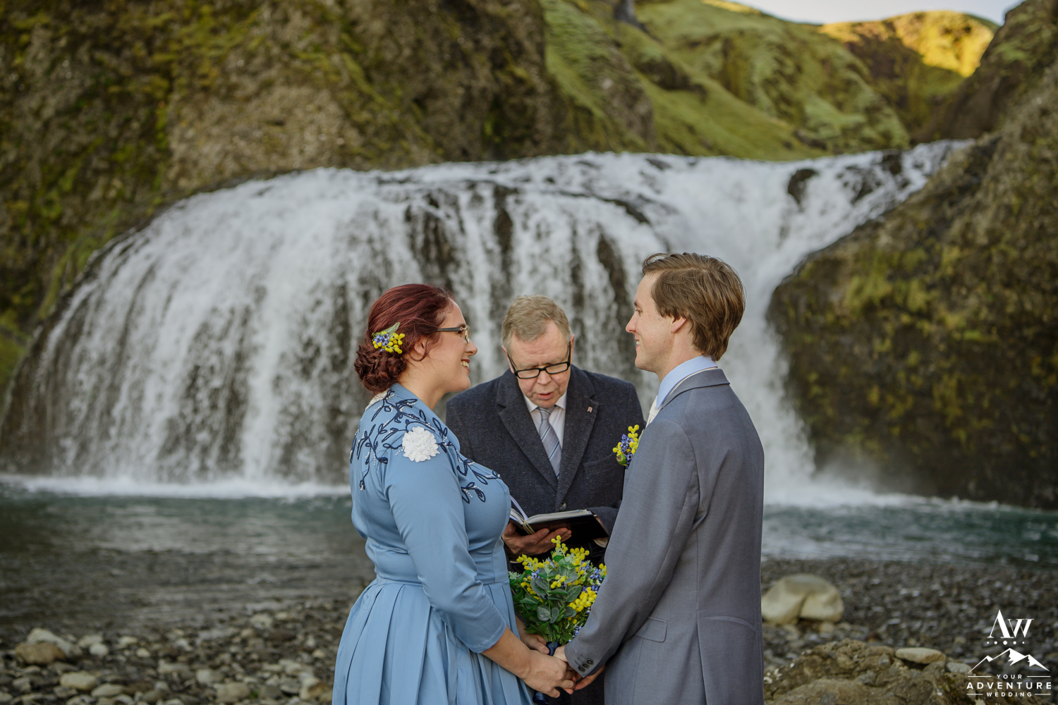 The adventure officially kicked off and everyone was on their way to an offbeat waterfall for the Iceland wedding ceremony. The excitement was high! Upon arrival to the waterfall, they had a nice 5 minute hike to the waterfall. It was there that Pastor Egill performed a moving and inspirational marriage ceremony that was exactly what David and Katy envisioned.