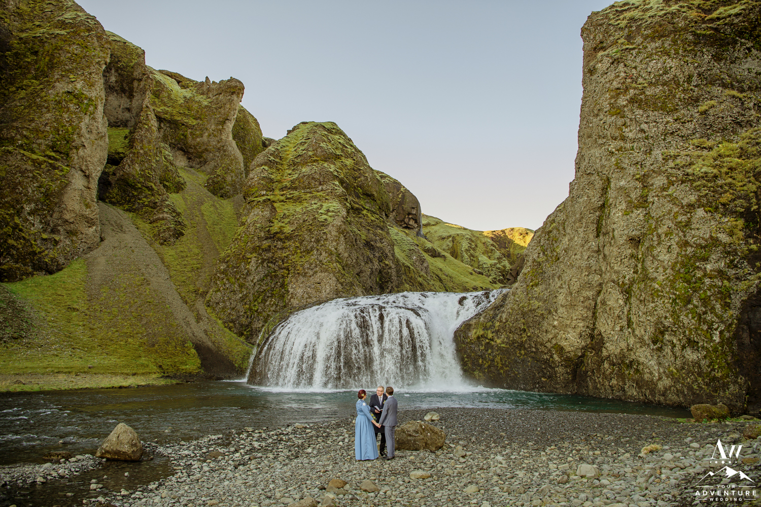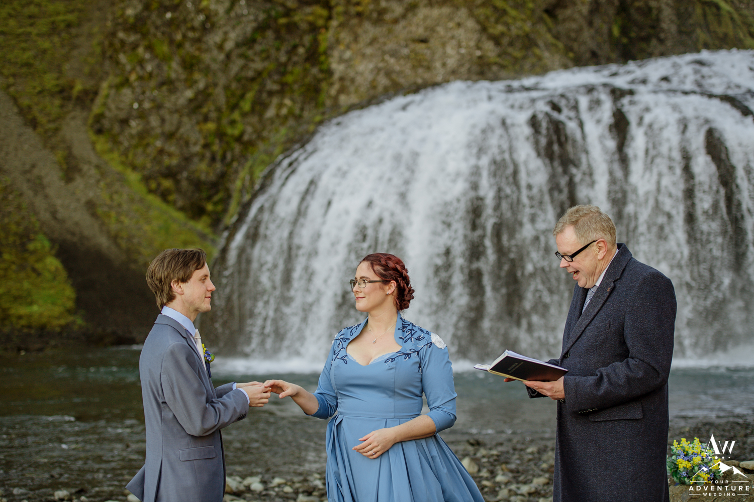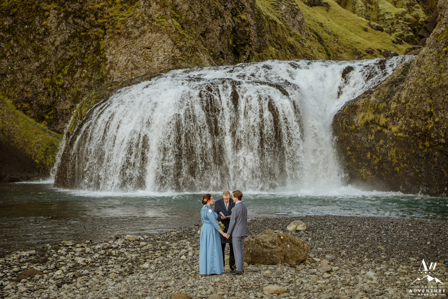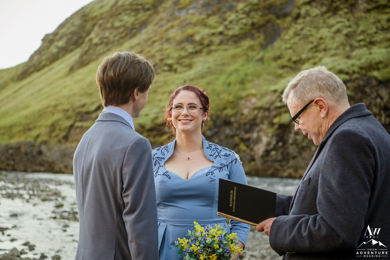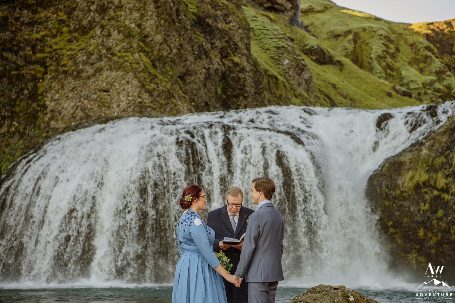 The adventure officially kicked off and everyone was on their way to an offbeat waterfall for the Iceland wedding ceremony. The excitement was high! Upon arrival to the waterfall, they had a nice 5 minute hike to the waterfall. It was there that Pastor Egill performed a moving and inspirational marriage ceremony that was exactly what David and Katy envisioned.