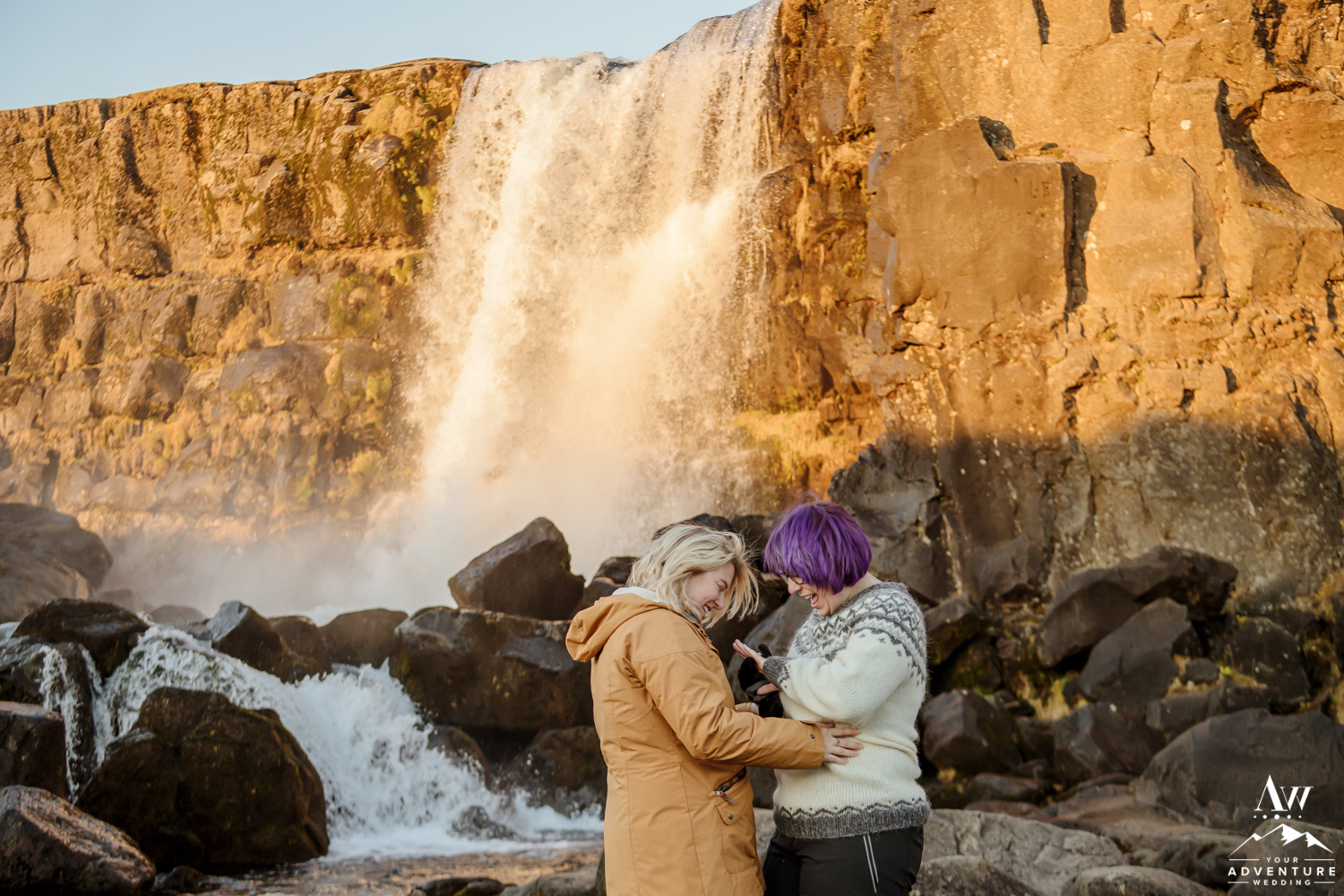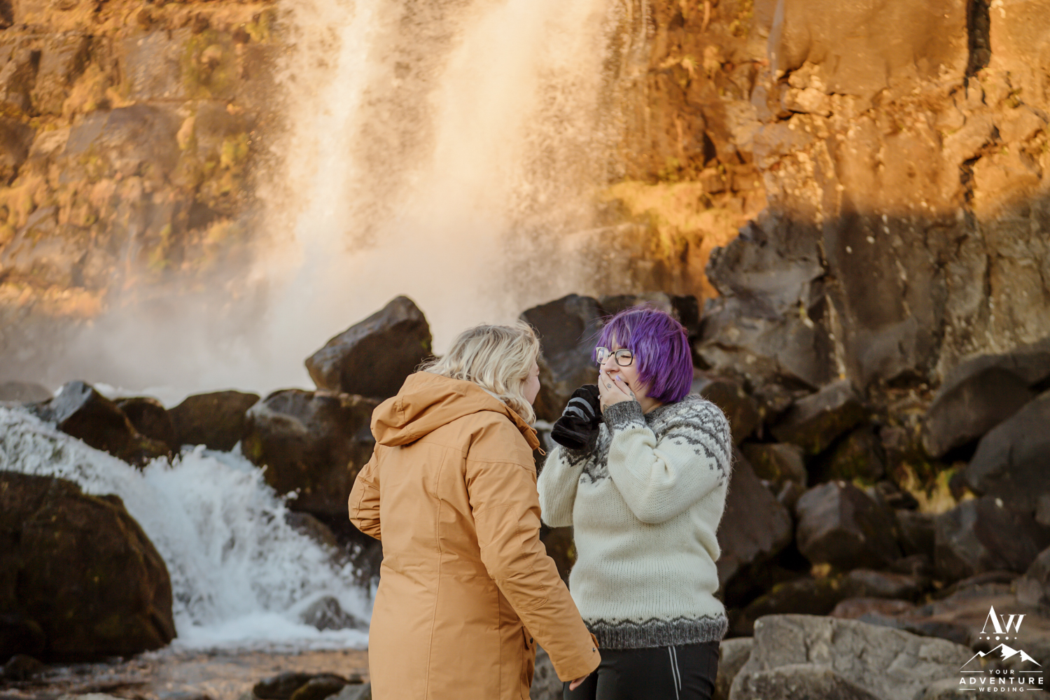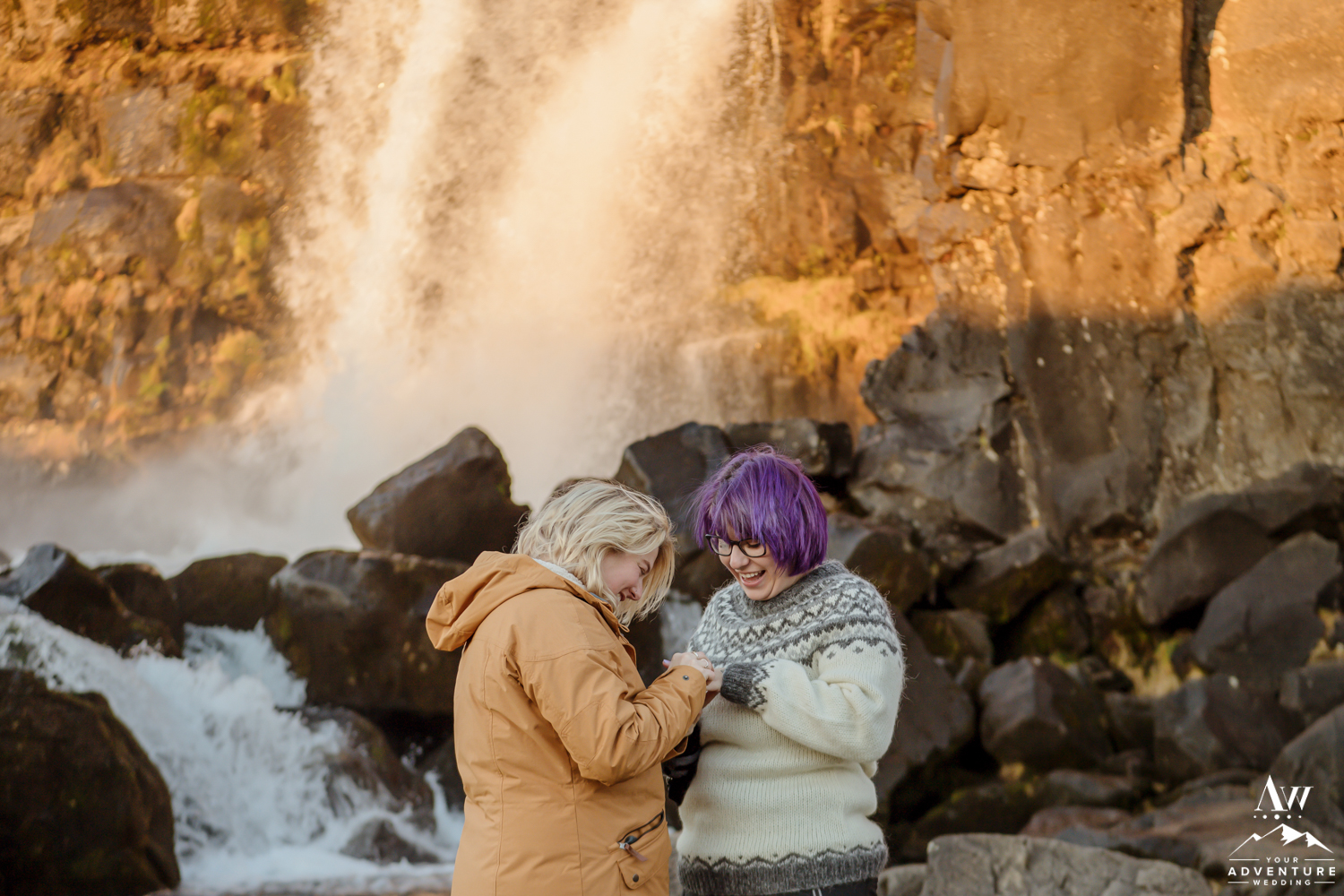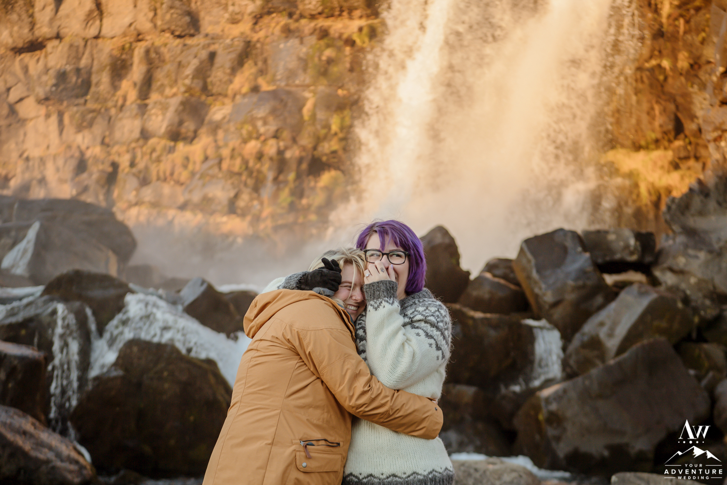 Within Þingvellir National Park, you’ll find Öxarárfoss Waterfall. She sits perfectly between lava rock walls and nearby to the famed tectonic plates. It was meaningful to Jen too I think since she was from the East Coast and Ellie from the West Coast, so it was sort of signifying a coming together too! So now that we had our perfect spot… it was time for Jen to Propose Iceland! Also head over to the fantastic: How She Asked blog (or on our PRESS page) where you’ll read and see more on these two lovelies!