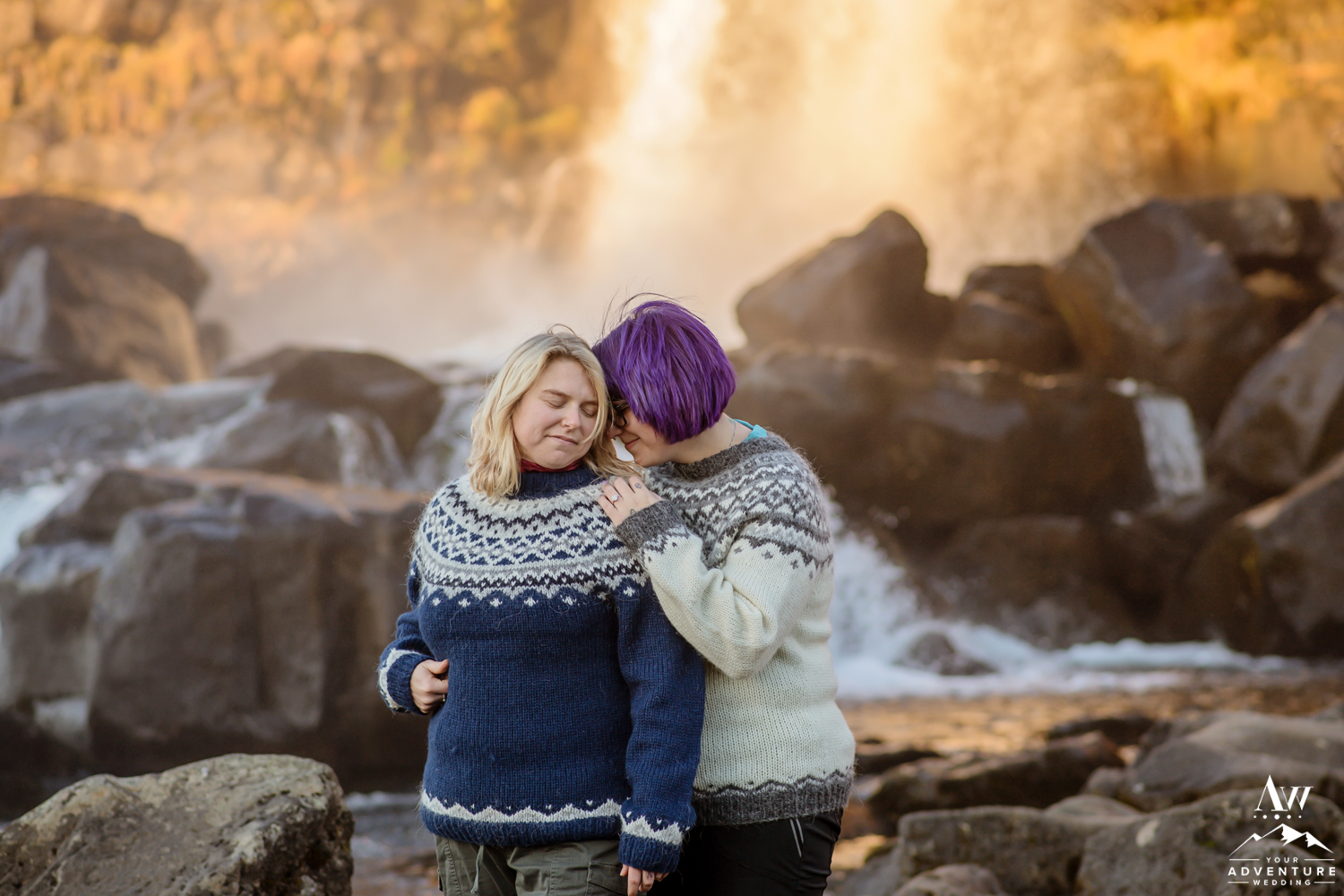It was critical for Jen that our Iceland Wedding Photography team not be seen or have any contact with them until she proposed at Oxararfoss Waterfall.  Mainly because she knows Ellie well enough that she would know something was up.  So it needed to look like Jen just really wanted to witness sunrise from that incredible waterfall.  Jen let our Iceland Wedding Planner team know in advance what they would likely be wearing so as the photographers “acted like tourists” they could forever pause that proposal moment for them.  So with their sweet little Icelandic sweaters and in hiking boots, they made their way to the stunning waterfall …and oh man was it the PERFECT surprise!  ::High Five:: Jen!