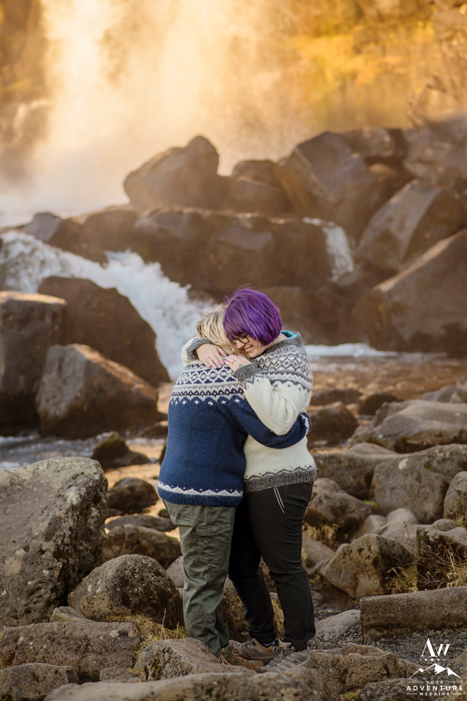 It was critical for Jen that our Iceland Wedding Photography team not be seen or have any contact with them until she proposed at Oxararfoss Waterfall. Mainly because she knows Ellie well enough that she would know something was up. So it needed to look like Jen just really wanted to witness sunrise from that incredible waterfall. Jen let our Iceland Wedding Planner team know in advance what they would likely be wearing so as the photographers “acted like tourists” they could forever pause that proposal moment for them. So with their sweet little Icelandic sweaters and in hiking boots, they made their way to the stunning waterfall …and oh man was it the PERFECT surprise! ::High Five:: Jen!