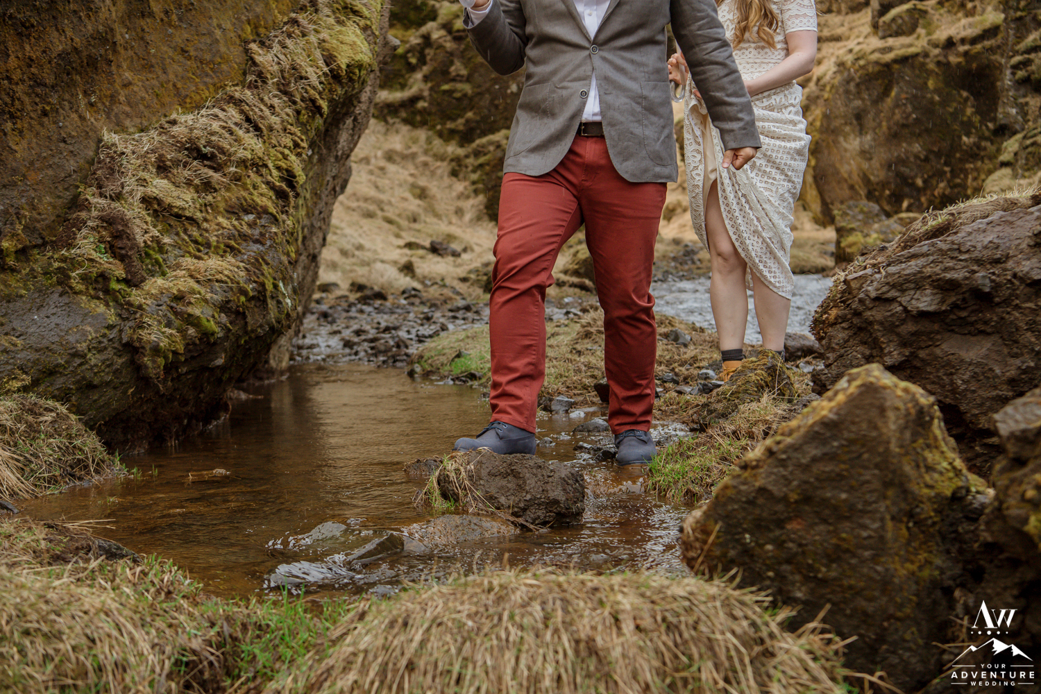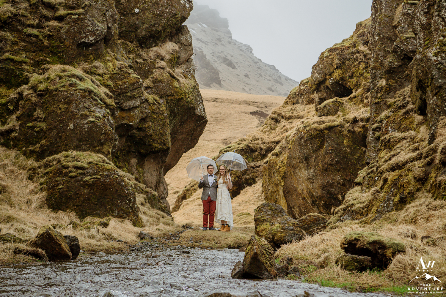 Having an adventure with our Iceland Wedding Planner team, allows you to experience areas of Iceland that most locals do not even know exist! During Yong and Zosia’s wedding day, we had to “plan b” one of our many locations because of weather and flooding. We reserve the right to do this sometimes to ensure the safety of our clients and their guests, also our super jeeps. Given countless options (including several other private waterfall wedding locations) as a “plan b” they chose one of our favorite narrow private canyons to explore with their Iceland wedding guests. It had begun to rain but it just added to the adventure and cuteness with our clear umbrellas!