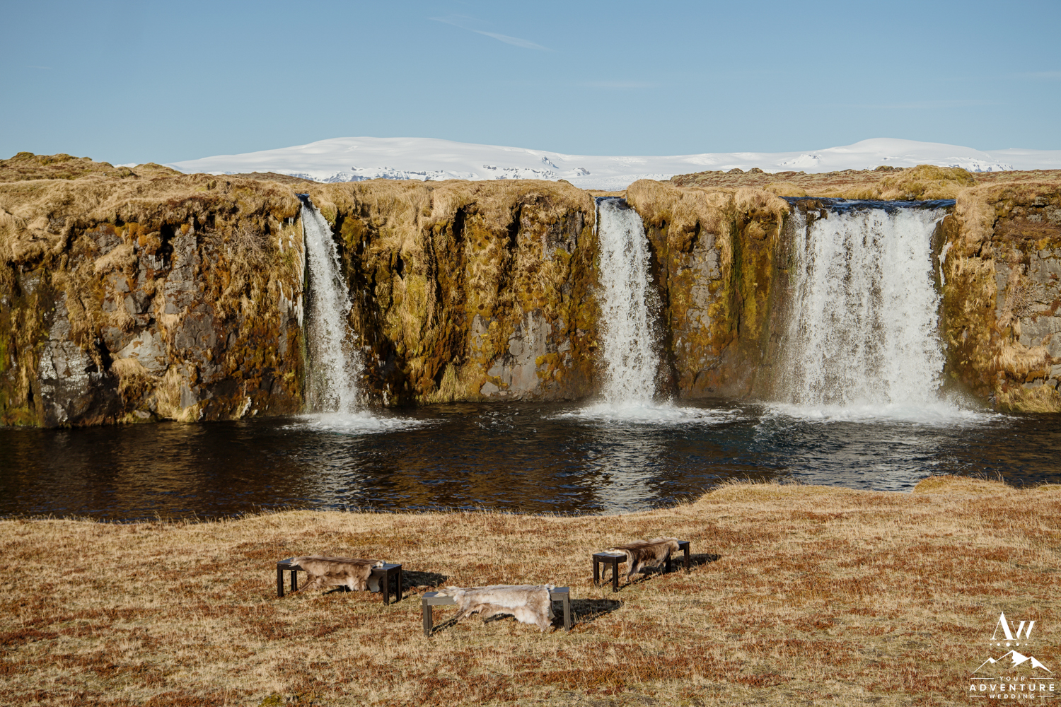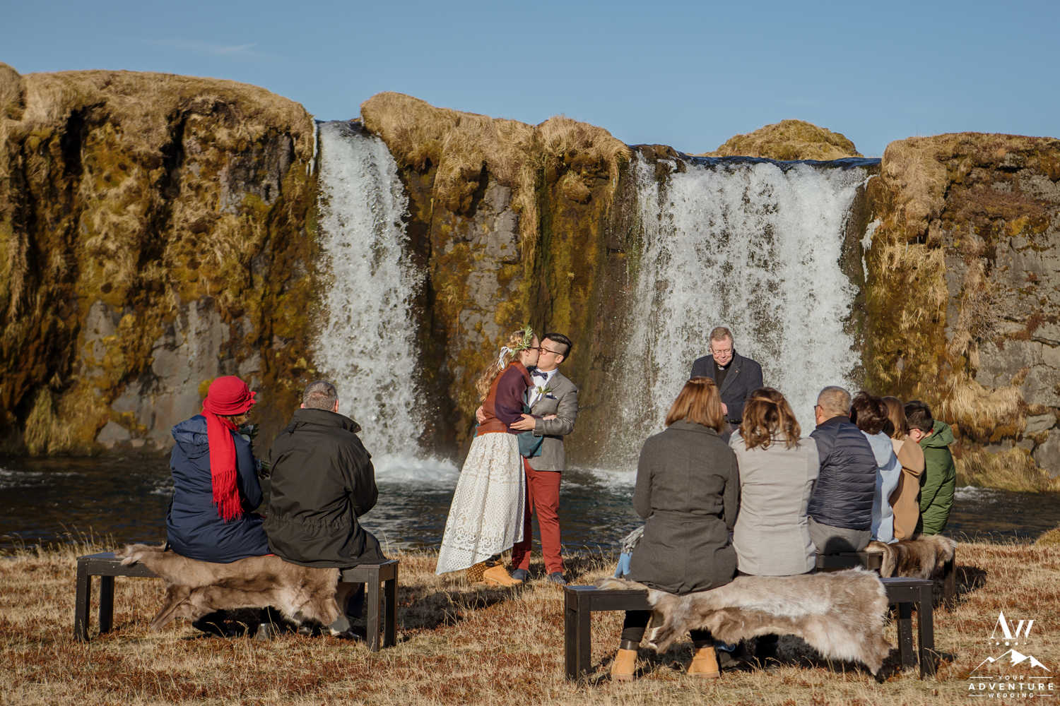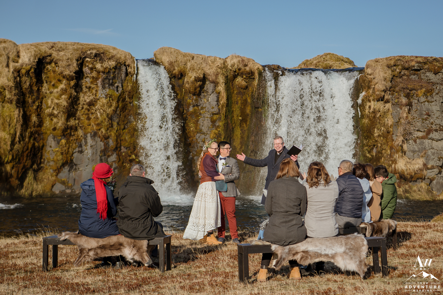 Yong Guck and Zosia, held one of the most intimate Iceland wedding ceremonies we have ever witnessed. The sun was shining, the mountains were sparkling with snow behind the waterfall, and the setup for their ceremony was so sweet! They had rented our fabulous black benches with reindeer furs. To keep the closeness of family feeling during the private waterfall wedding ceremony, our Iceland Wedding Planner team formed a half circle with the benches. Yong and Zosia had wanted a meaningful and sweet ceremony and that is exactly what Pastor Egill created in front of that private waterfall!