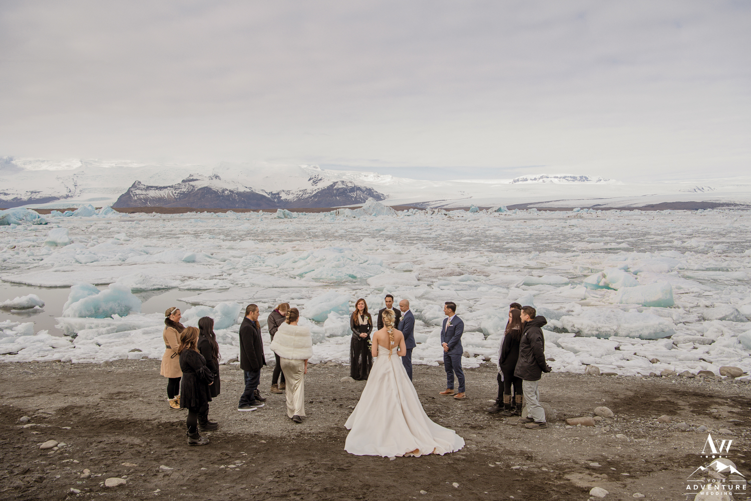 Upon arrival to Jökulsárlón Glacier Lagoon, everyone was all smiles and excited to see where Sam and Mel would say “I do.” The guests gathered together and made the walk to the ceremony spot. It was such a GORGEOUS day! Two of Mel and Sam’s friends actually officiated the ceremony for them (Special note: This was not a legal wedding ceremony in Iceland, only licensed celebrants living in Iceland can perform legal ceremonies). It was a heartfelt personal ceremony their friends created for them which everyone thoroughly enjoyed.