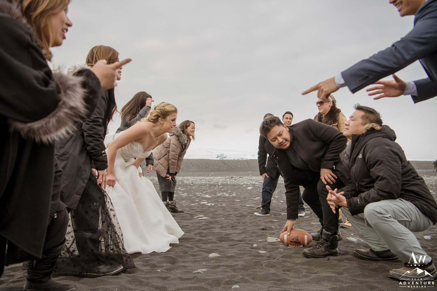 It was important to Sam and Mel that they explore the famed Diamond Beach with their Iceland wedding guests. The beach sparkles in the sunshine just like diamonds (hence the name). Having adventurous wedding photos here is a nice addition to the larger glacier lagoon which can be rather touristy. Afterwards, at the request of their Iceland wedding video team, FilmStrong, Mel and Sam struck up a game of football with each other and their guests, to pay homage to how they met!